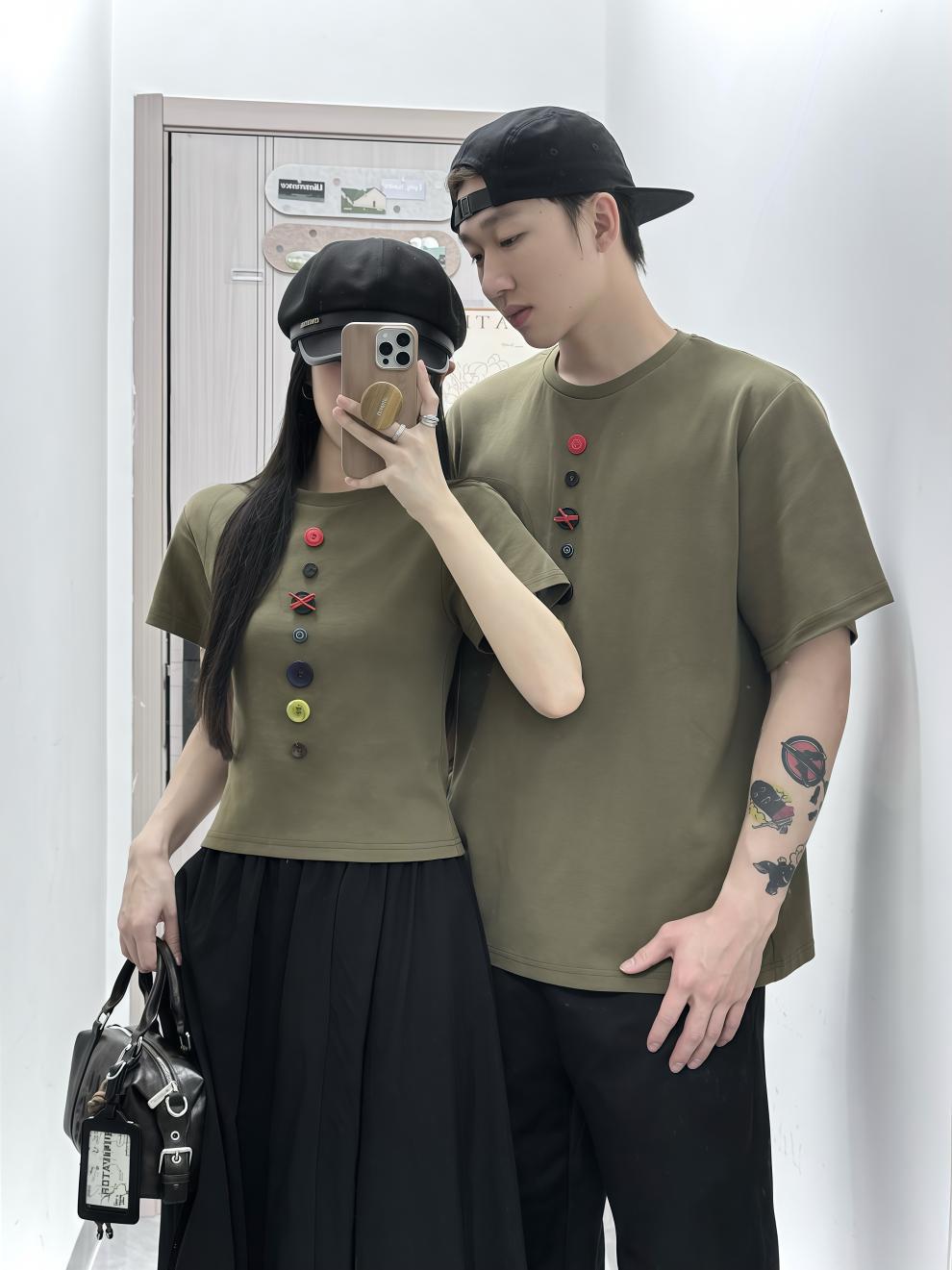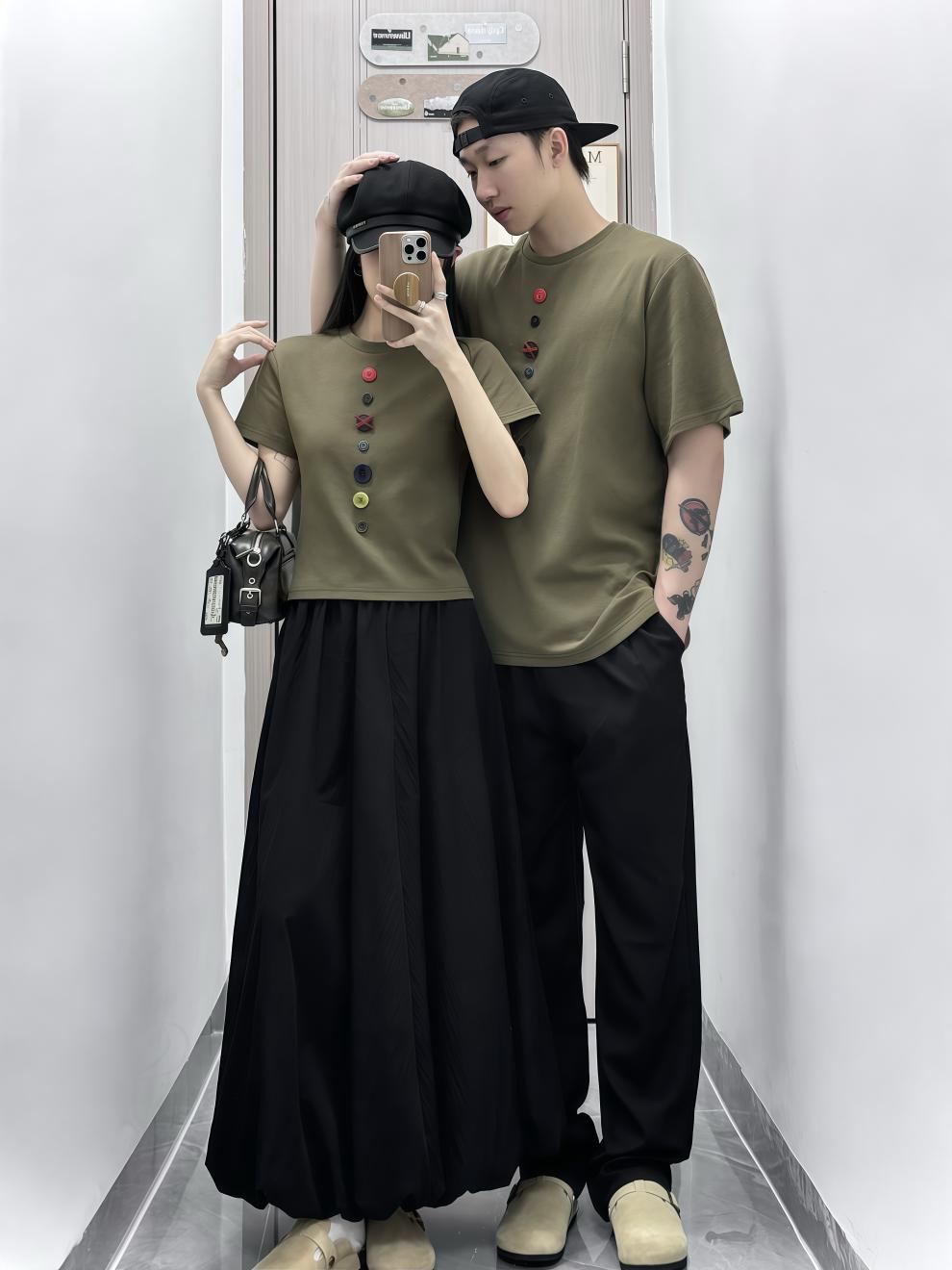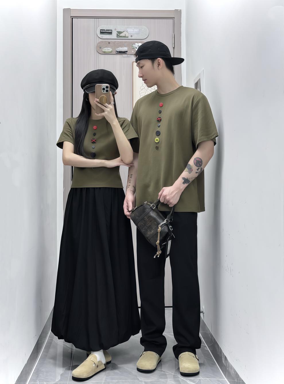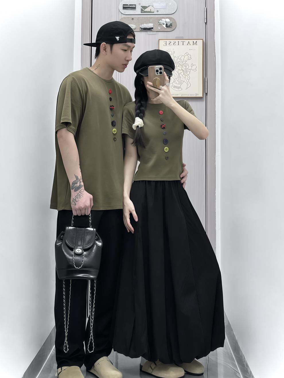 2025 여름 버튼 3 차원 장식 하나의 긴 짧은 어깨 티셔츠 꽃 봉오리 치마 연인 복장