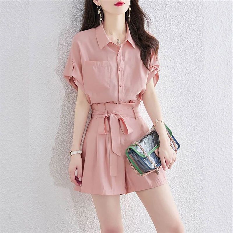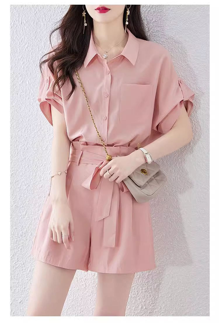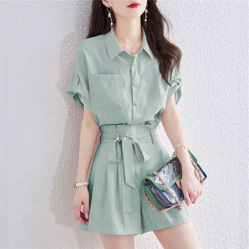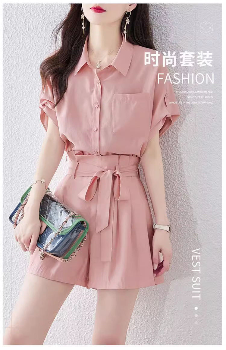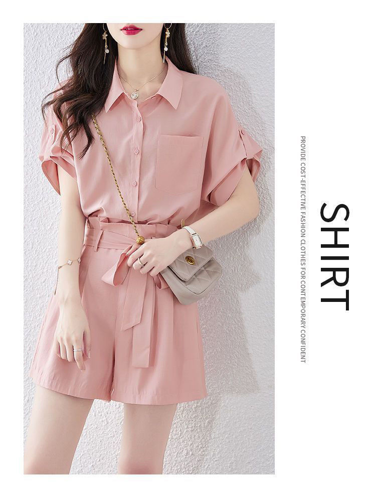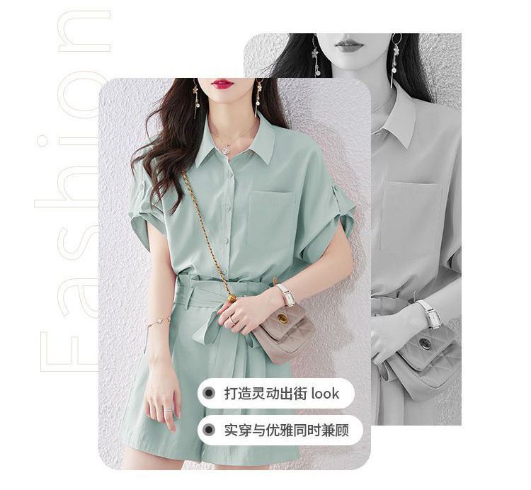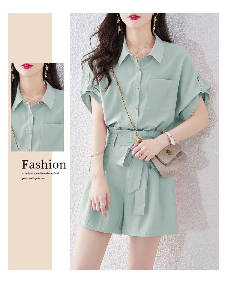[투피스 세트] 기질 반팔 셔츠 여성의 느슨한 셔츠 디자인 감각 높은 허리 넓은 다리 반바지 패션 세트