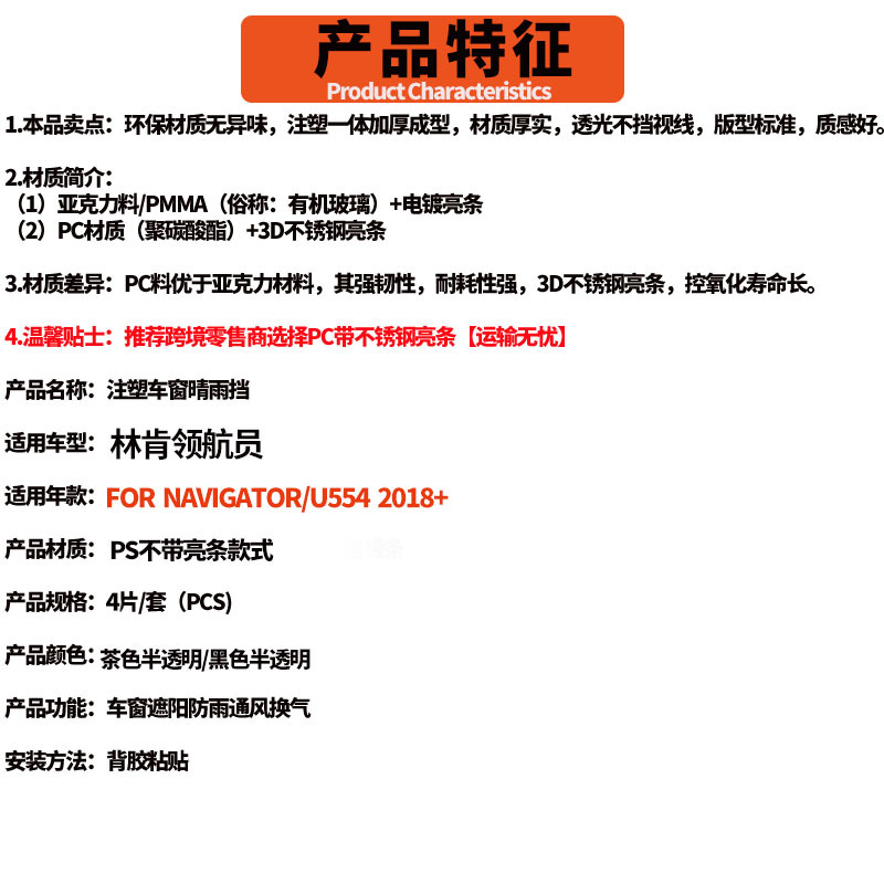 • 링컨 네비게이터 NAVIGATOR U554 2018+ PC(실버 엣지 스트립 창문 비 또는 빛 보호 장치 없음) 4개