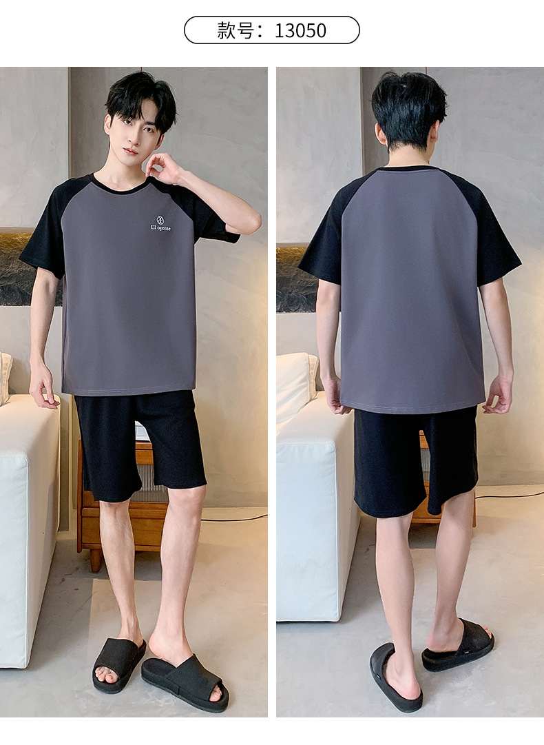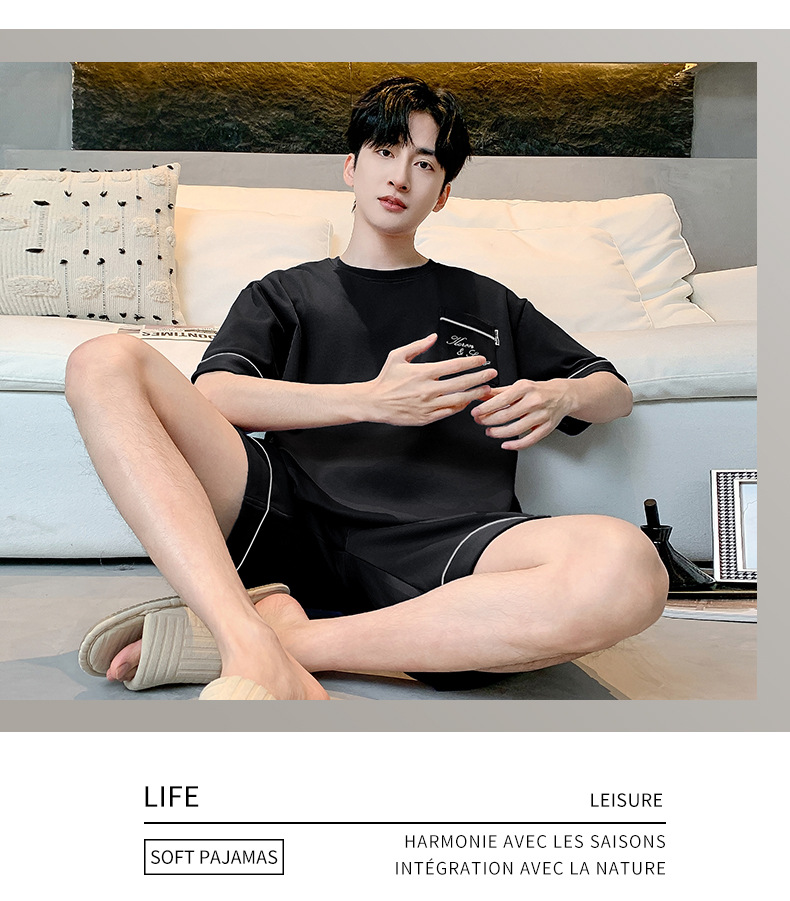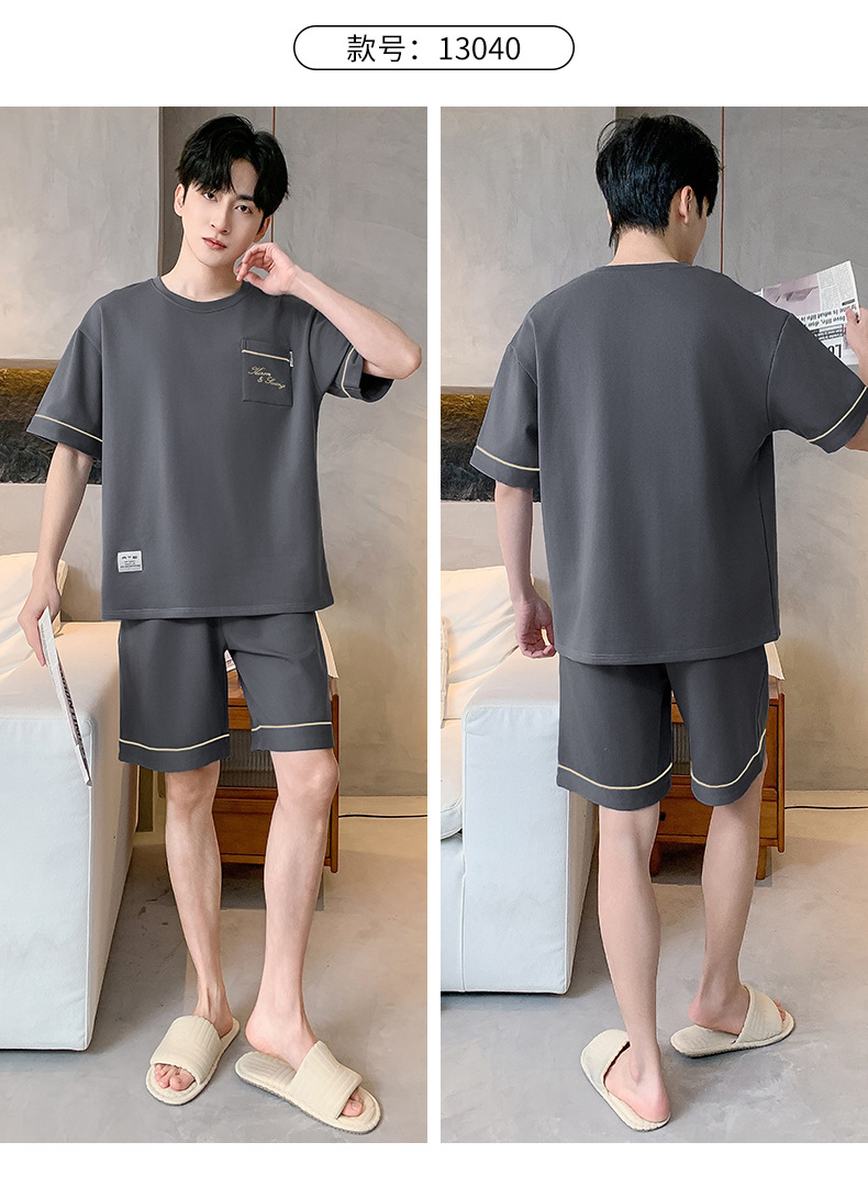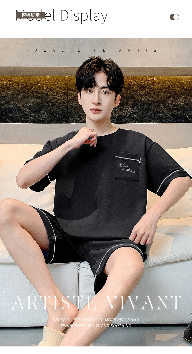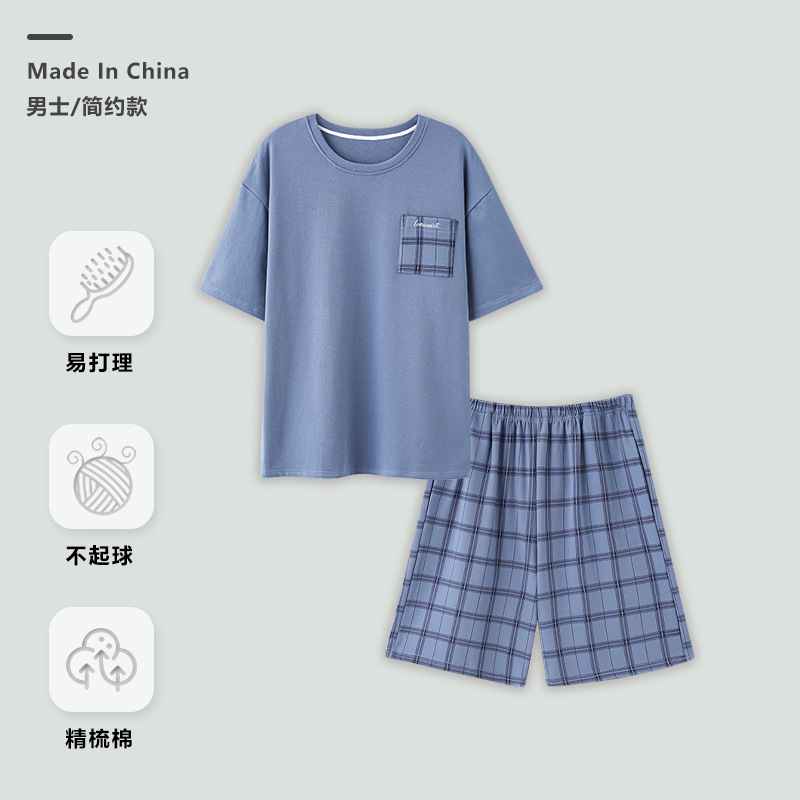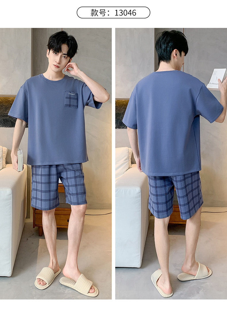 캐주얼 잠옷 남성 봄과 여름 얇은 반팔 쿨 느낌 홈 옷 체크 무늬 플러스 사이즈 반바지 세트 착용 가능