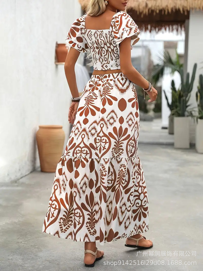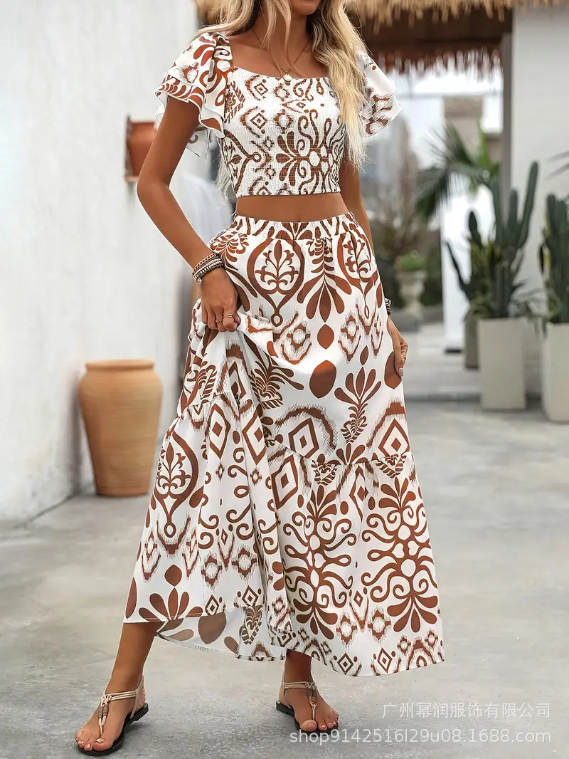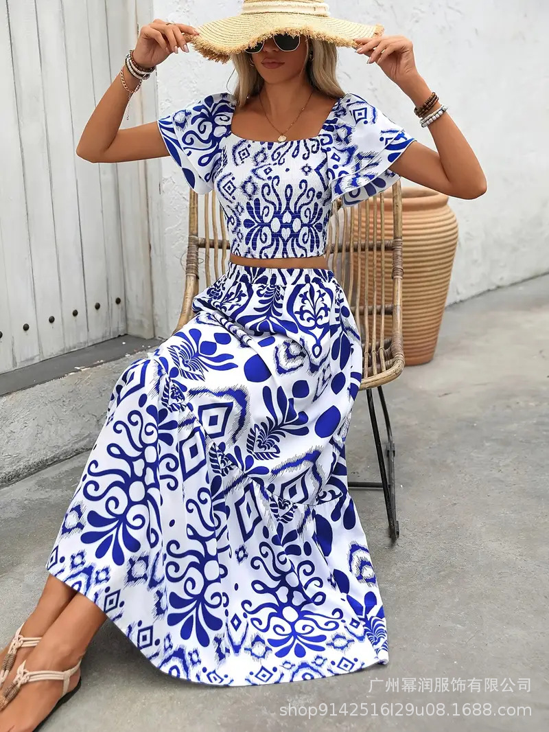 국경 간 TEMU 유럽과 미국 스타일의 여성 여름 인쇄 원피스 매듭 엣지 랩 원피스 휴일 반팔 목 원피스