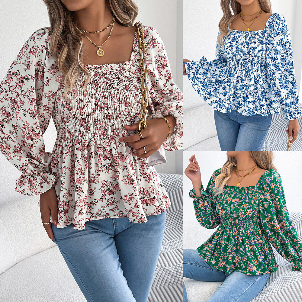 봄과 여름 2025 캐주얼 스퀘어 칼라 벨 슬리브 플로랄 쉬폰 셔츠 휴가 탑 아마존 크로스 국경 여성 의류스토어 가기