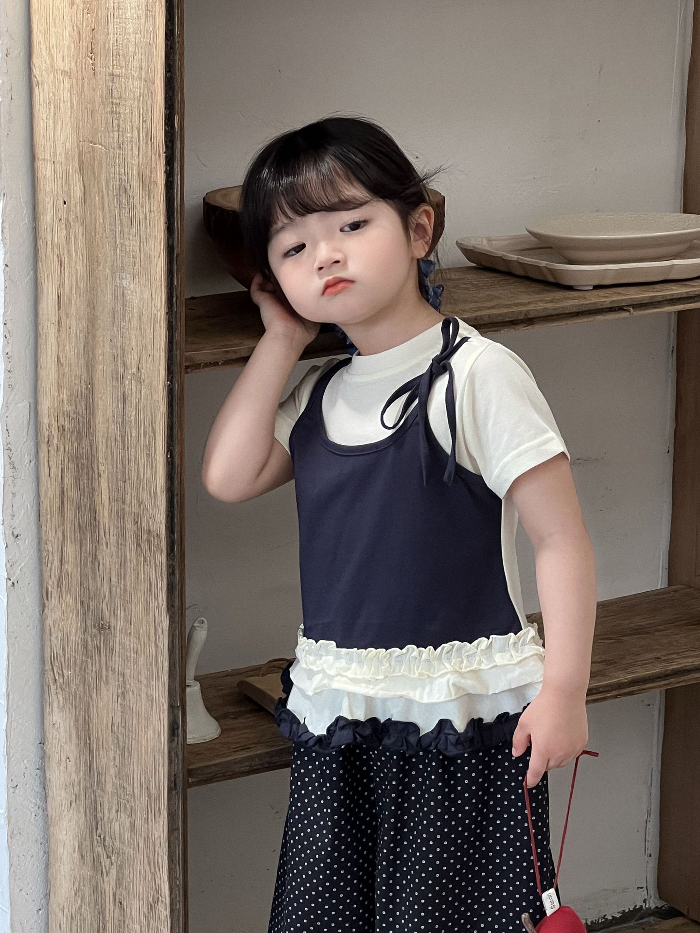 2025 년 여름 신예 소녀 반팔 T-여자 어린이 가짜 투피스 곰팡이 레이스 티셔츠 폴로 닷 바지 한국식 세트