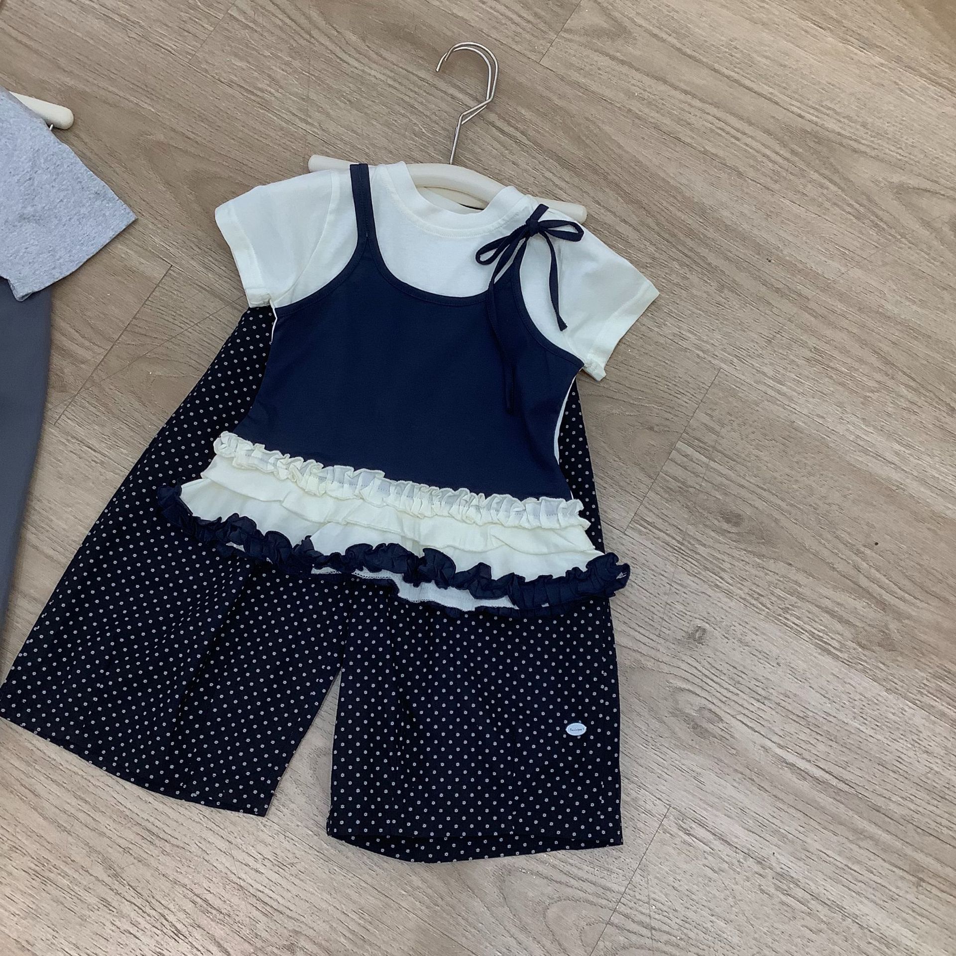 2025 년 여름 신예 소녀 반팔 T-여자 어린이 가짜 투피스 곰팡이 레이스 티셔츠 폴로 닷 바지 한국식 세트스토어 가기