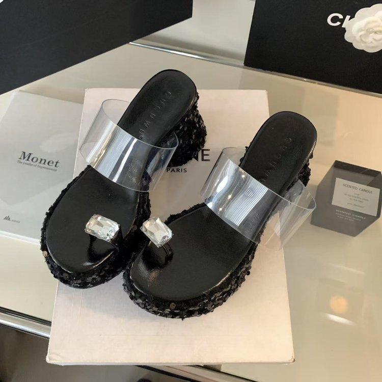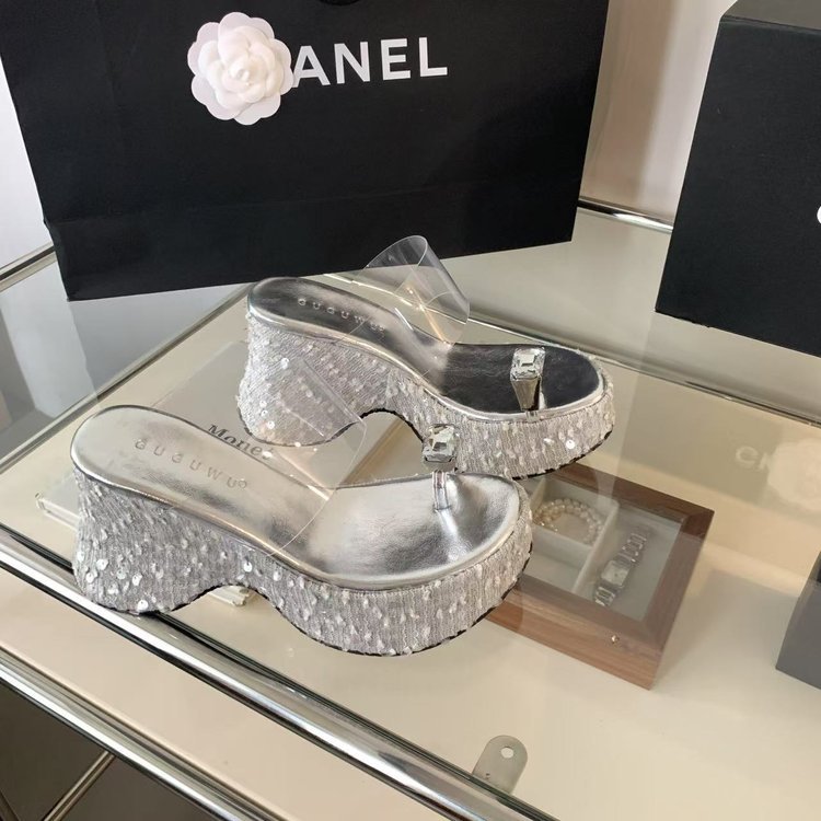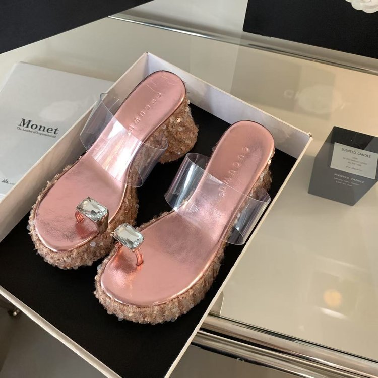 작은 높이 슈퍼 하이힐 라인스톤 플래시 시퀀스 여성 여름 웨지 힐 투명 플랫폼 하단 두꺼운 샌들스토어 가기