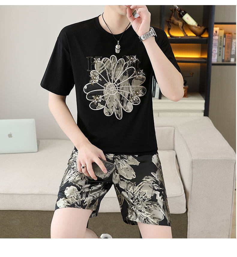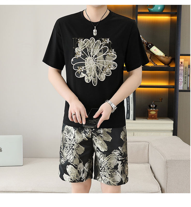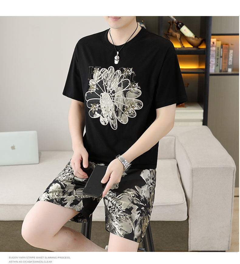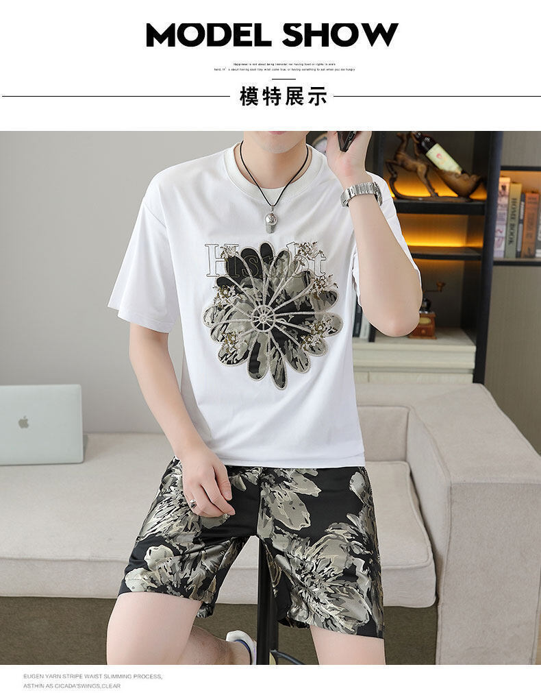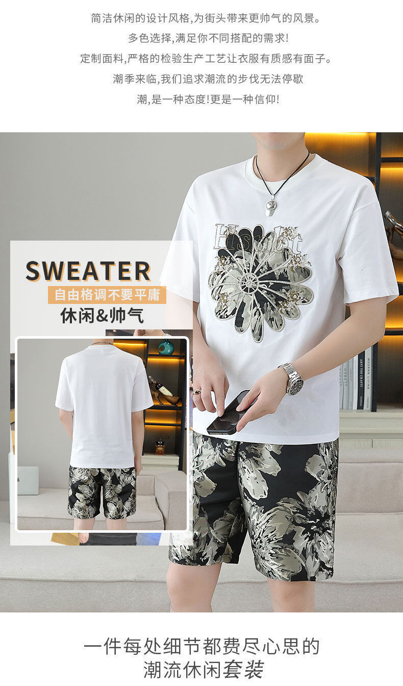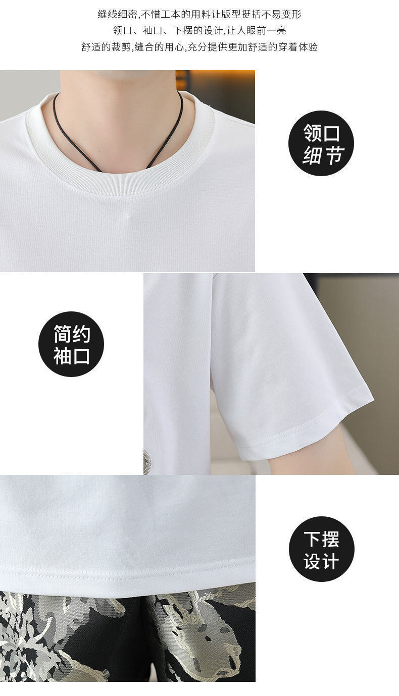 유럽식 여름 새 티셔츠 세트 남성용 무거운 드릴링 말 캐주얼 스포츠 반바지 둥근 목 짧은 소매 세트