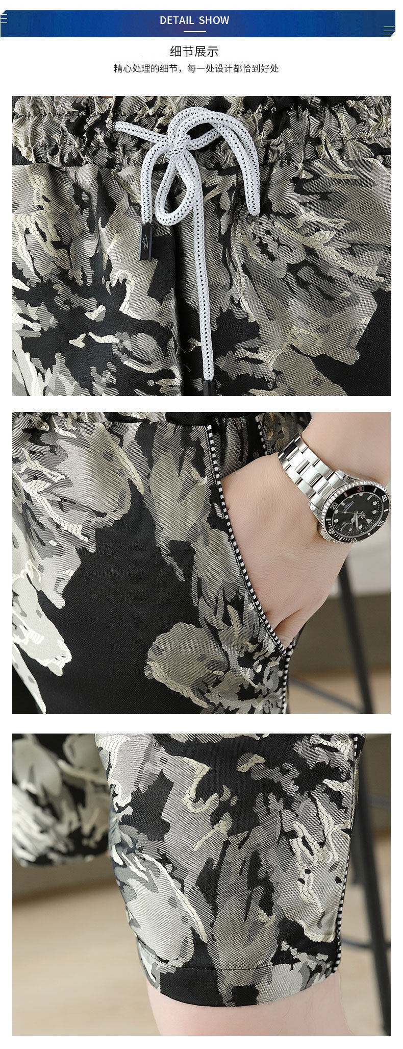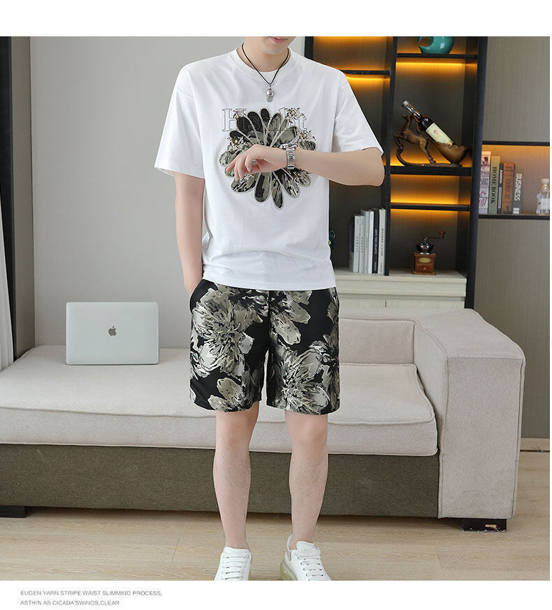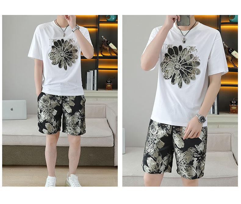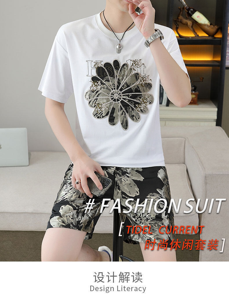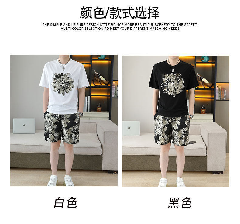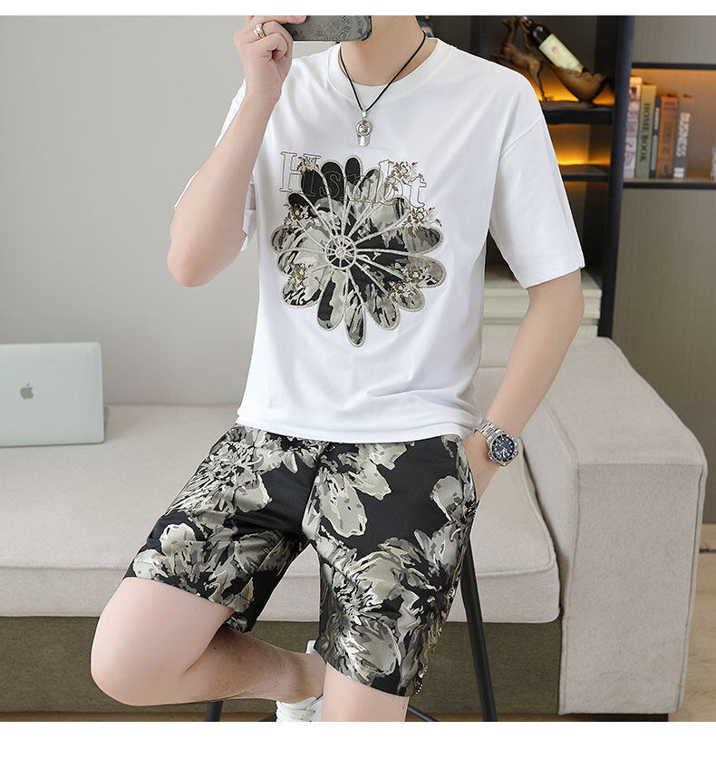 유럽식 여름 새 티셔츠 세트 남성용 무거운 드릴링 말 캐주얼 스포츠 반바지 둥근 목 짧은 소매 세트