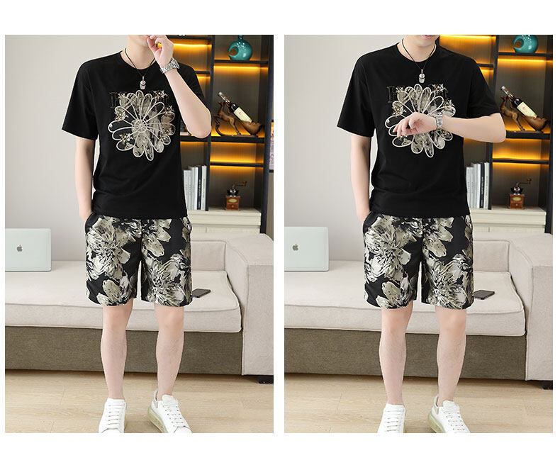 유럽식 여름 새 티셔츠 세트 남성용 무거운 드릴링 말 캐주얼 스포츠 반바지 둥근 목 짧은 소매 세트스토어 가기