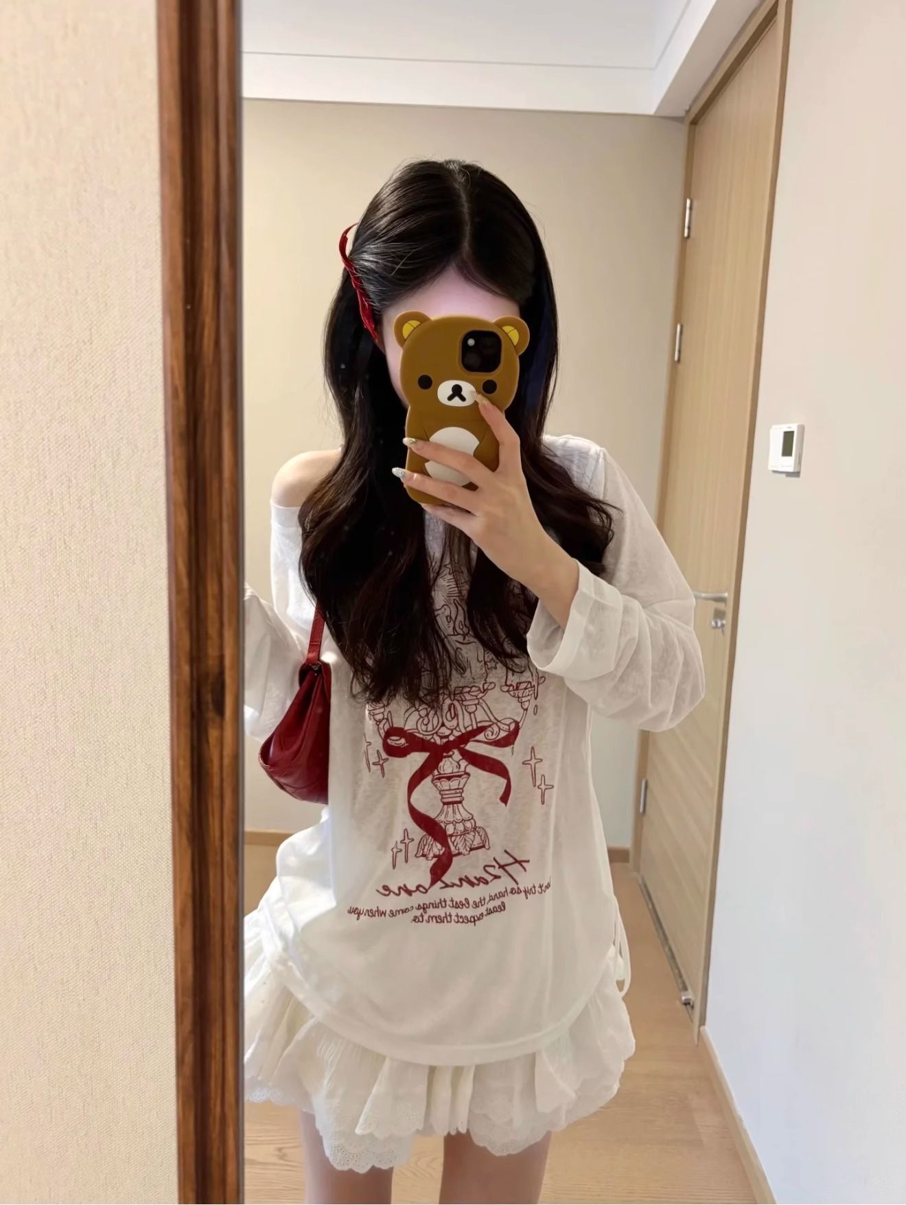 달콤한 스파이스 소녀 낙서 인쇄 흰색 오비큐 오프 숄더 긴팔 블라우스 티셔츠 여성용 여름 디자인 센스 니치 드로우 스트링 탑스토어 가기