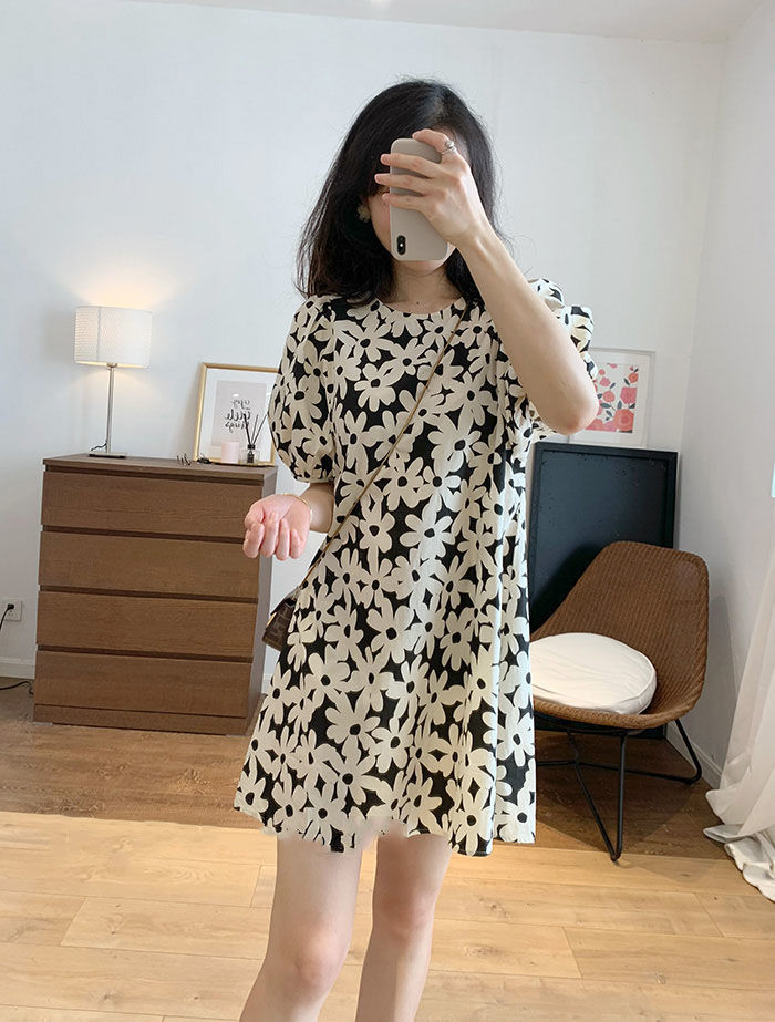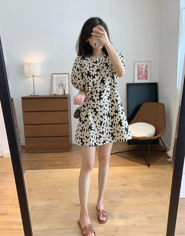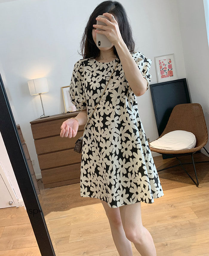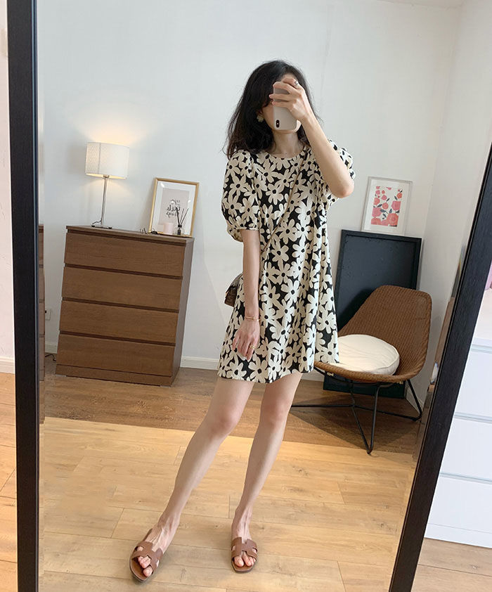 여성을위한 크로스 보더 레트로 연령 감소 프린트 드레스 여름 새로운 프렌치 스위트 퍼프 슬리브 루즈 슬리밍 A 라인 스커트 i스토어 가기