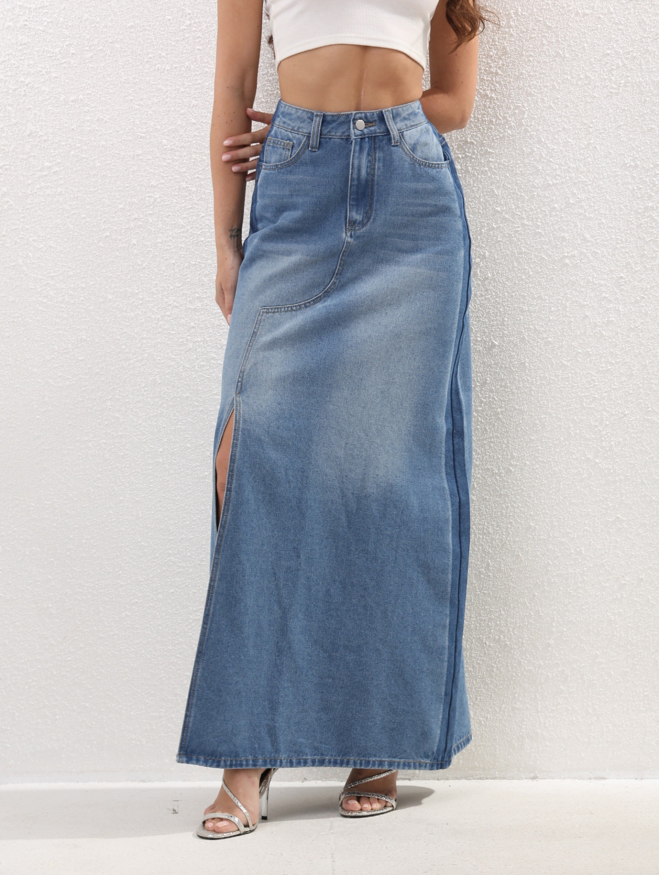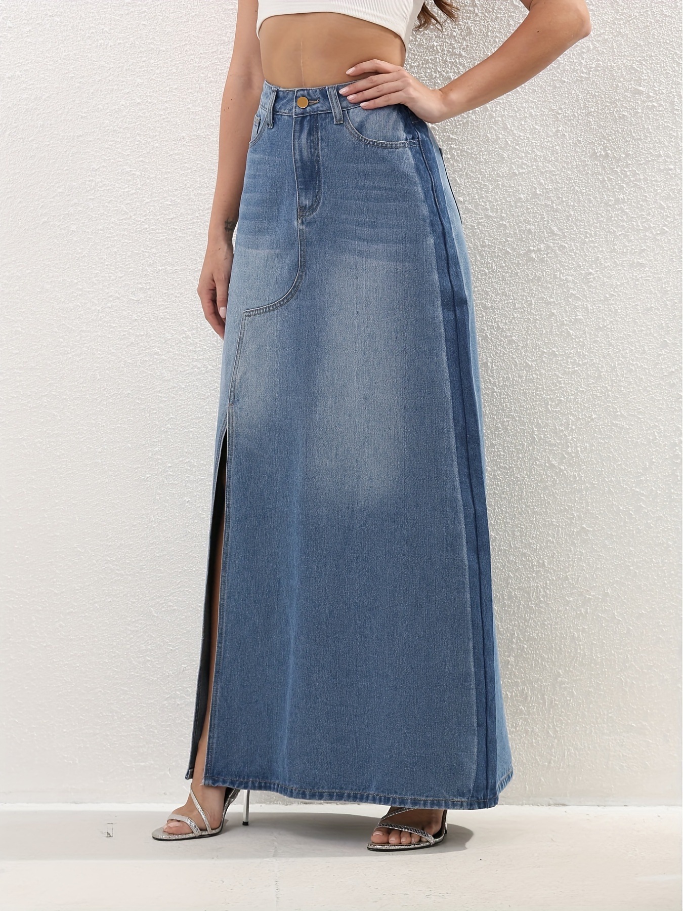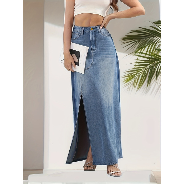 국경을 넘나드는 유럽과 미국의 데님 스커트 새로운 스타일의 하이웨이스트 슬리밍 다용도 중간 길이 틈새 슬릿 하프 길이 스커트
