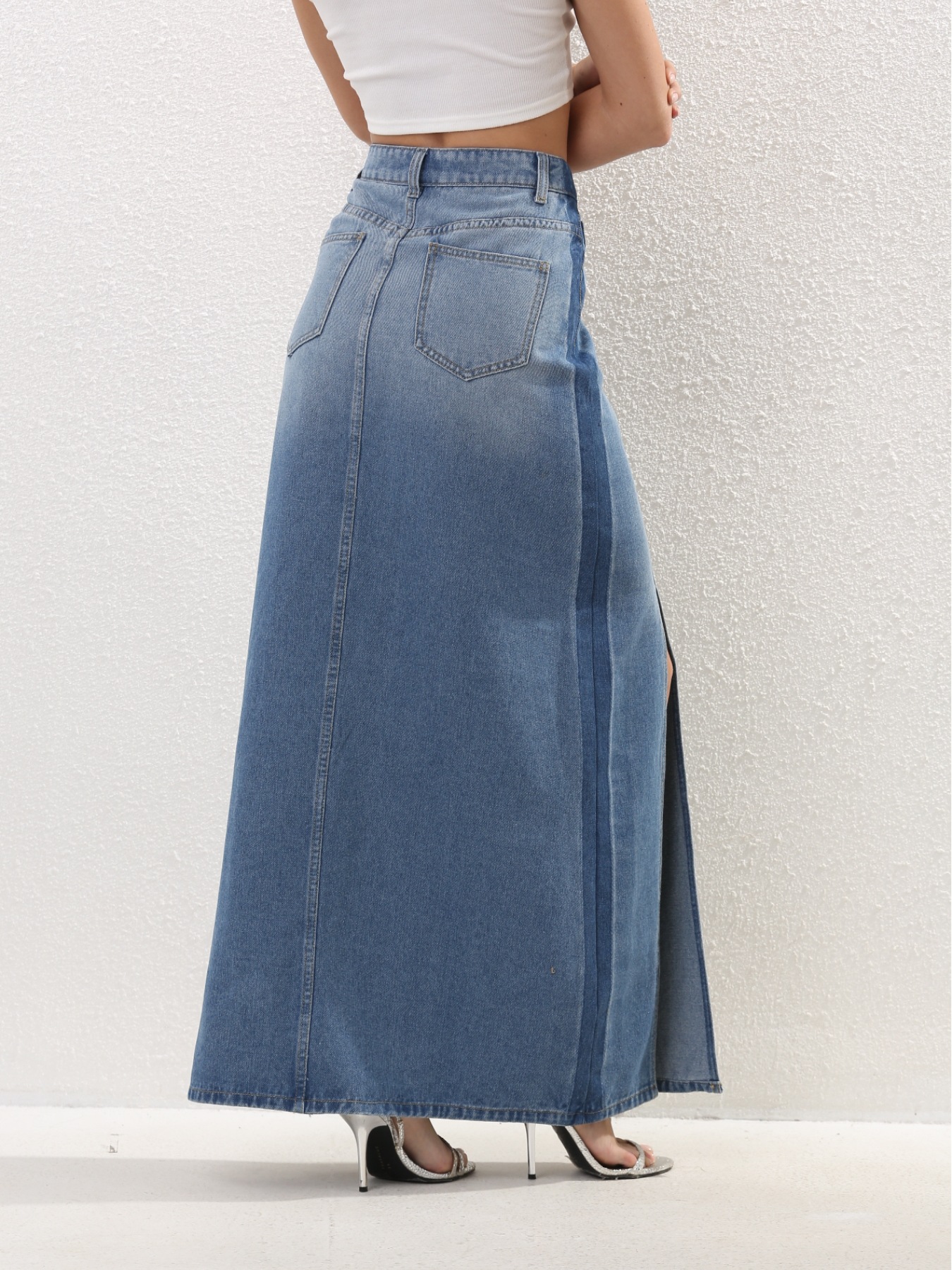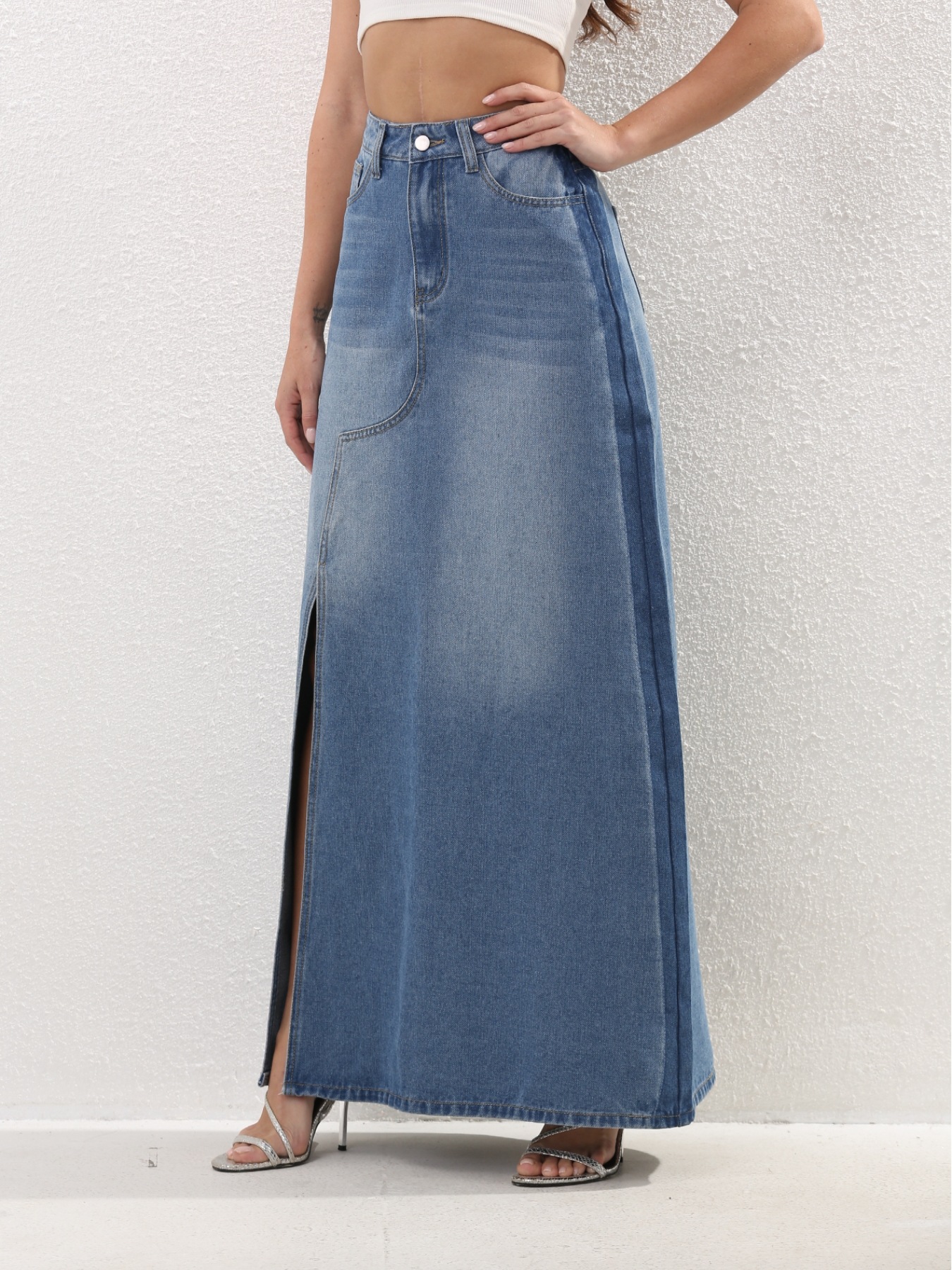국경을 넘나드는 유럽과 미국의 데님 스커트 새로운 스타일의 하이웨이스트 슬리밍 다용도 중간 길이 틈새 슬릿 하프 길이 스커트스토어 가기