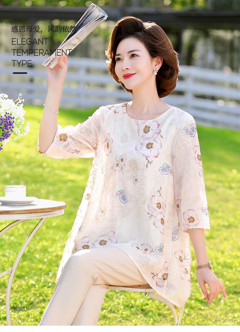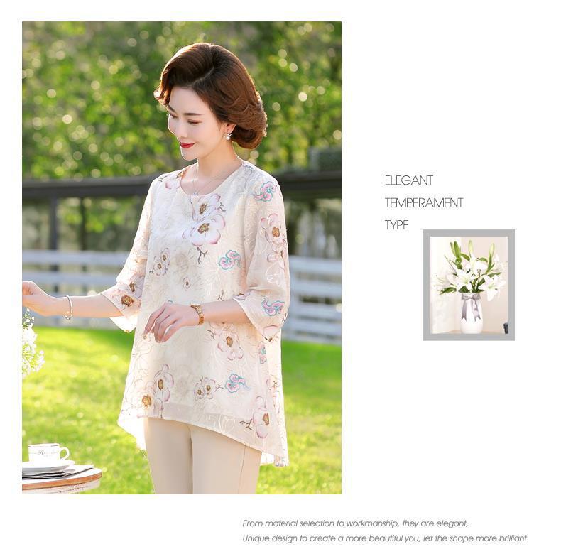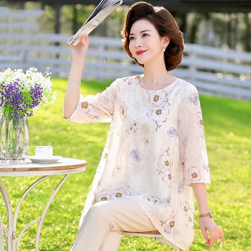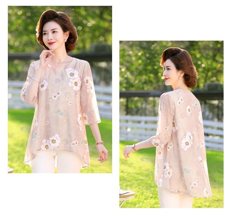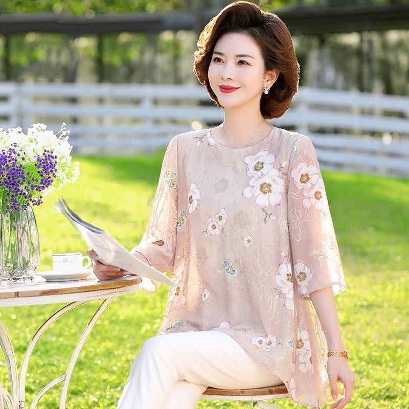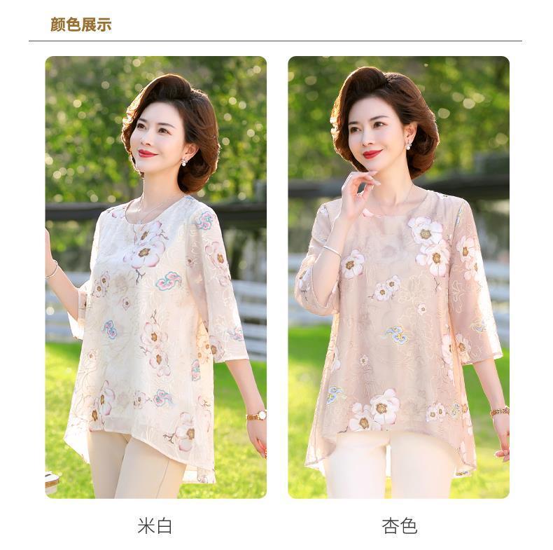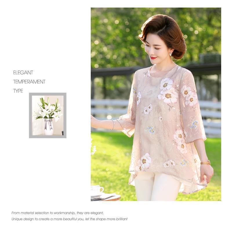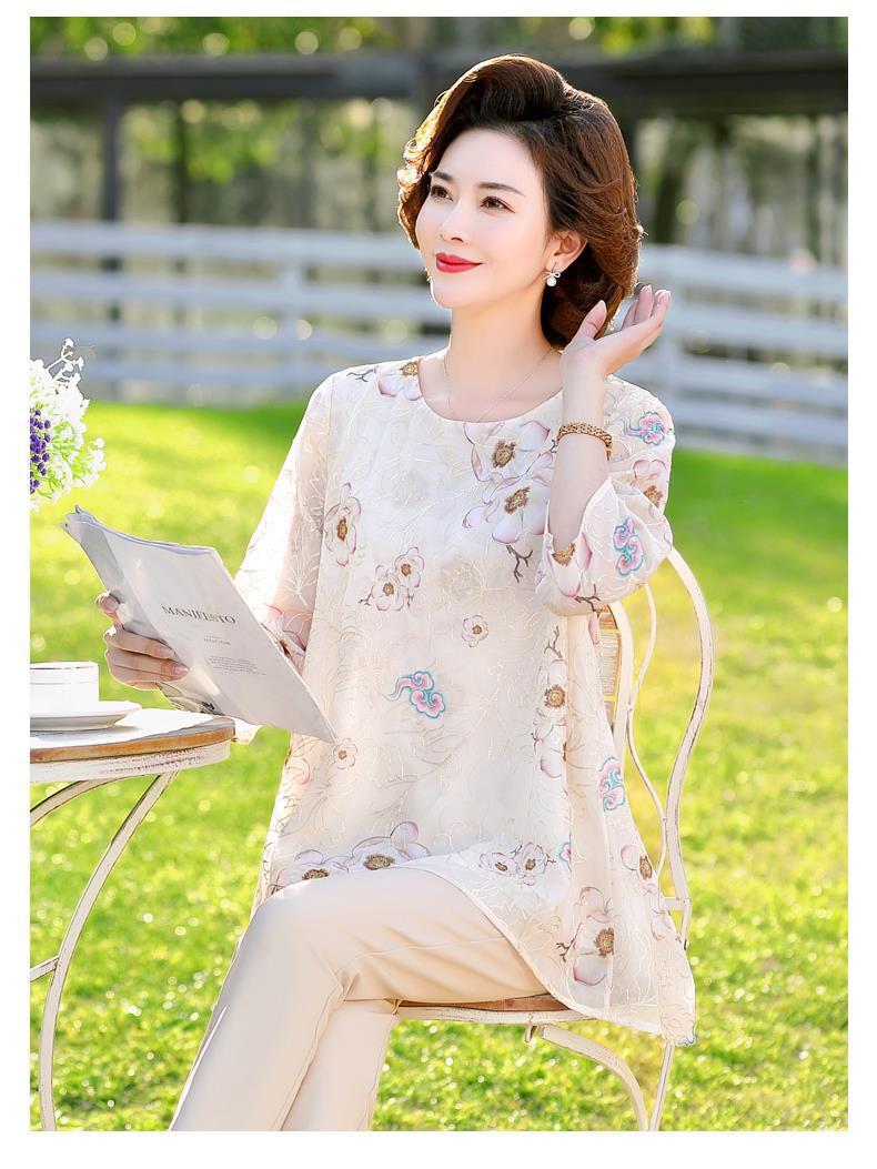 45-110kg 엄마 라운드 넥 쉬폰 셔츠 탑 메쉬 자수 느슨한 여름 살 커버 한국 스타일 프린트 셔츠 여성용스토어 가기
