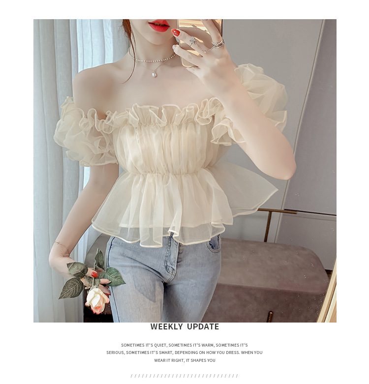 여성용 어깨 쉬폰 셔츠 여름 뜨거운 소녀 디자인 니치 프렌치 퍼프 슬리브 스위트 쇼트 탑