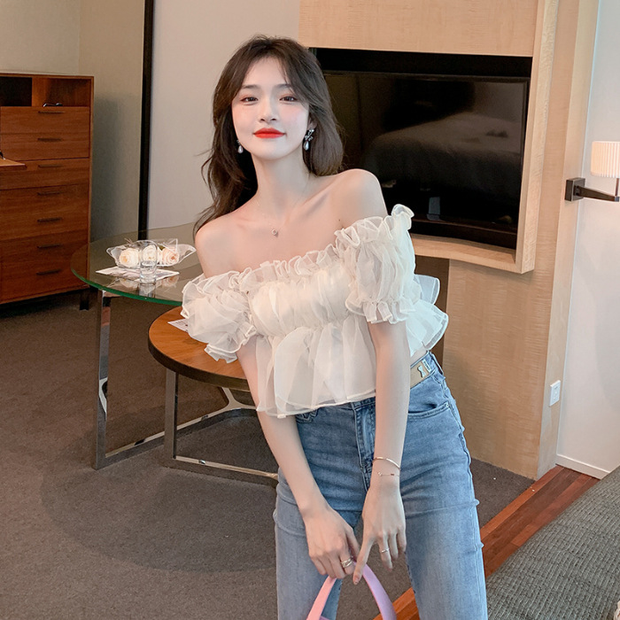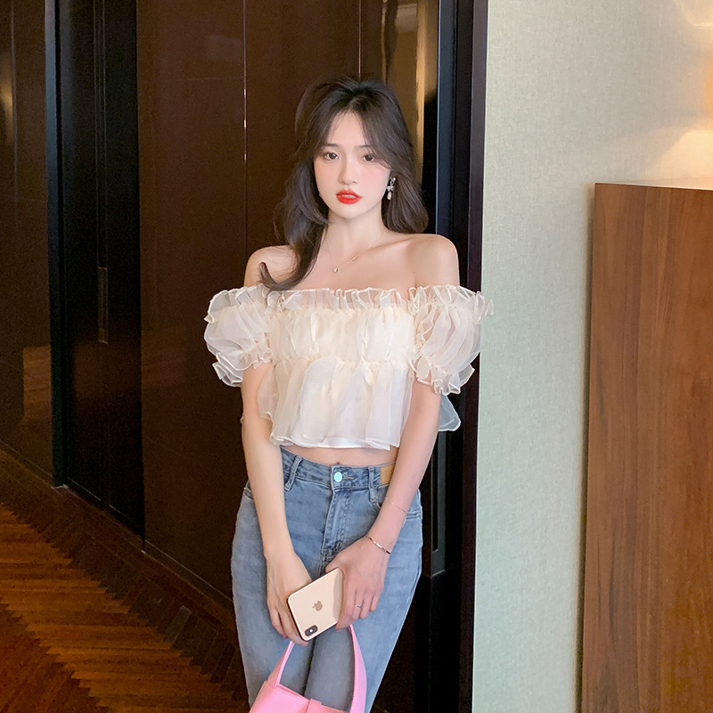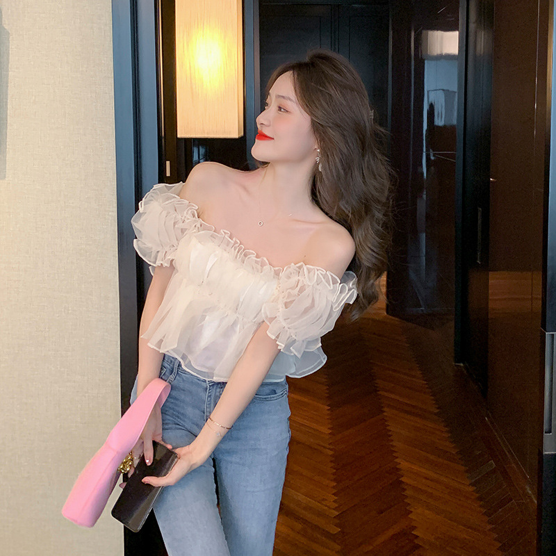 프렌치 스위트 원 숄더 쉬폰 셔츠 2025 여름 시크하고 고급스러운 퍼프 슬리브 슬리밍 쇼트 탑스토어 가기