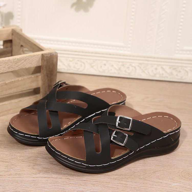 유럽과 미국의 국경 간 플러스 사이즈 쐐기 슬리퍼 여성 2025 새로운 스타일의 물고기 입 두꺼운 바닥 패션 벨트 버클 한 단어 샌들과 슬리퍼