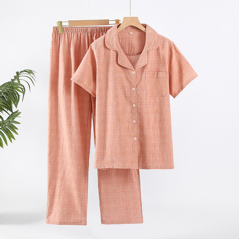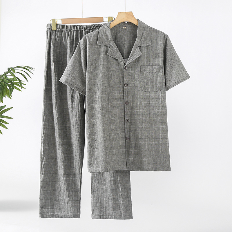 봄과 여름 순수 코튼 워시 코튼 다크 체크 라펠 커플 남성과 여성 반팔 바지 라펠 카디건 잠옷 홈웨어