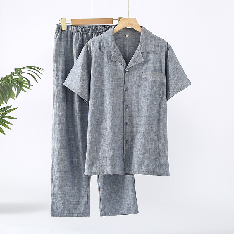 봄과 여름 순수 코튼 워시 코튼 다크 체크 라펠 커플 남성과 여성 반팔 바지 라펠 카디건 잠옷 홈웨어스토어 가기