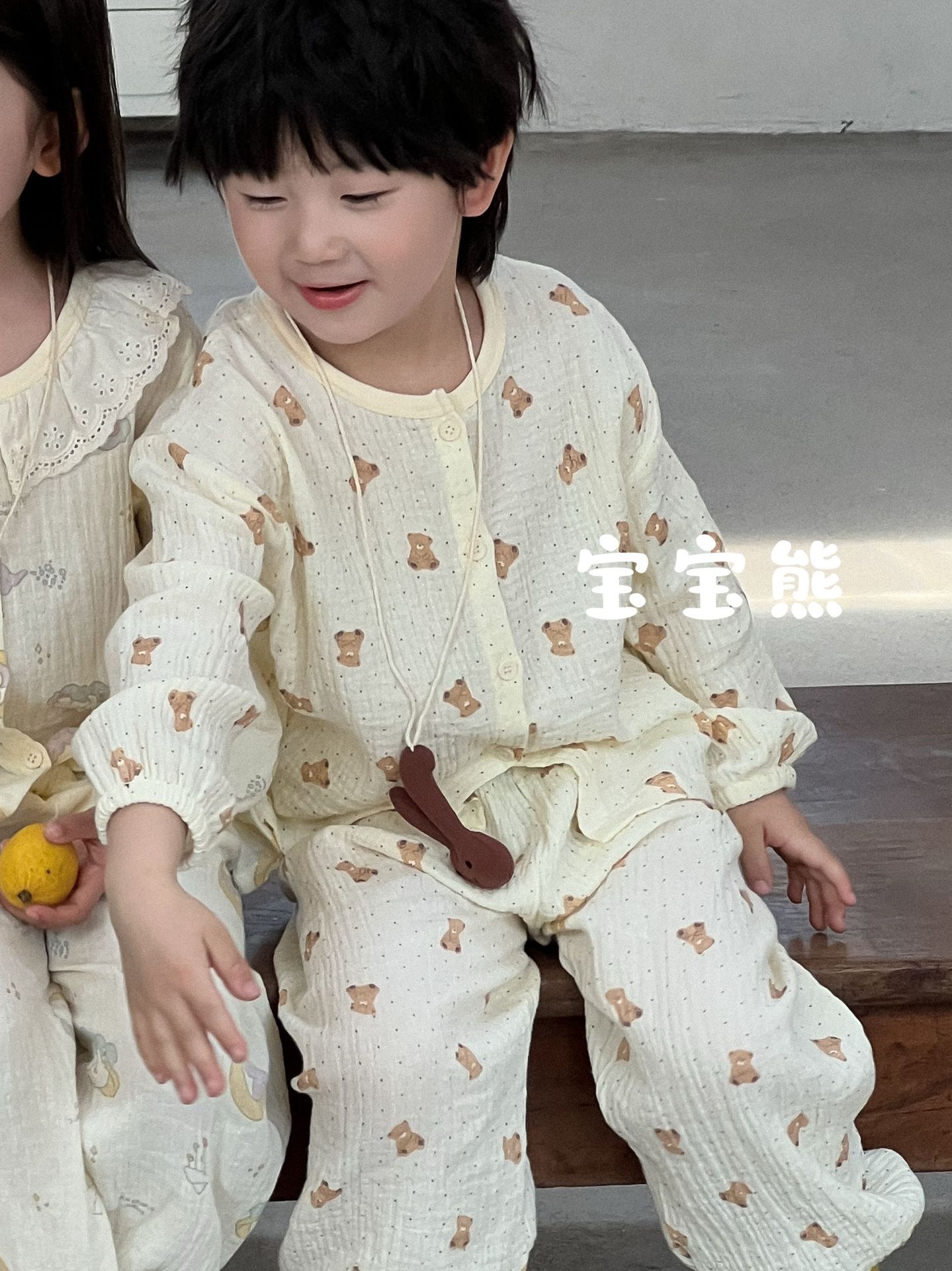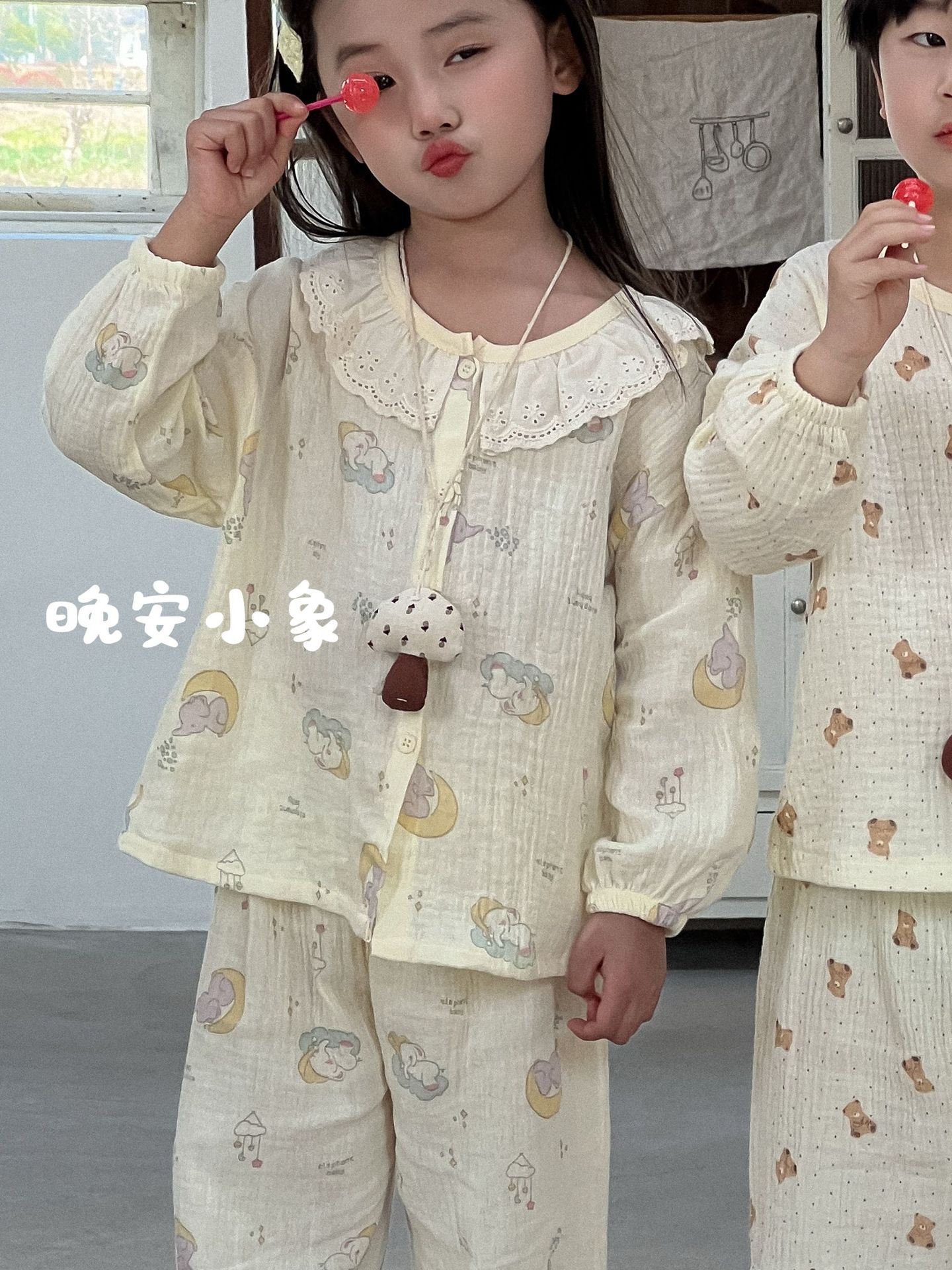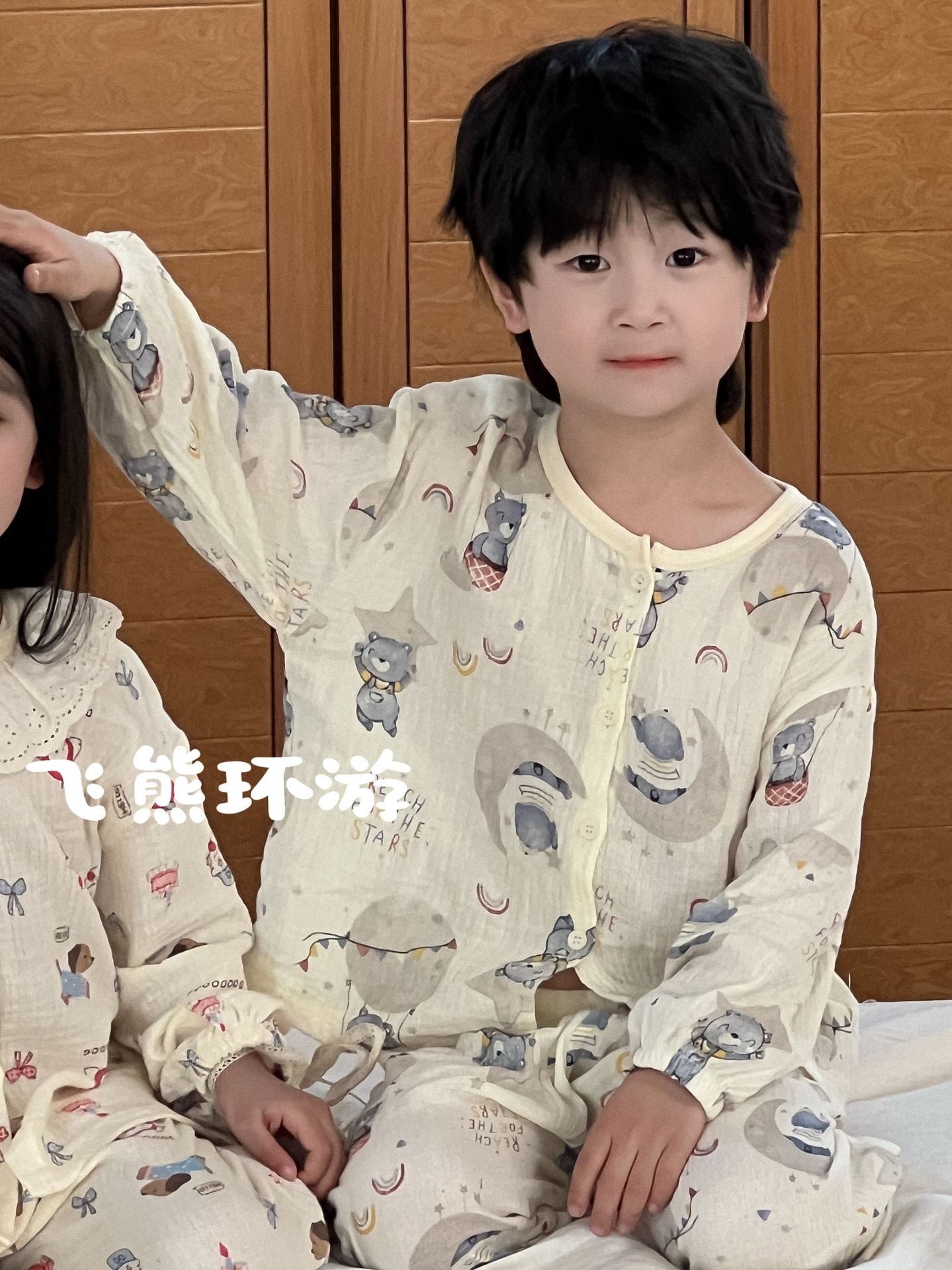 어린 이용 면사 잠옷 세트 봄과 여름 만화 홈 옷 새로운 남성과 여성의 보물 더블 거즈 에어컨 긴 소매스토어 가기