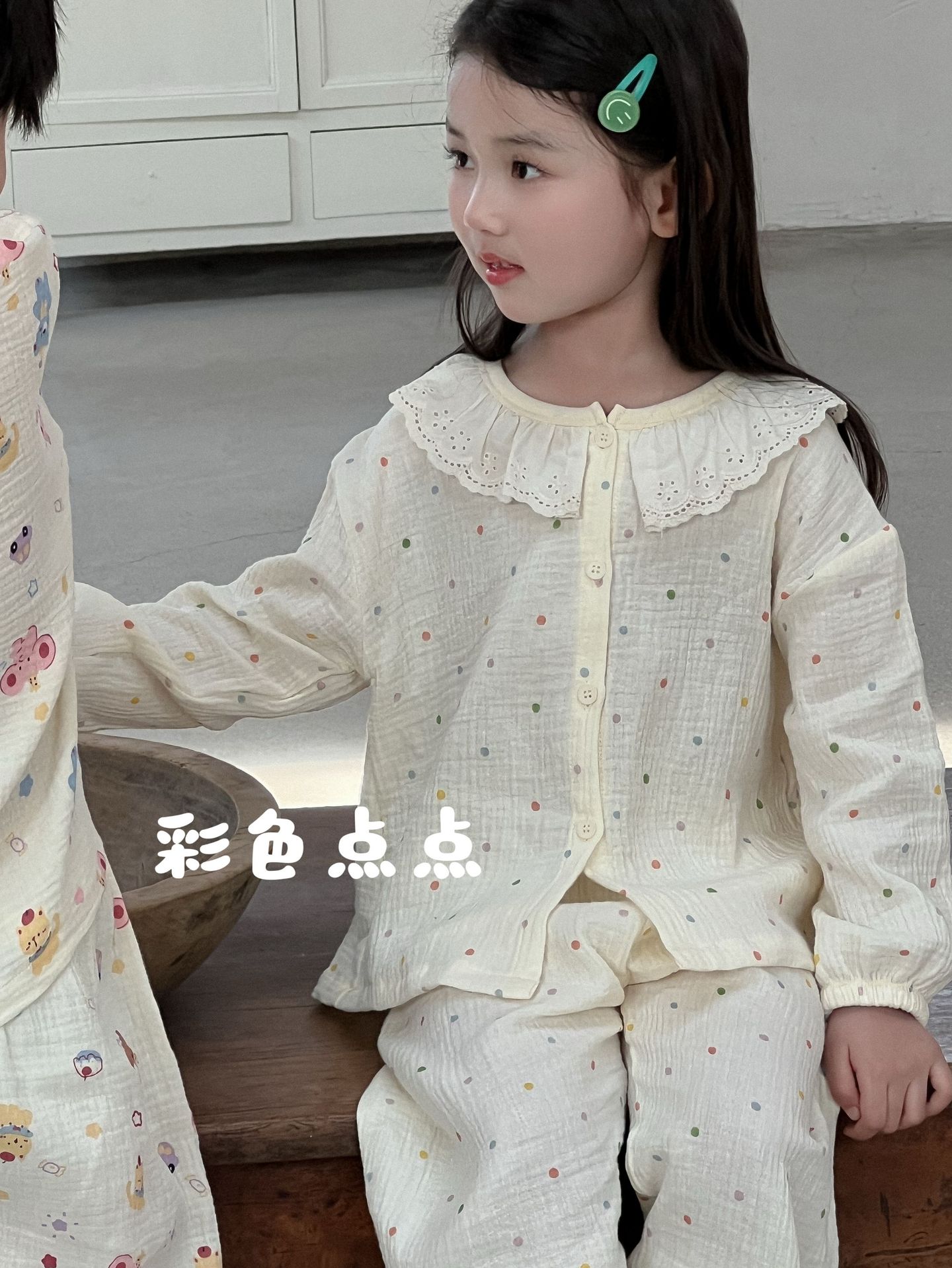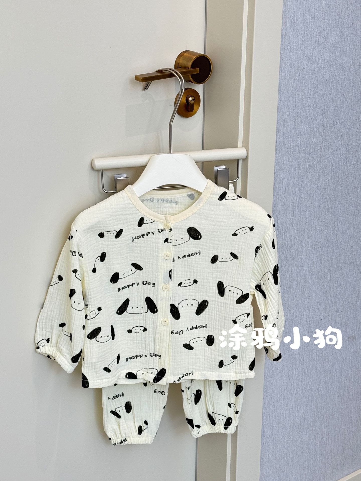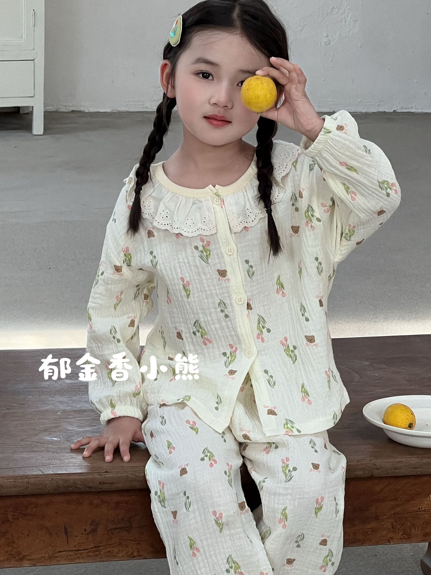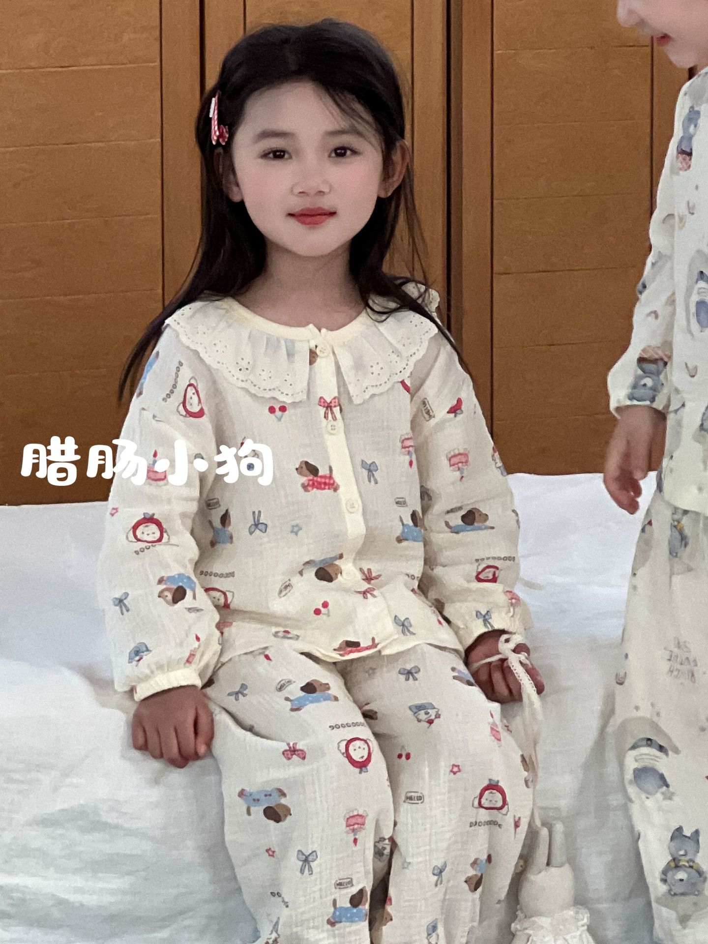 어린 이용 면사 잠옷 세트 봄과 여름 만화 홈 옷 새로운 남성과 여성의 보물 더블 거즈 에어컨 긴 소매스토어 가기