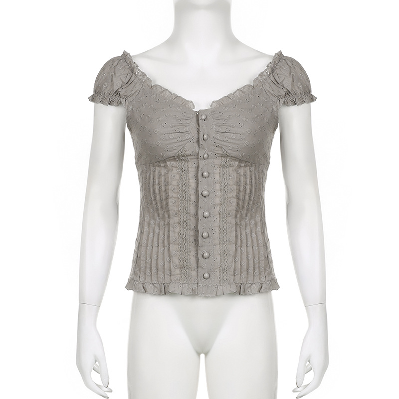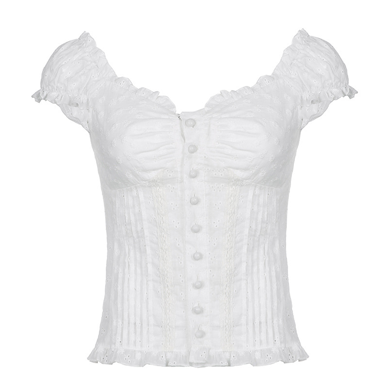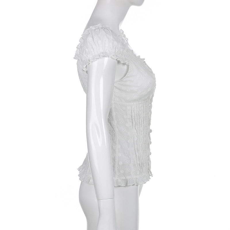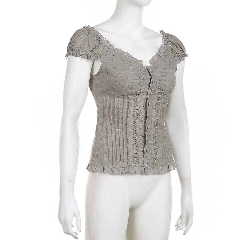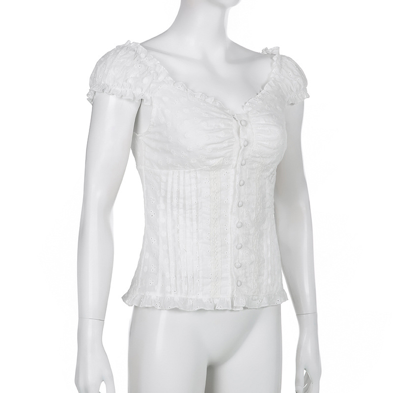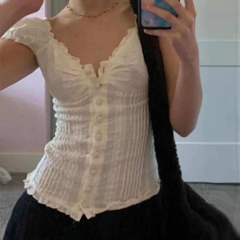 대외 무역 달콤하고 매운 소녀의 주름진 레이스 셔츠 프랑스 스타일 빈티지 순수 욕망 퍼프 슬리브 V 넥 캐주얼 티셔츠스토어 가기