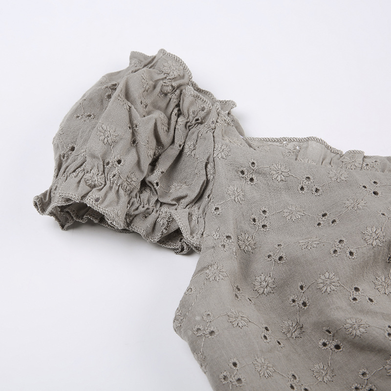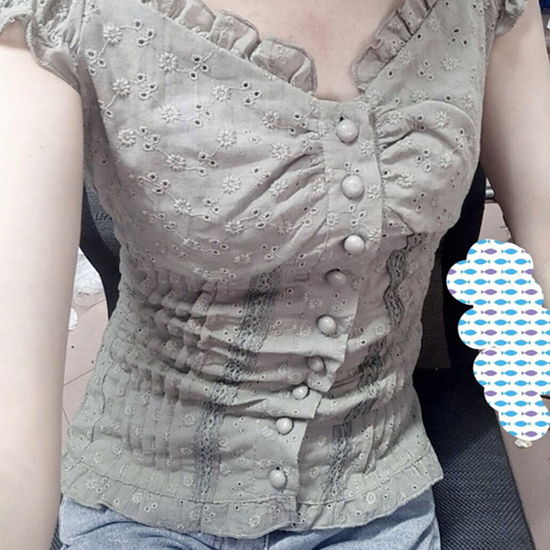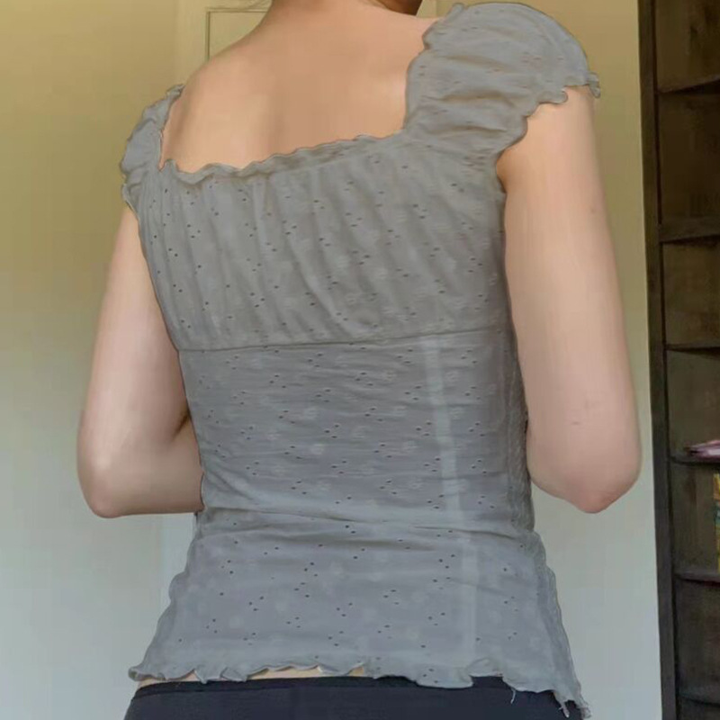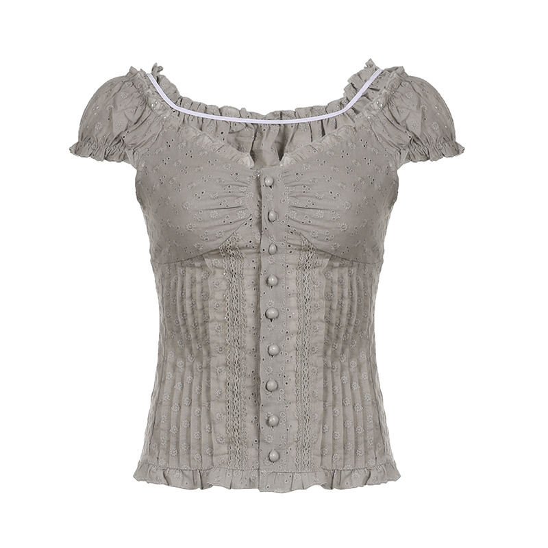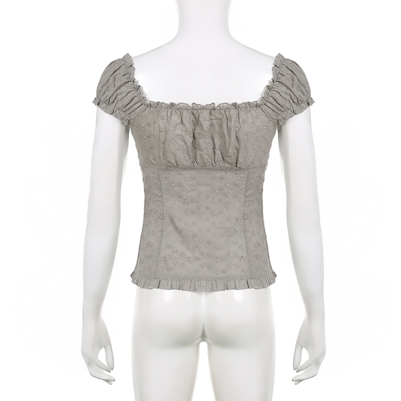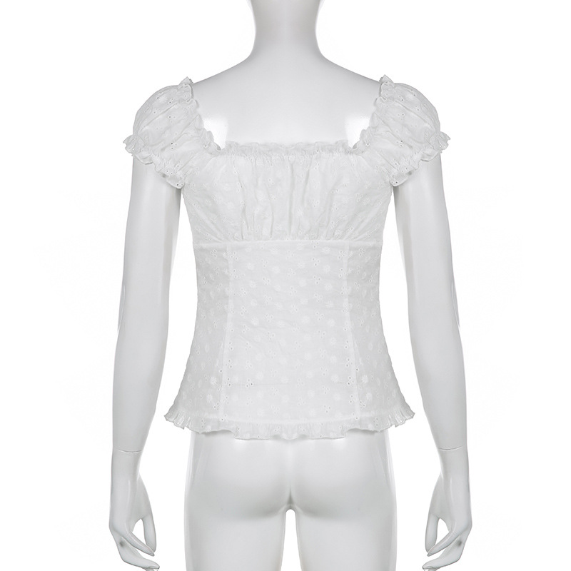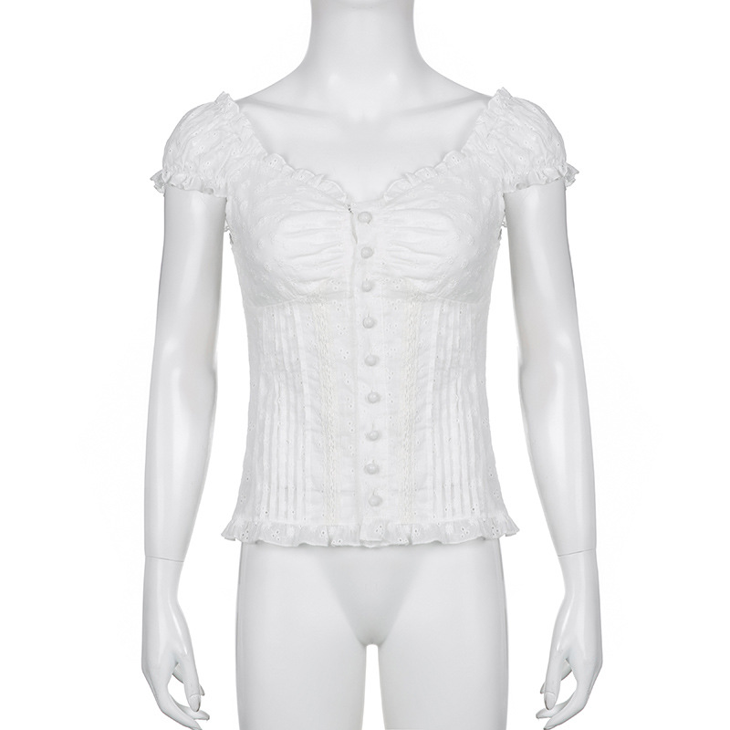 대외 무역 달콤하고 매운 소녀의 주름진 레이스 셔츠 프랑스 스타일 빈티지 순수 욕망 퍼프 슬리브 V 넥 캐주얼 티셔츠스토어 가기