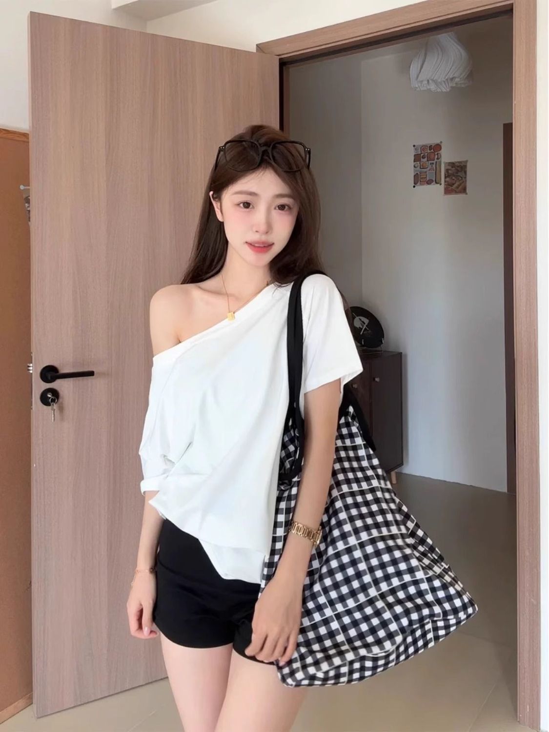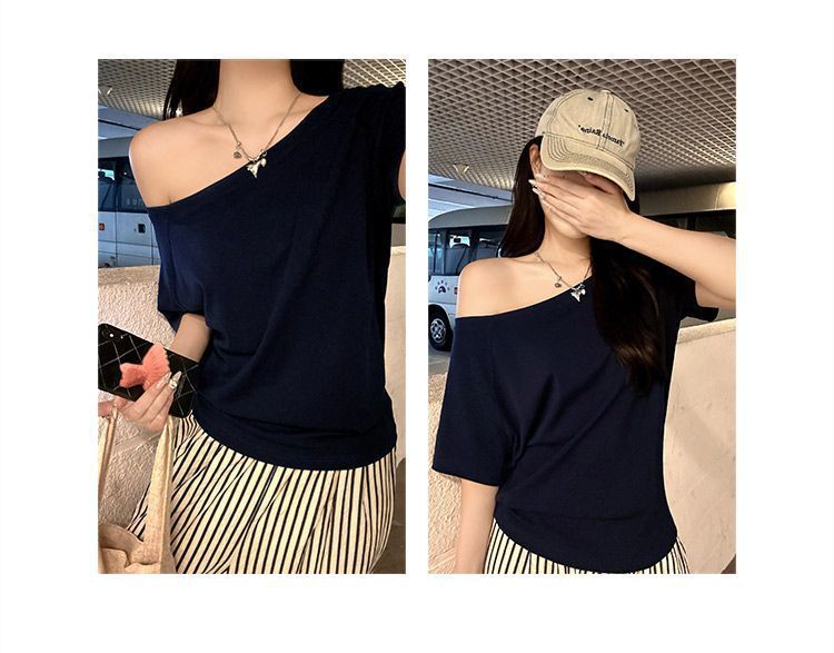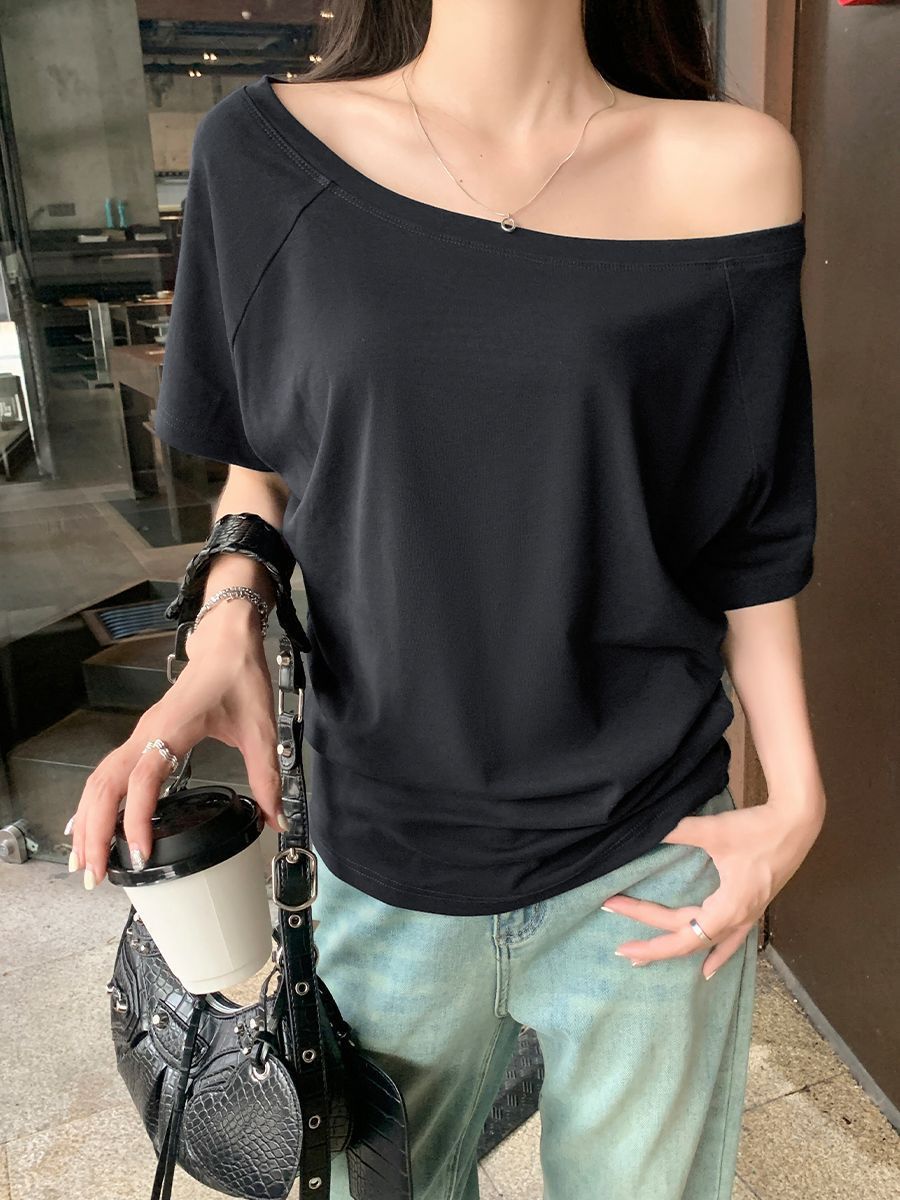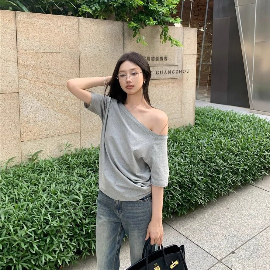 뜨거운 소녀 비스듬한 어깨 쇄골 섹시한 어깨 어깨 순수한 반팔 티셔츠 여성의 초가을 느슨한 게으른 어깨 탑스토어 가기