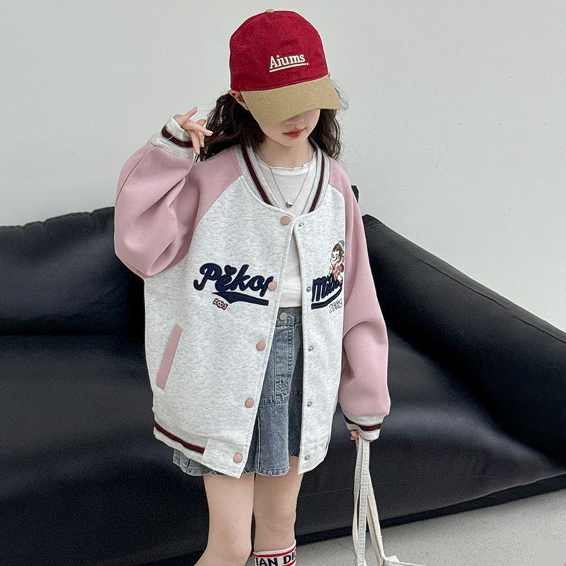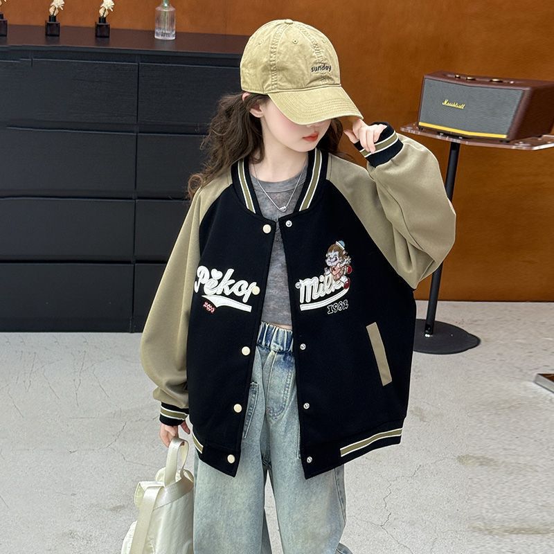큰 어린이와 소녀를위한 아동 의류 2025 소녀 야구 유니폼 봄 새로운 스타일 중대형 어린이 캐주얼 루즈 자켓