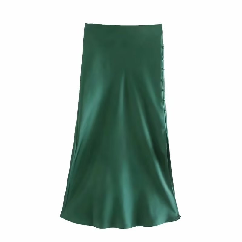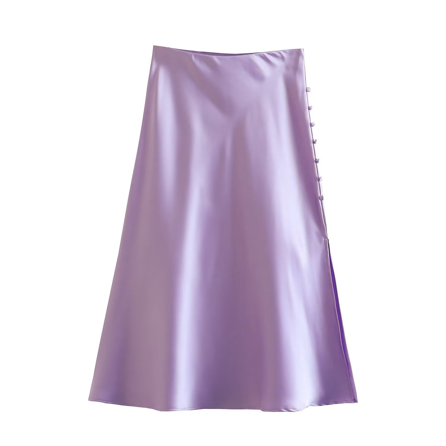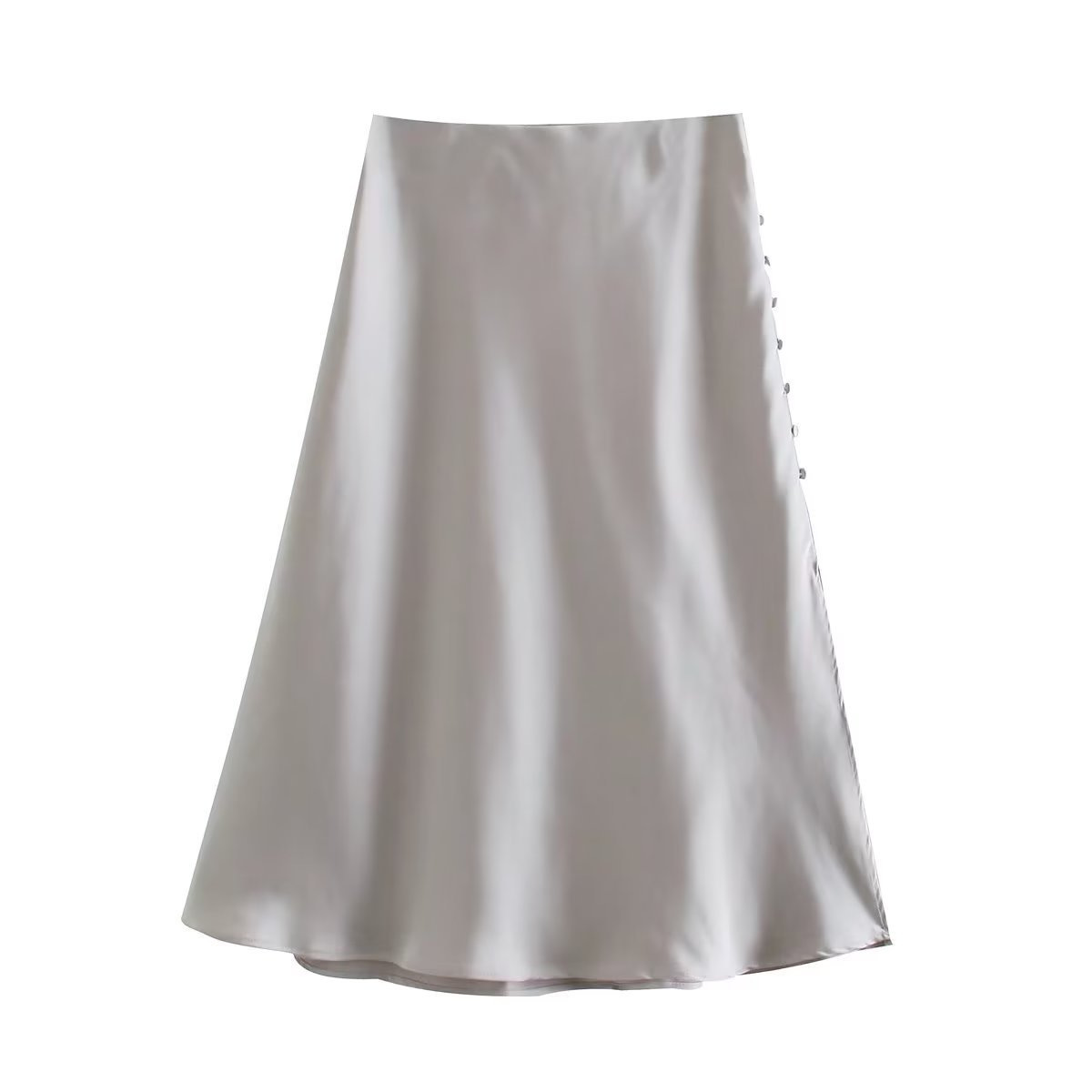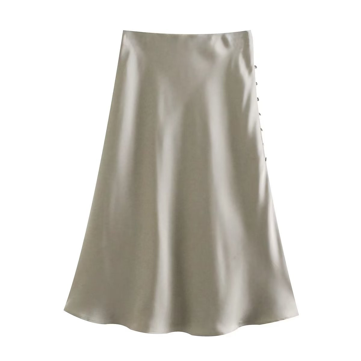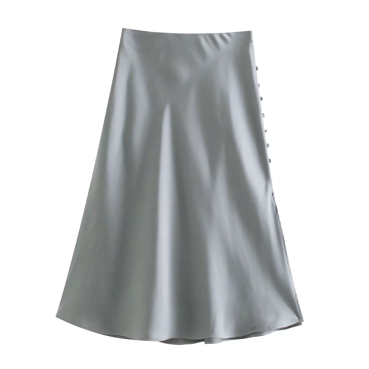 UC & ZA 대외 무역 국경 여성복 2025 여름 새로운 봄 허리 실크 새틴 텍스처 버튼 장식 스플릿 스커트