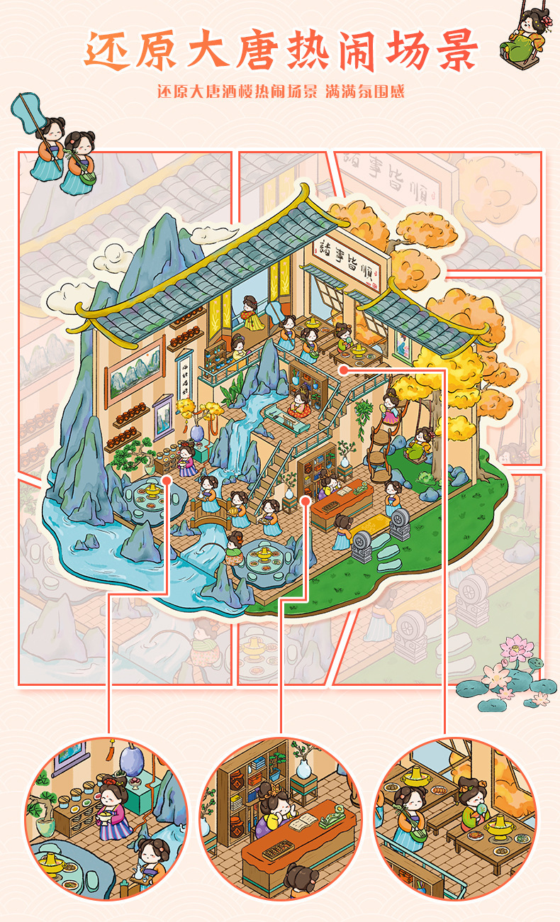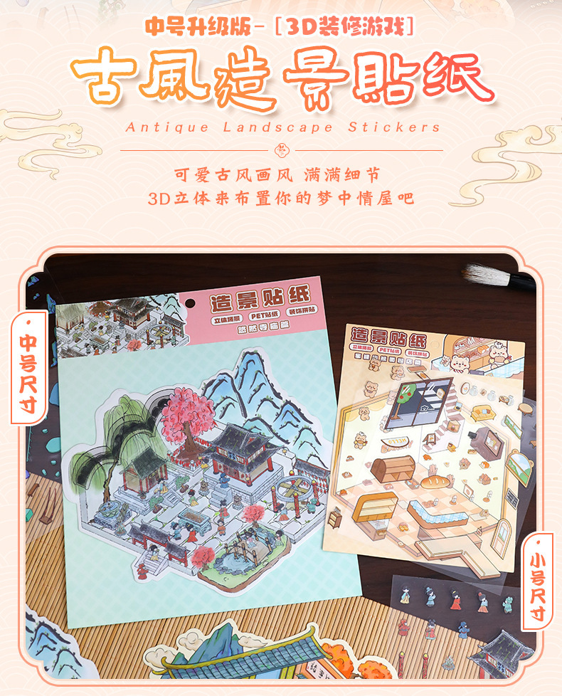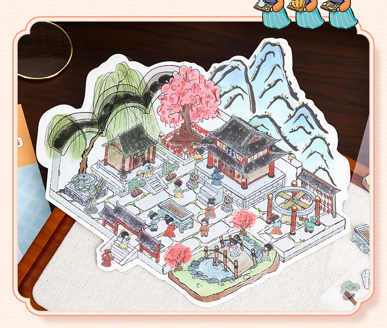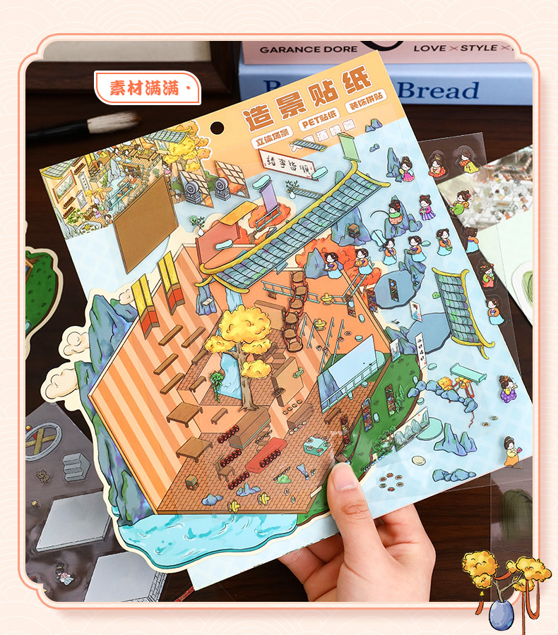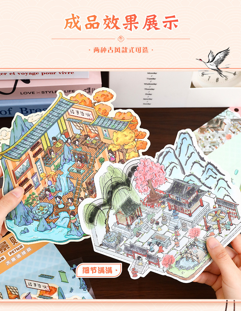 고대 스타일 초대형 버전 조경 스티커 3D 캐빈 입체 재미 스태킹 DIY 미니어처 장면 스티커 핸드북 장식 스티커스토어 가기
