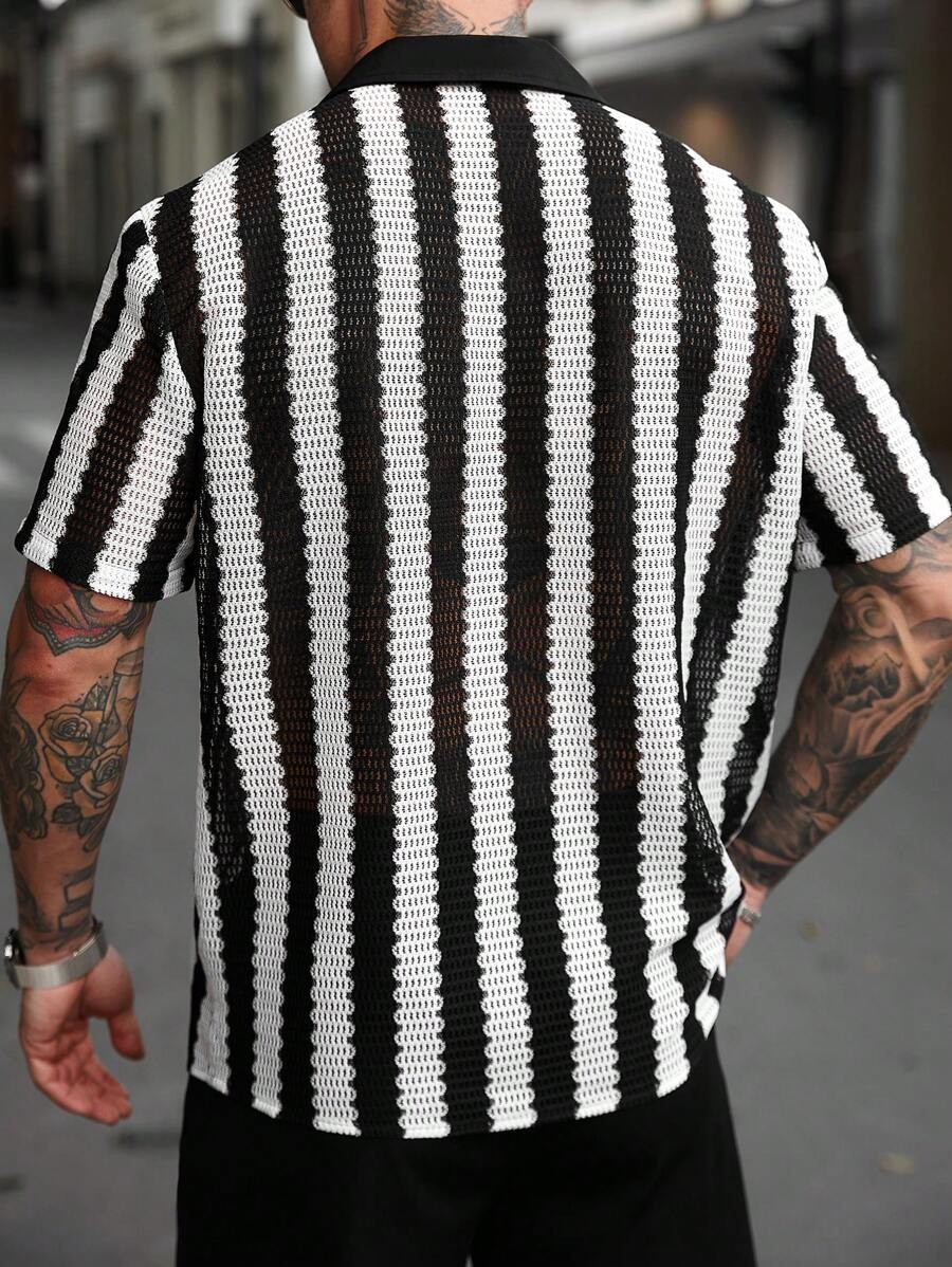 2025 크로스 보더 핫 세일 남성 흑백 스트라이프 할로우 짧은 소매 셔츠 매일 캐주얼 탑