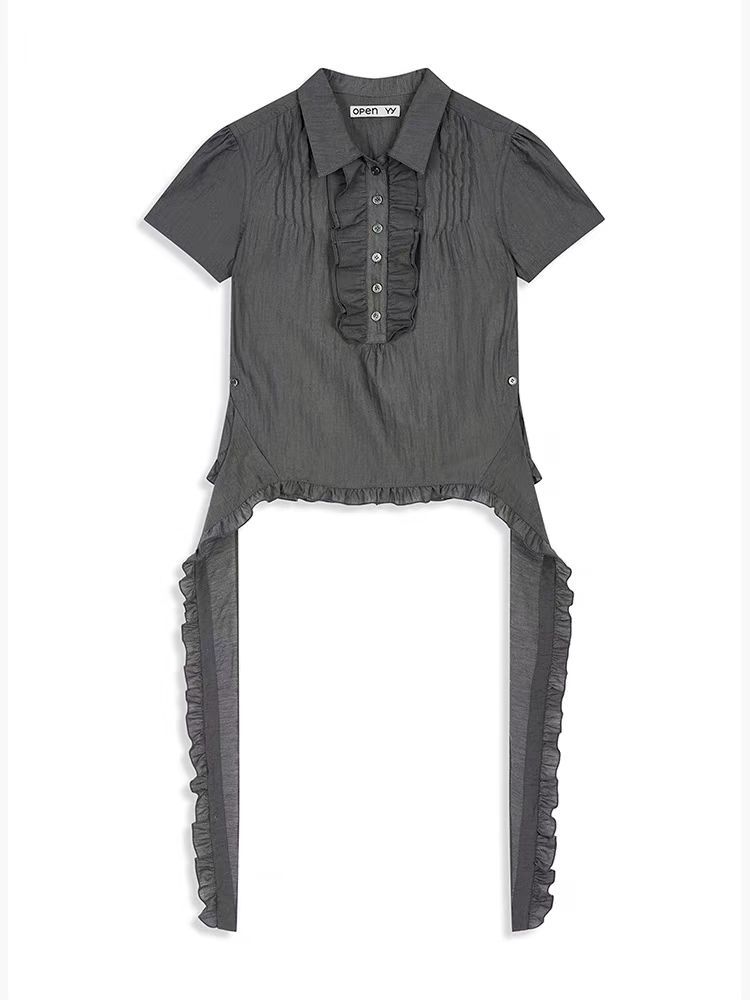YB 오픈 버전은 오리지널 버전과 비교할 수 있습니다. OPENYY 버섯 모양 스트리머 라펠 플리츠 반팔 셔츠 여성 25 봄 여름 신상