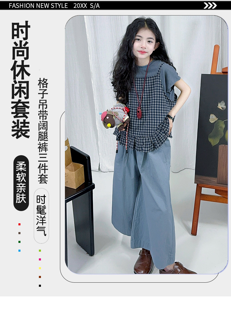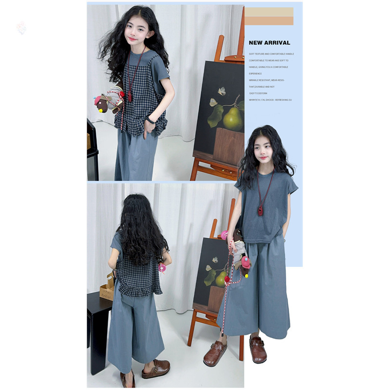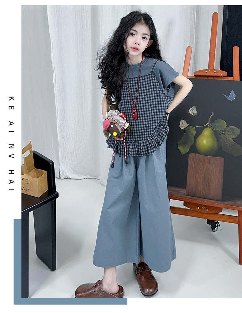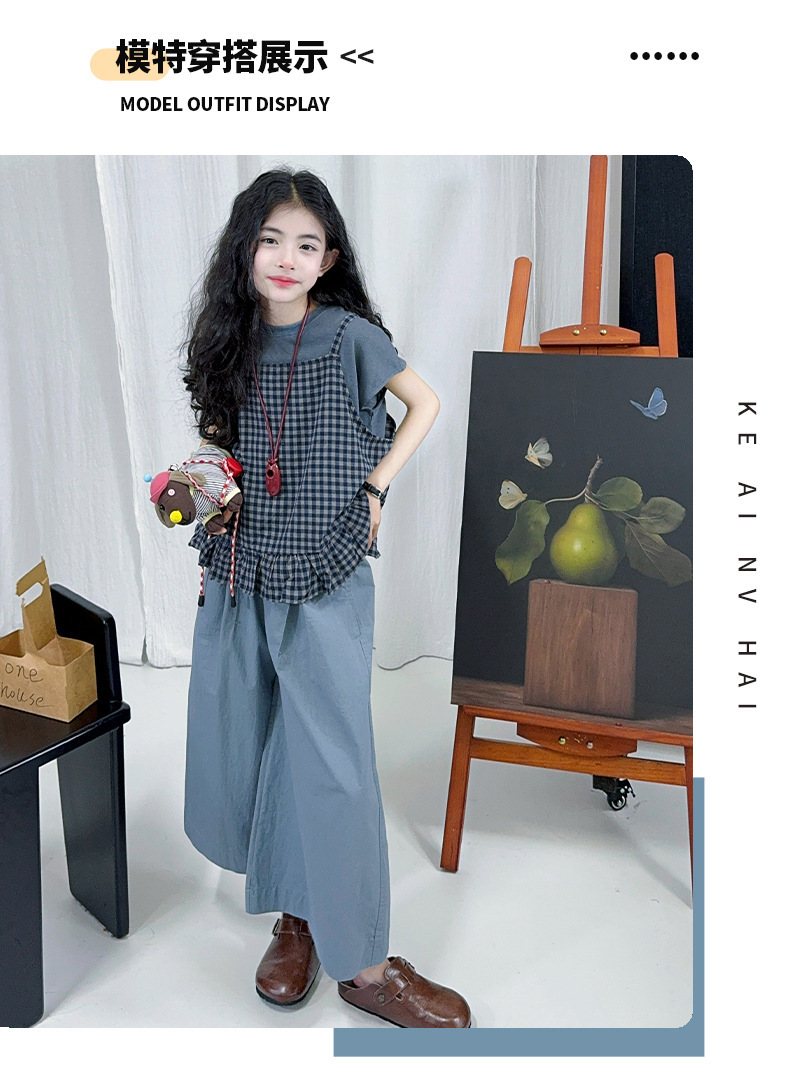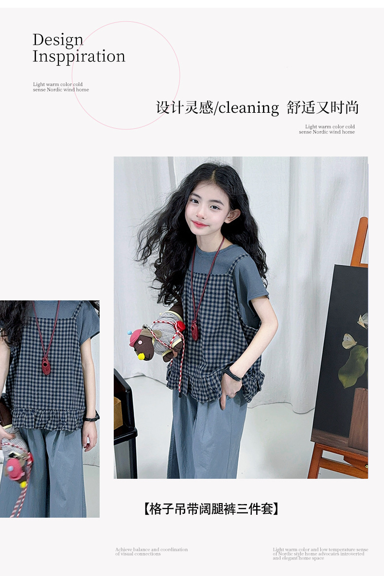 2025 플레이드 걸스 여름 세트 한국 스타일 새로운 도착 와이드 레그 바지 중 · 대형 어린이 3 피스 반팔 조끼 한국식 면화
