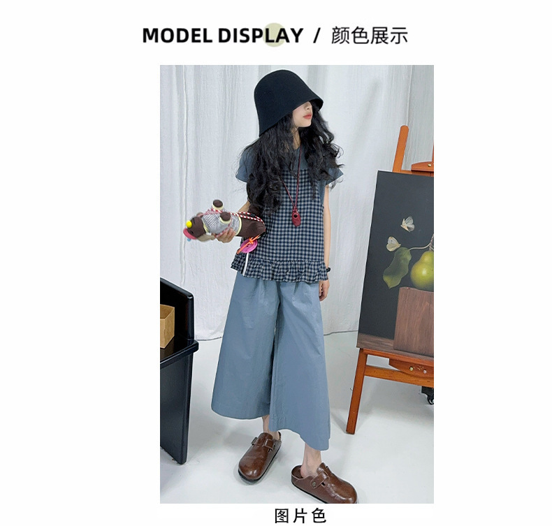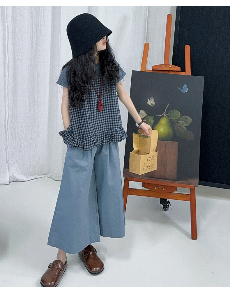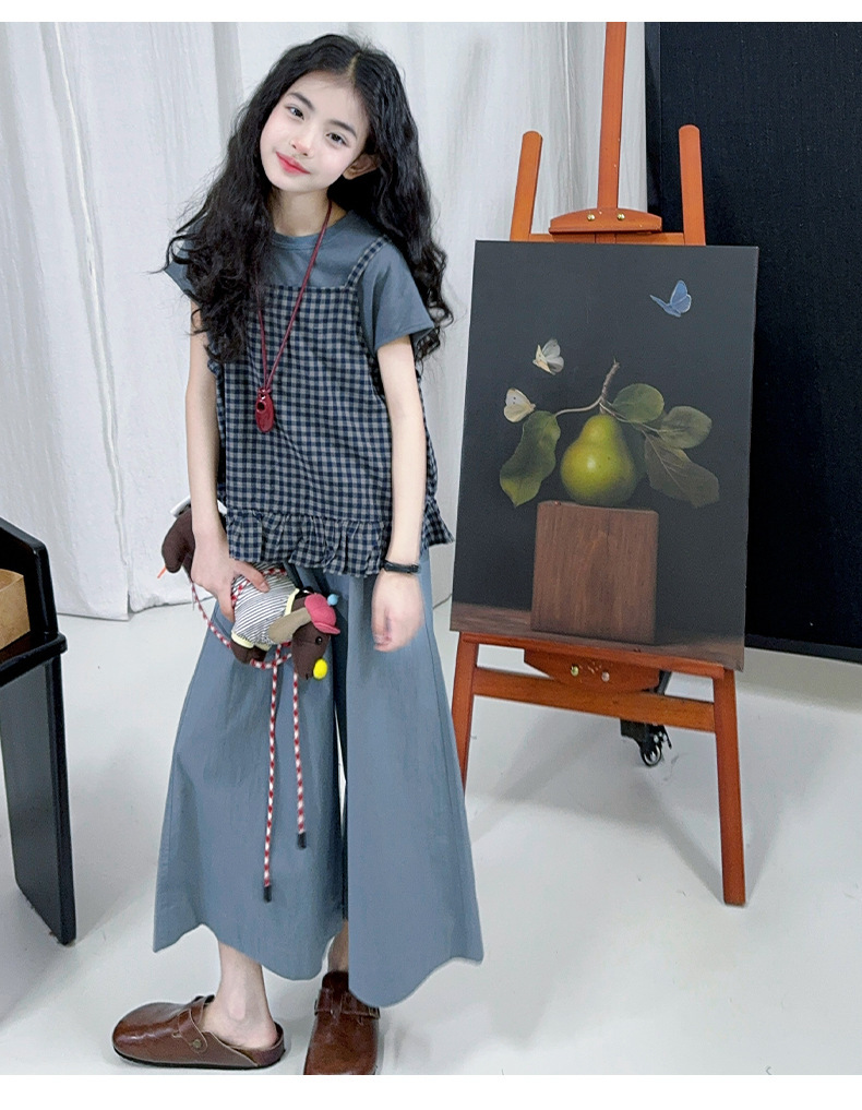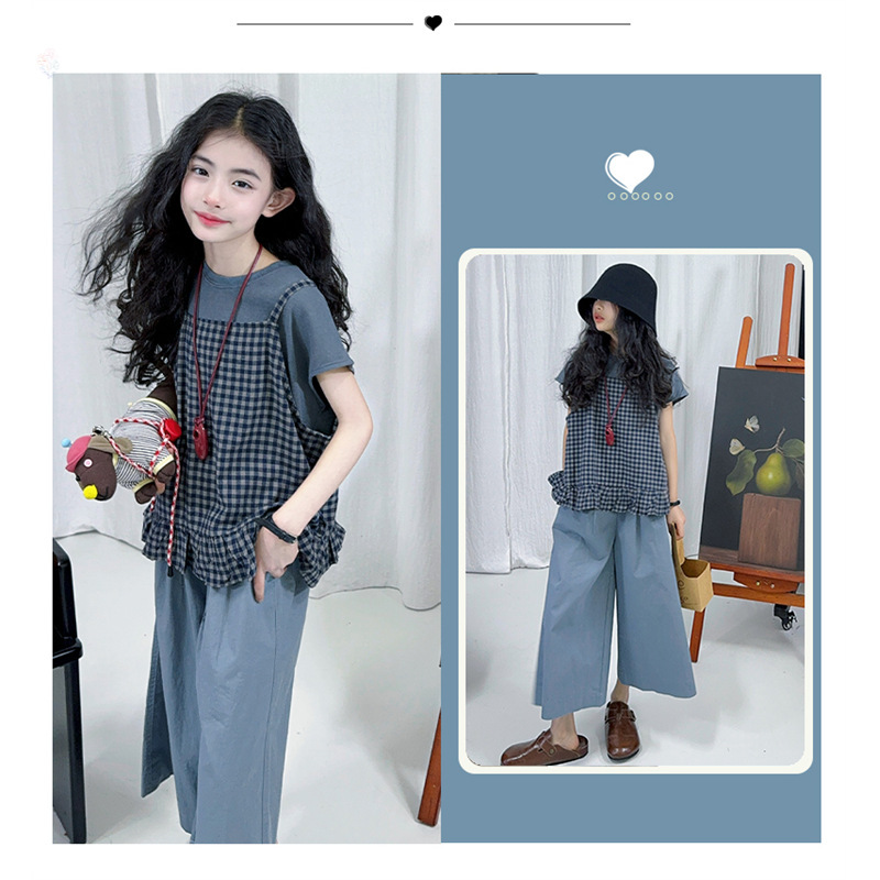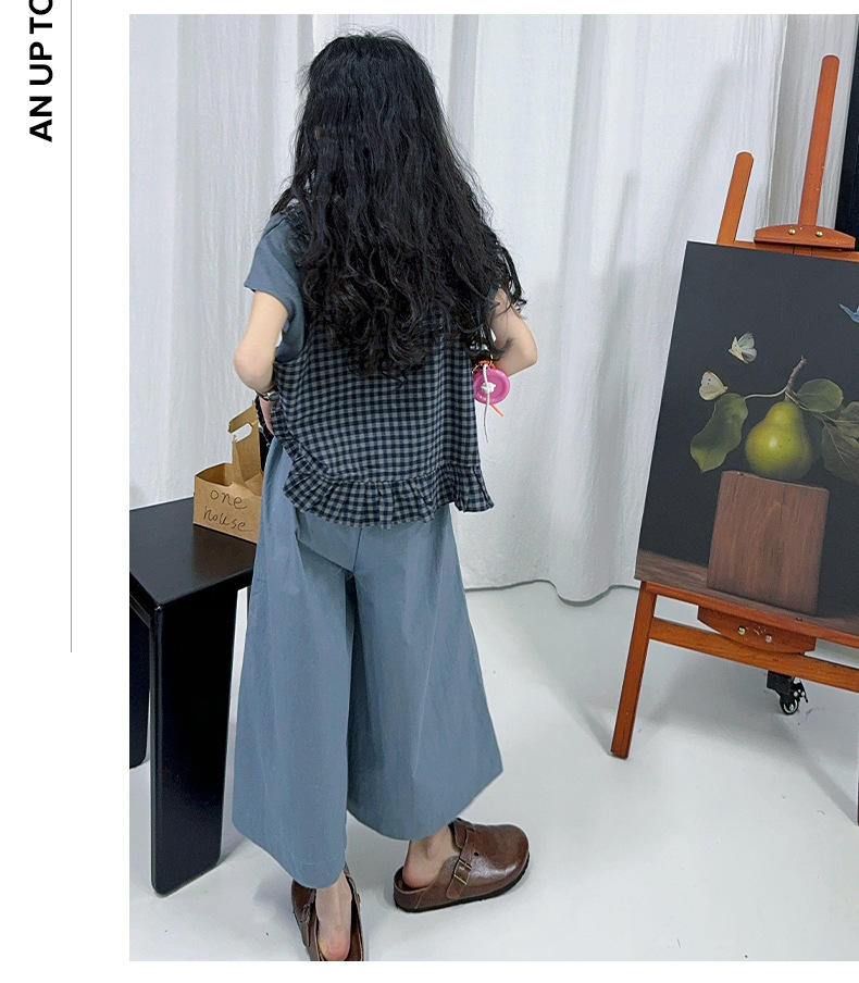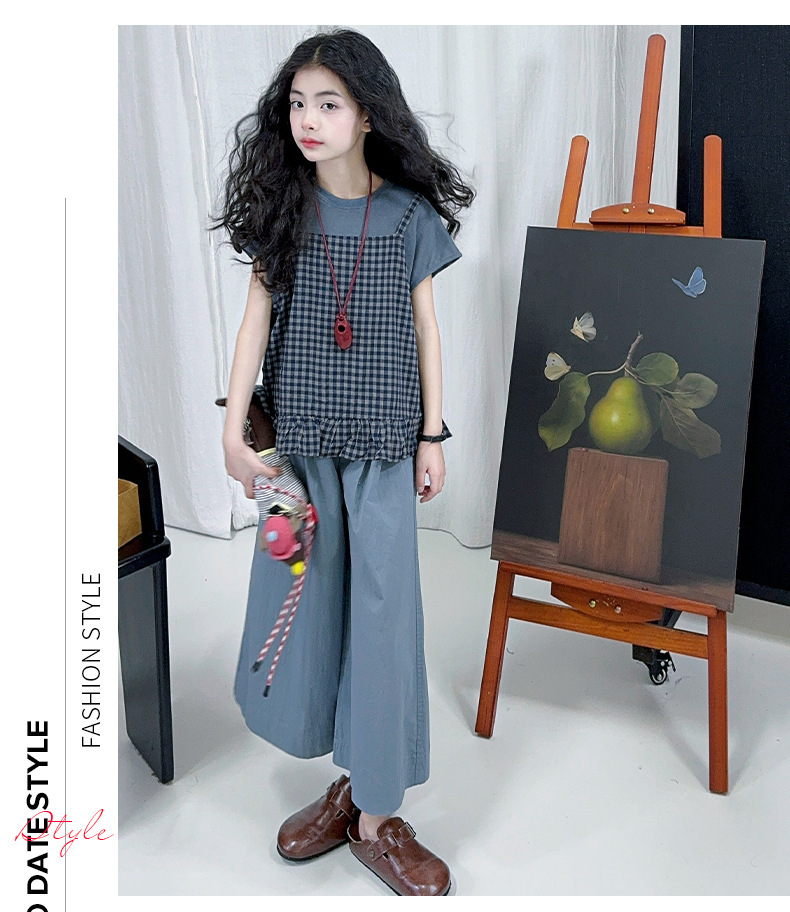 2025 플레이드 걸스 여름 세트 한국 스타일 새로운 도착 와이드 레그 바지 중 · 대형 어린이 3 피스 반팔 조끼 한국식 면화
