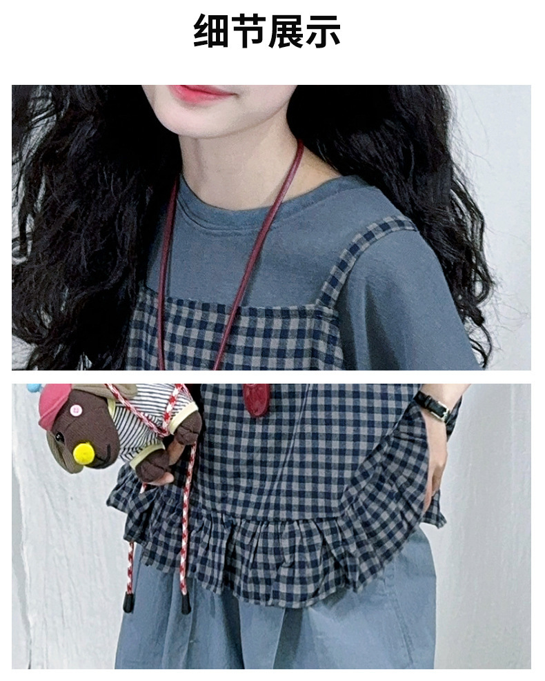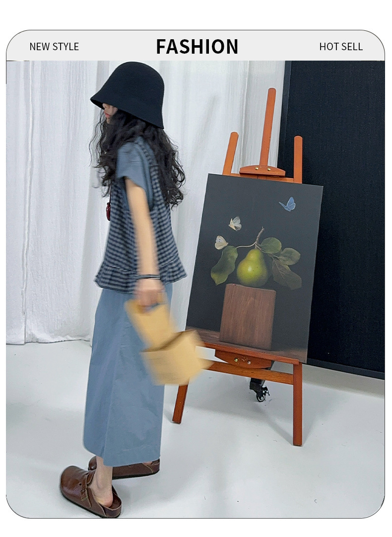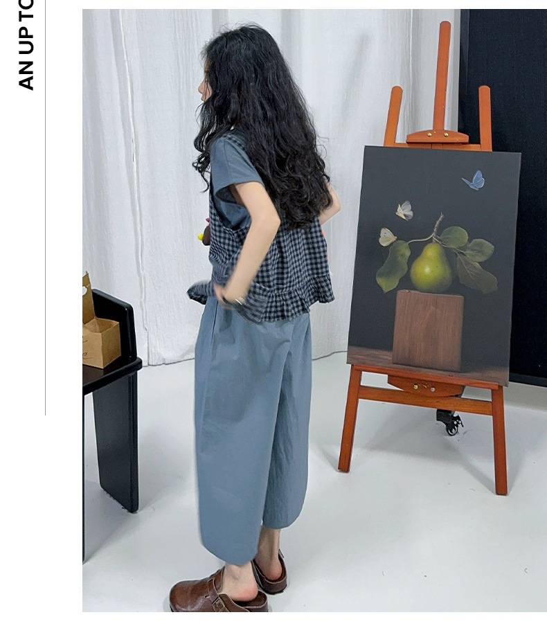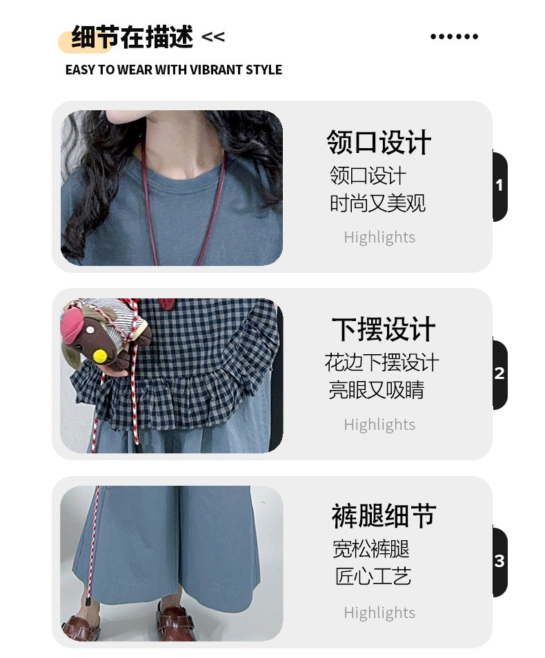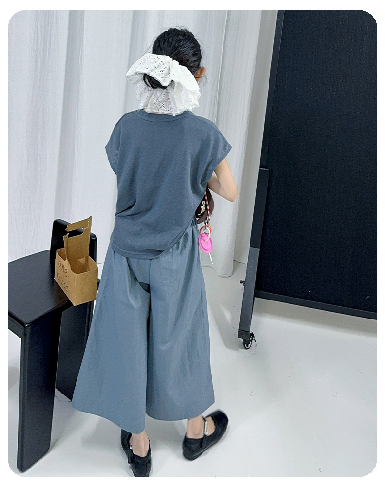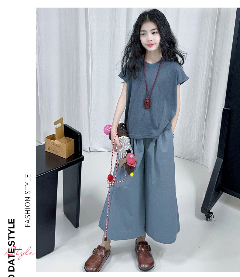 2025 플레이드 걸스 여름 세트 한국 스타일 새로운 도착 와이드 레그 바지 중 · 대형 어린이 3 피스 반팔 조끼 한국식 면화