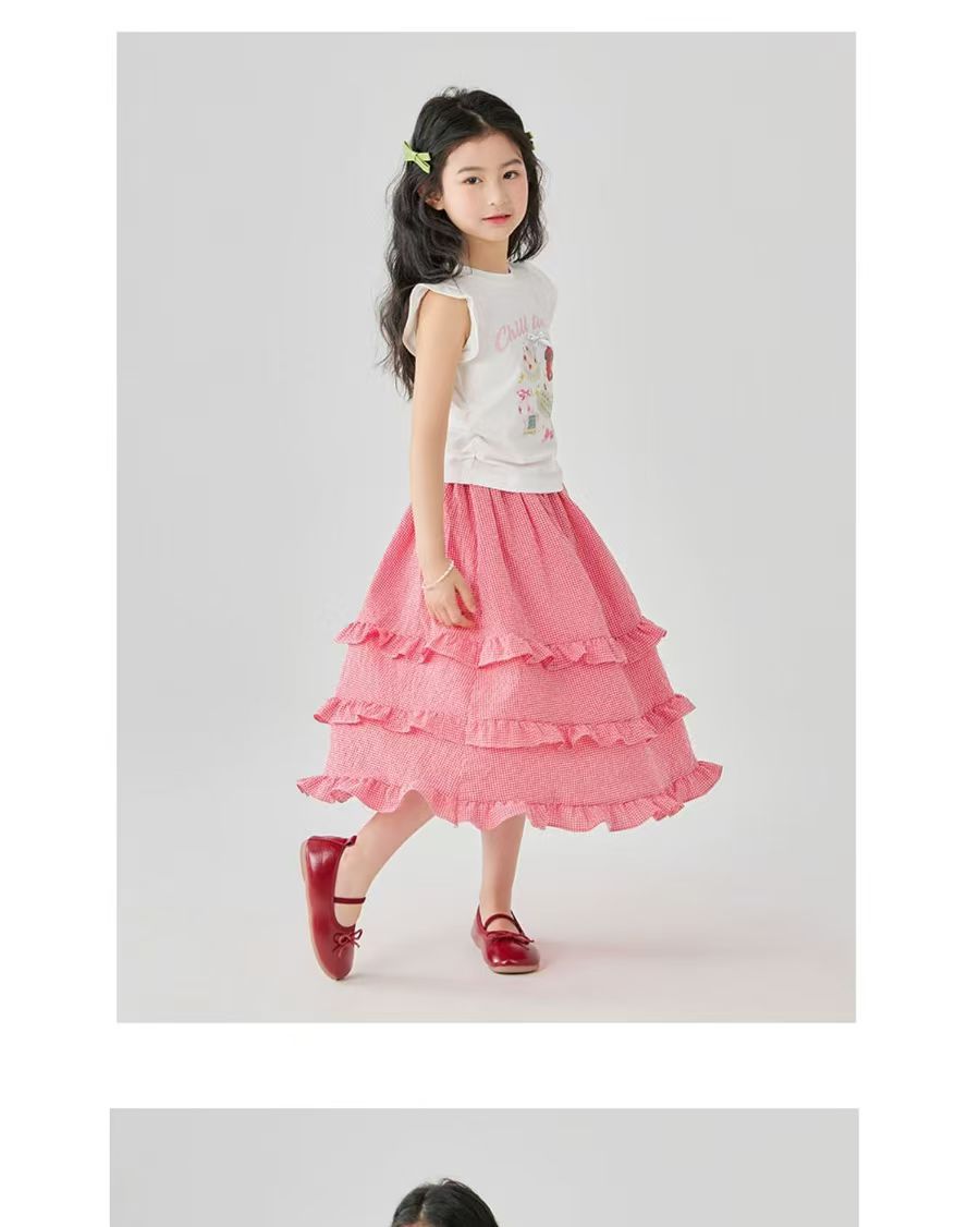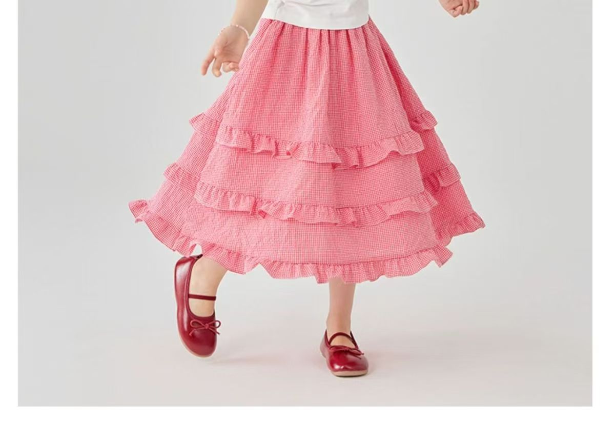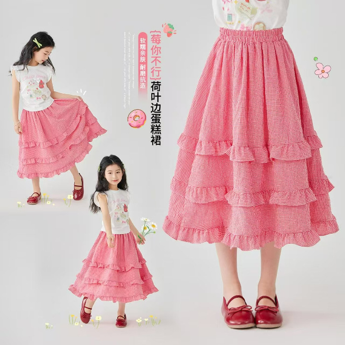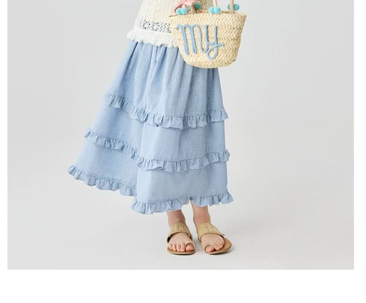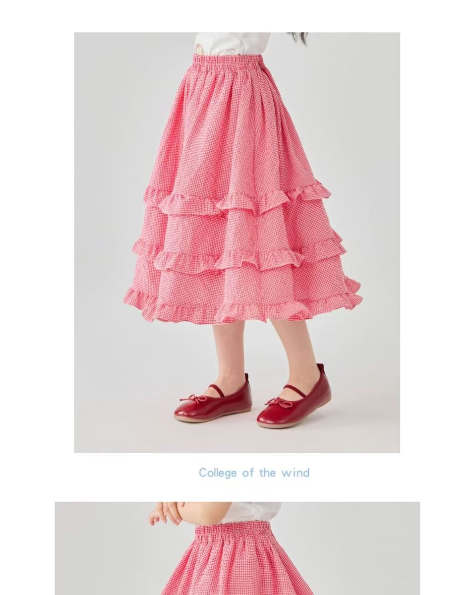 소녀 스커트 봄과 여름 새로운 어린이 러플 격자 무늬 스커트 한국 중간 길이 소녀의 서양식 케이크 스커트