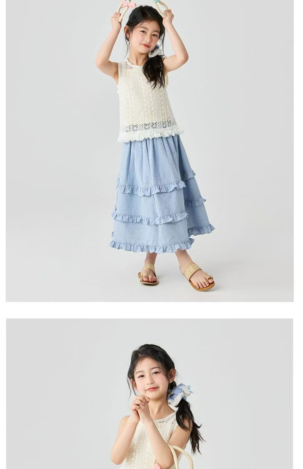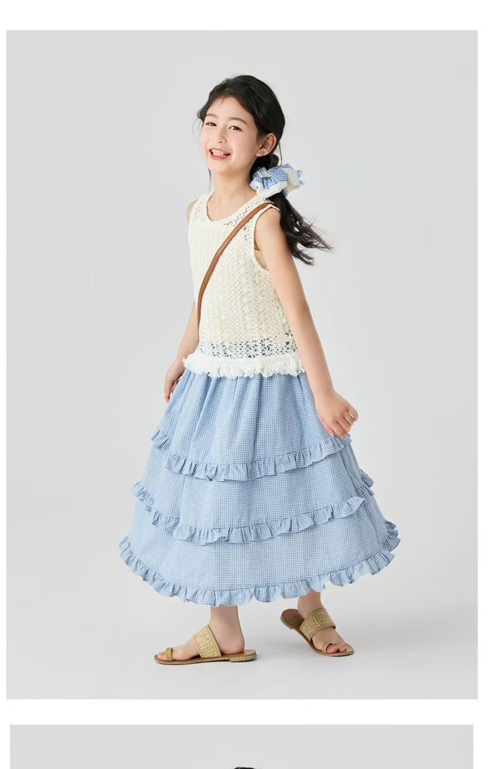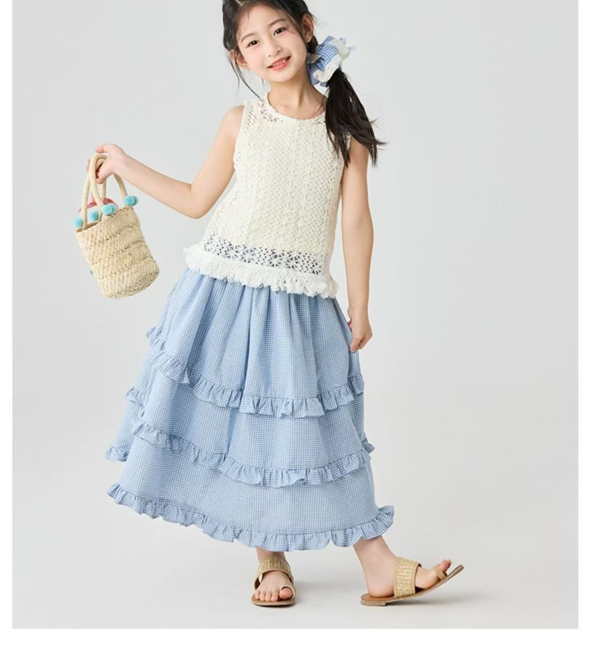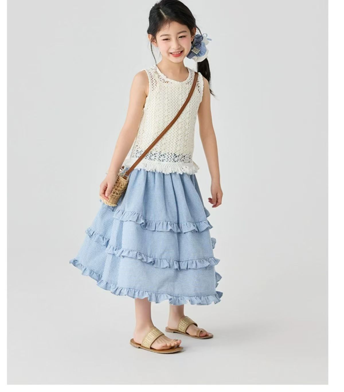 소녀 스커트 봄과 여름 새로운 어린이 러플 격자 무늬 스커트 한국 중간 길이 소녀의 서양식 케이크 스커트