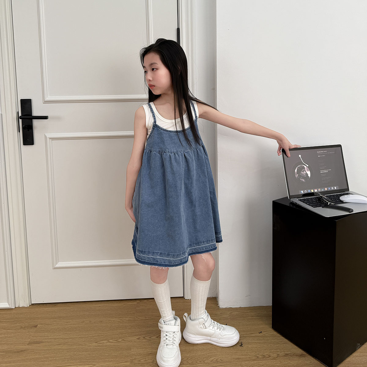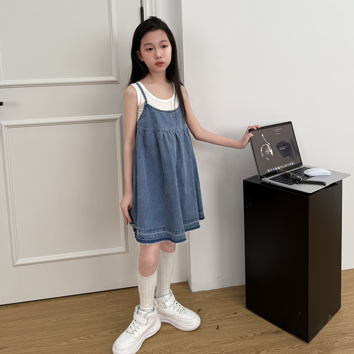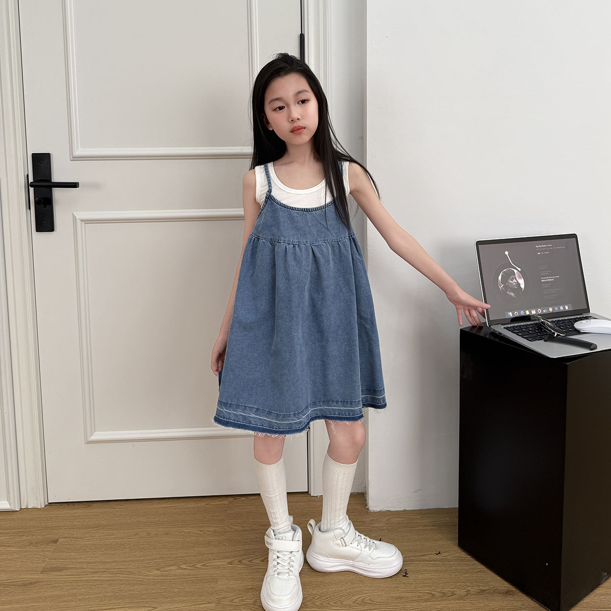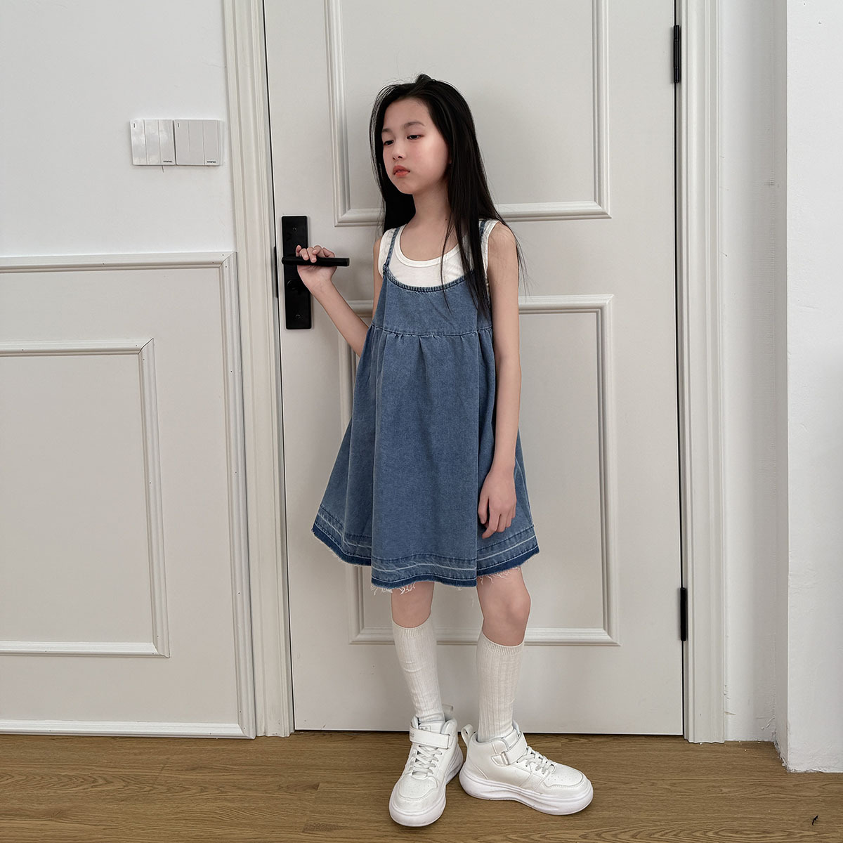 소녀 원피스 2025 여름 새로운 한국 스타일 슬립 스커트 데님 스커트 대형 어린이 짧은 스커트 A 라인 스커트 얇은스토어 가기
