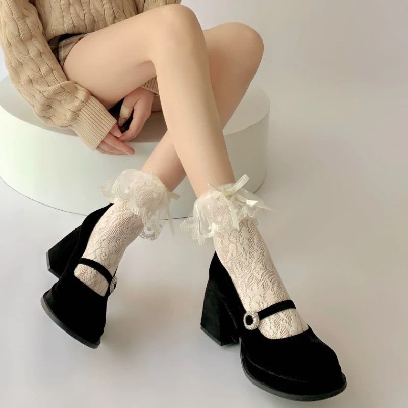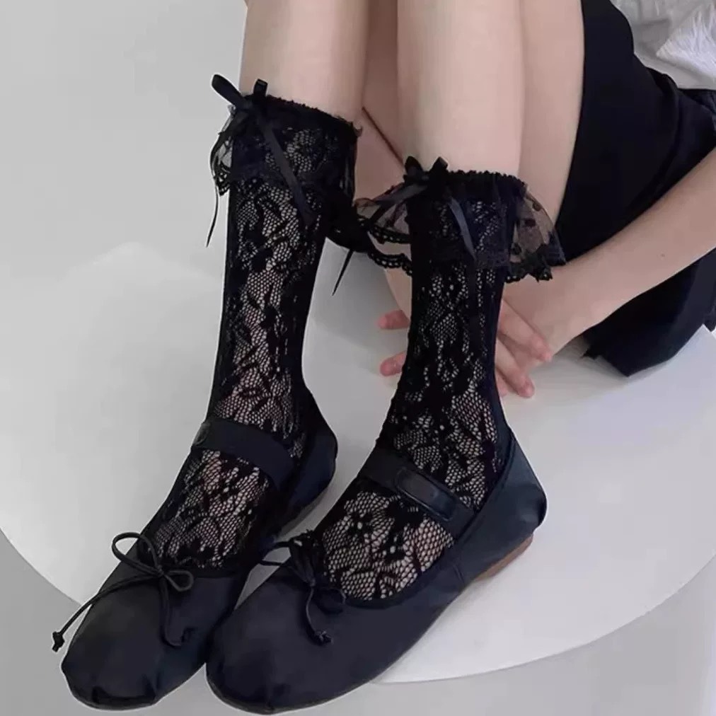 여자 얇은 일본 메쉬 레이스 레이스 화이트 중간 길이 스타킹