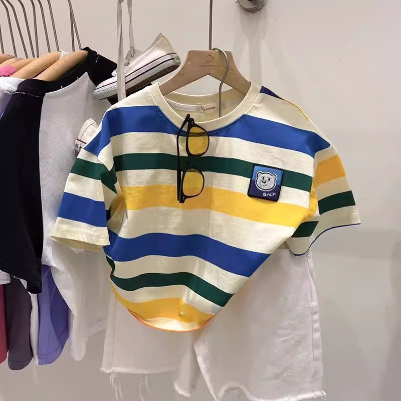 어린이 스트라이프 반팔 코튼 티셔츠 025 여름 캐주얼 통기성 소년과 소녀 느슨한 베이비 탑 도매스토어 가기