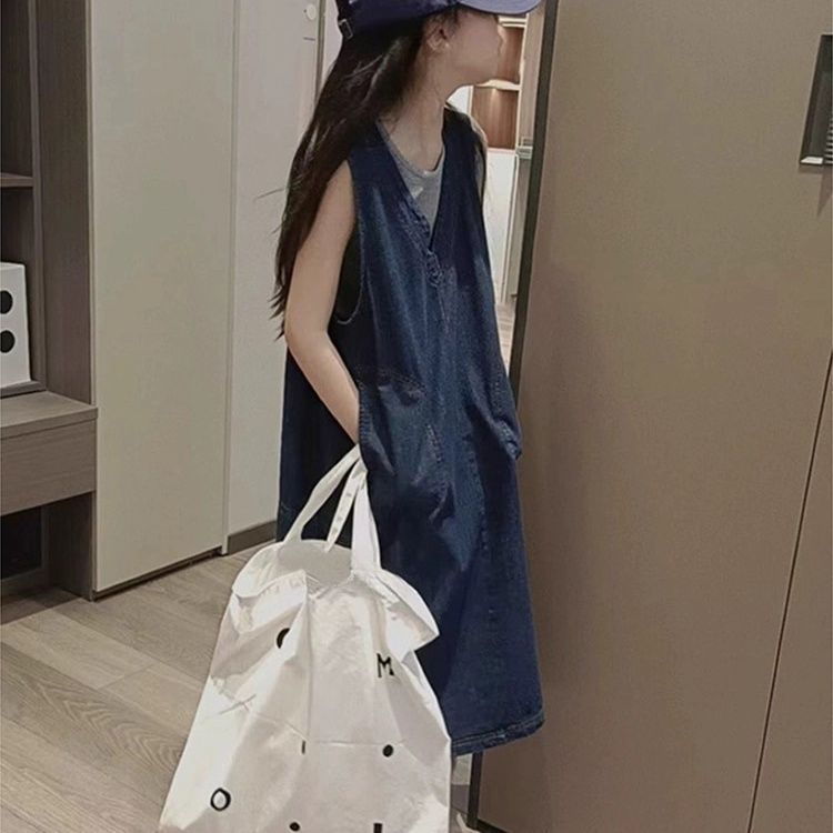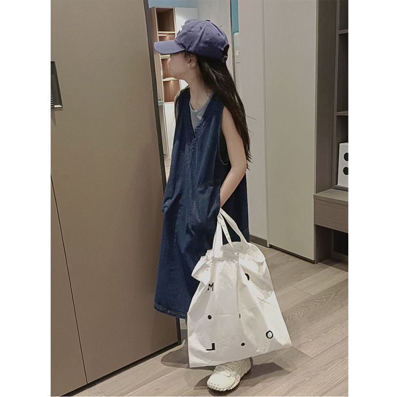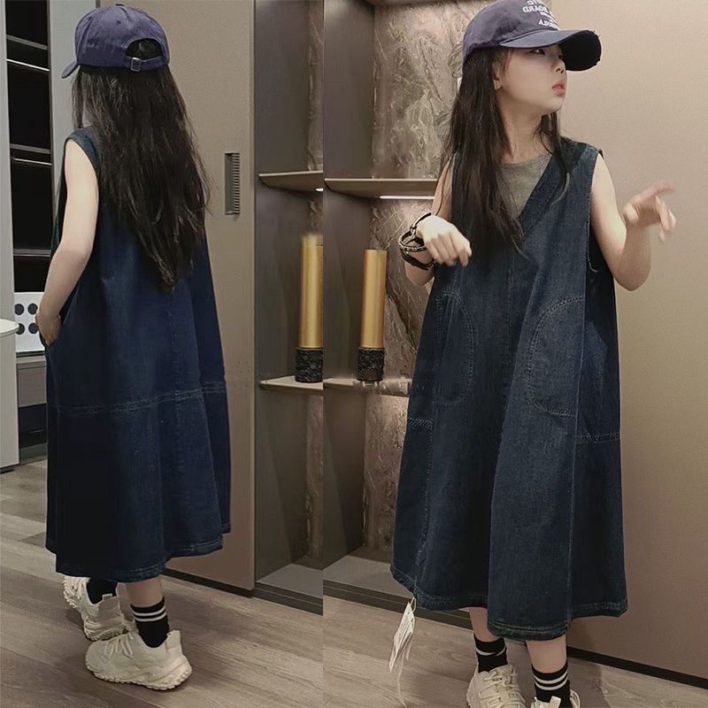 여자 여름 원피스 데님 치마 2025 새로운 어린이 민소매 스커트 긴 서양 스타일 여름 원피스 소녀 큰 아이들스토어 가기