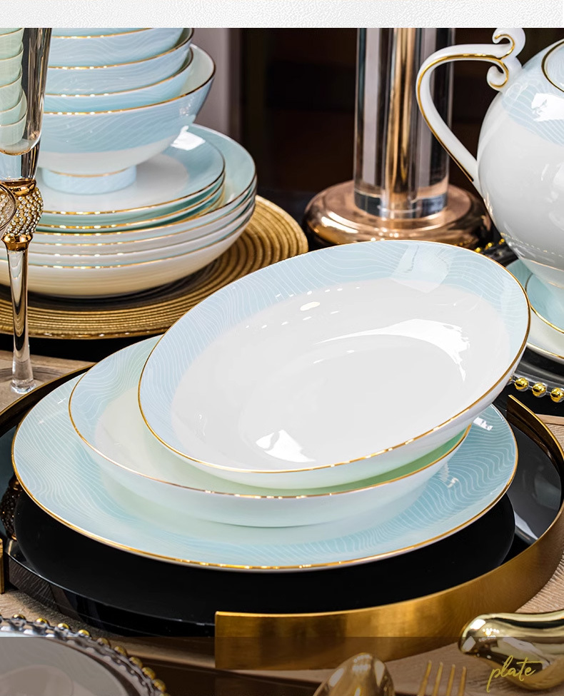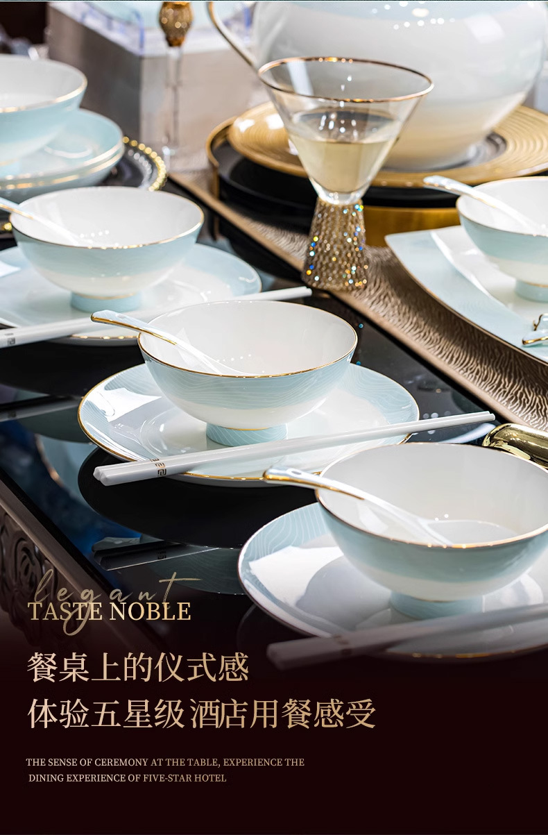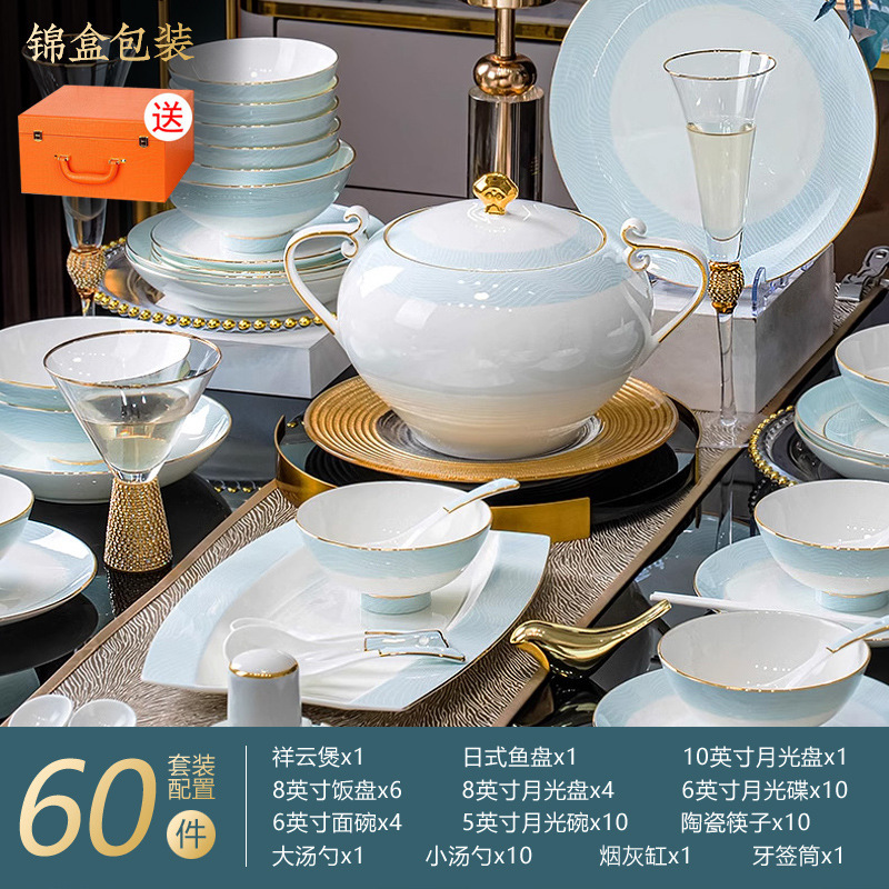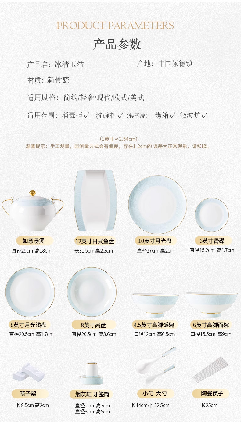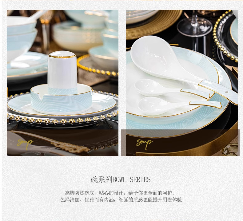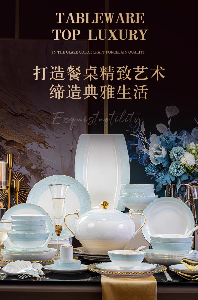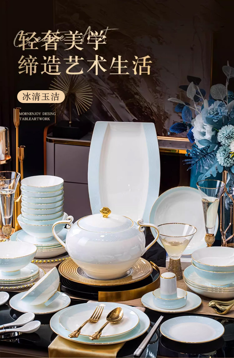 Jingdezhen 세라믹 식기 얼음 맑고 옥 깨끗한 꿈 블루 하이 컬러 값 라이트 럭셔리 뉴 본 중국 그릇 및 접시 세트 선물