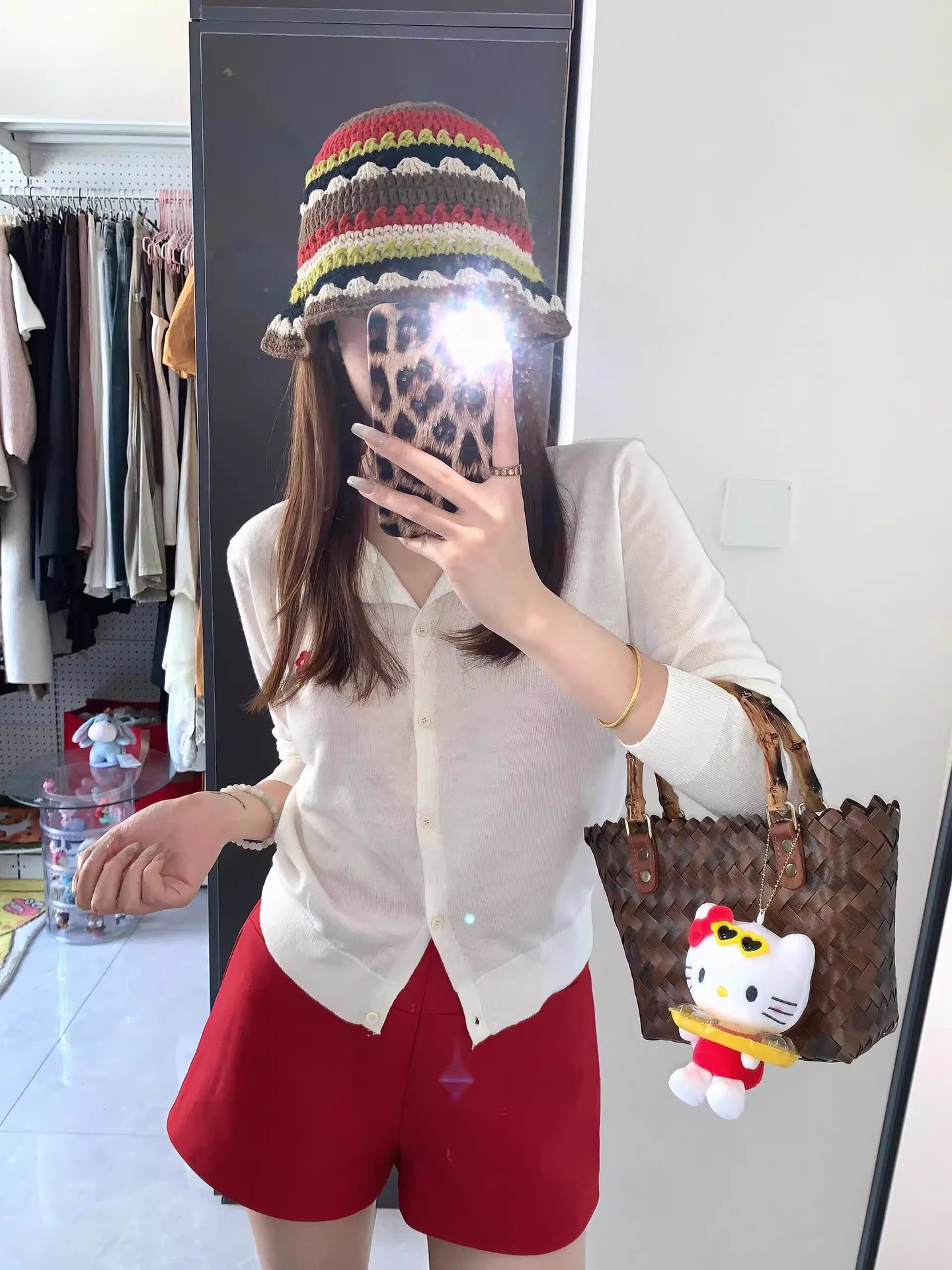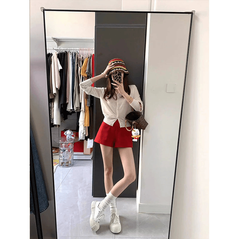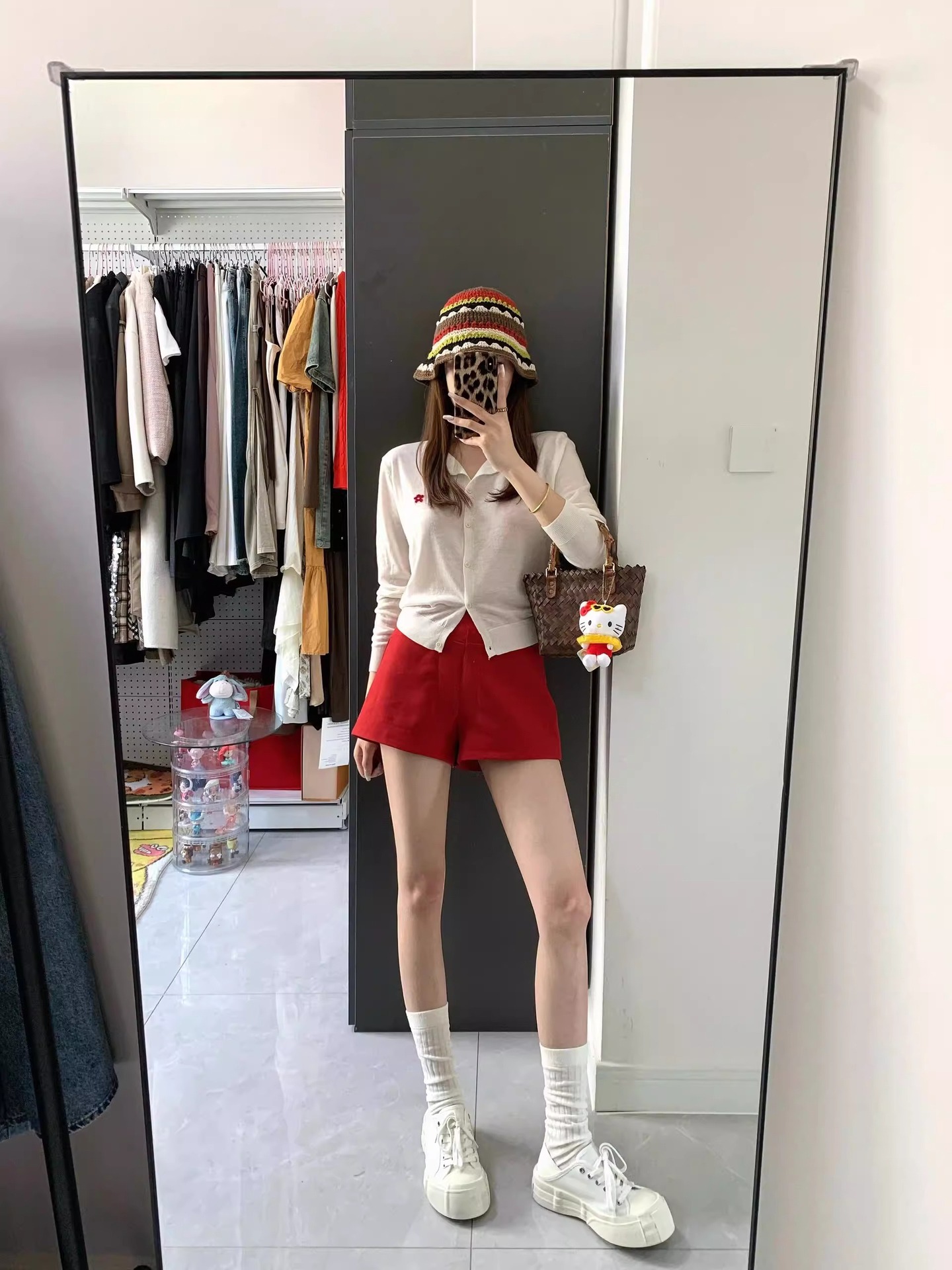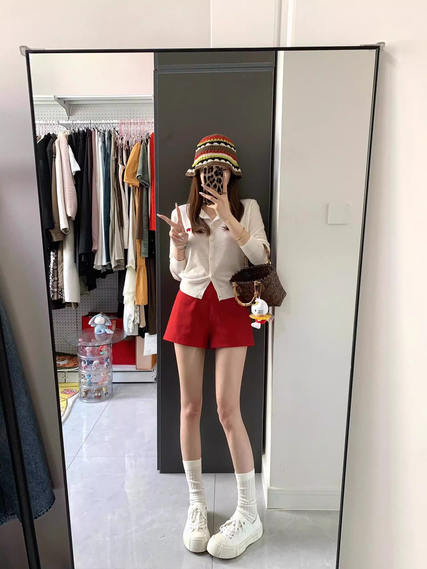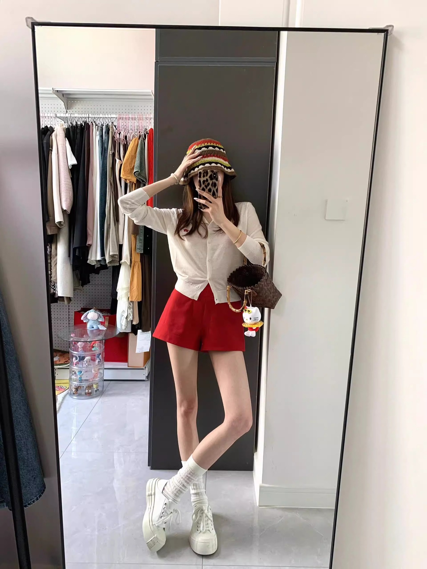 뜨거운 소녀 붉은 높은 허리 넓은 다리 A 모양 반바지 여성 여름 뜨거운 바지 작은 우아한 느슨한 슬리밍 스트레이트 바지스토어 가기