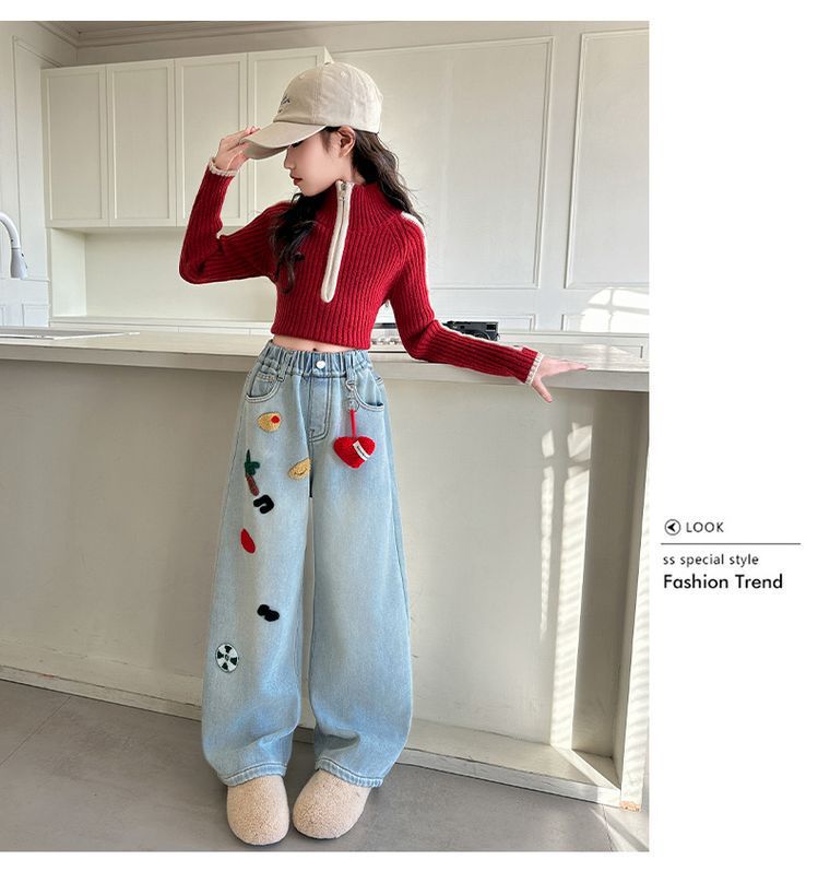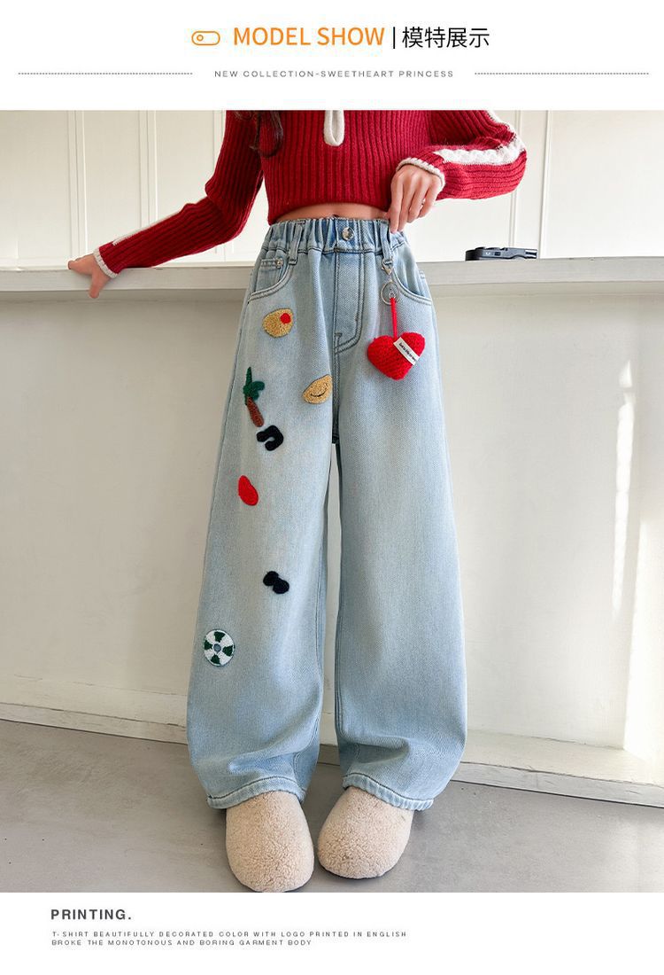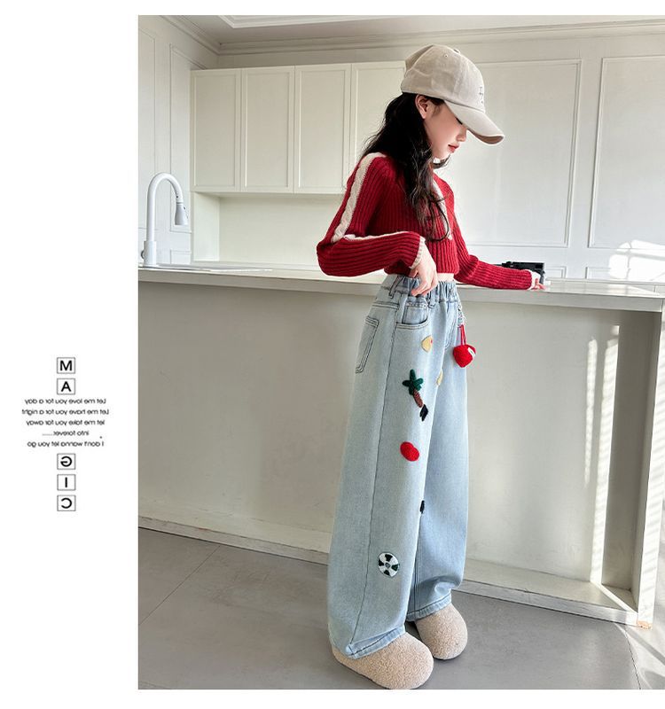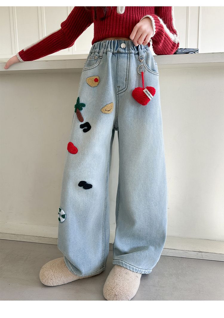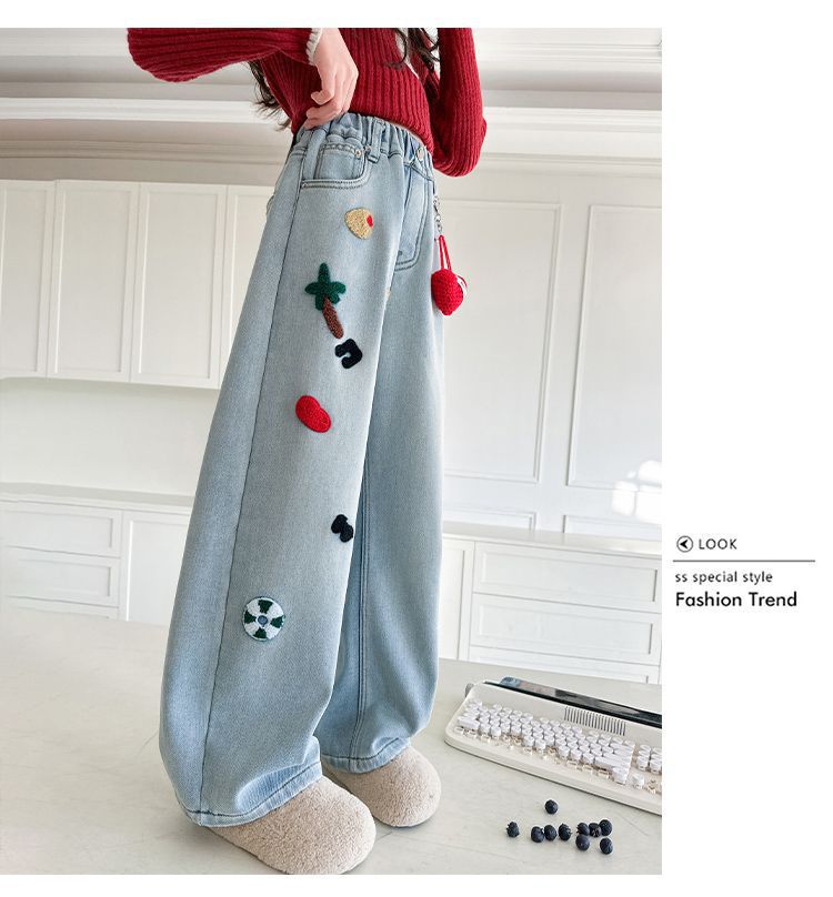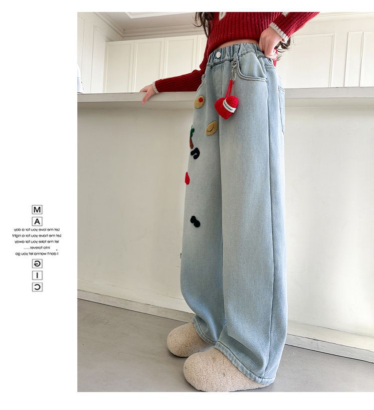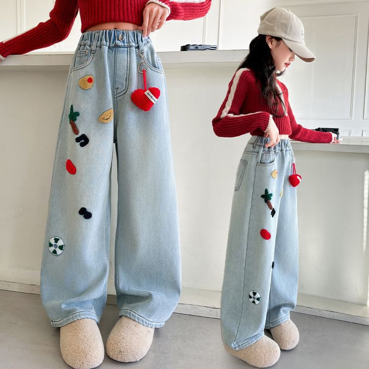 여아용 와이드 팬츠, 데님 스트레이트 팬츠, 중대형 아동용 봄, 가을 신작 아동용 청바지, 루즈한 수건 자수 패션스토어 가기