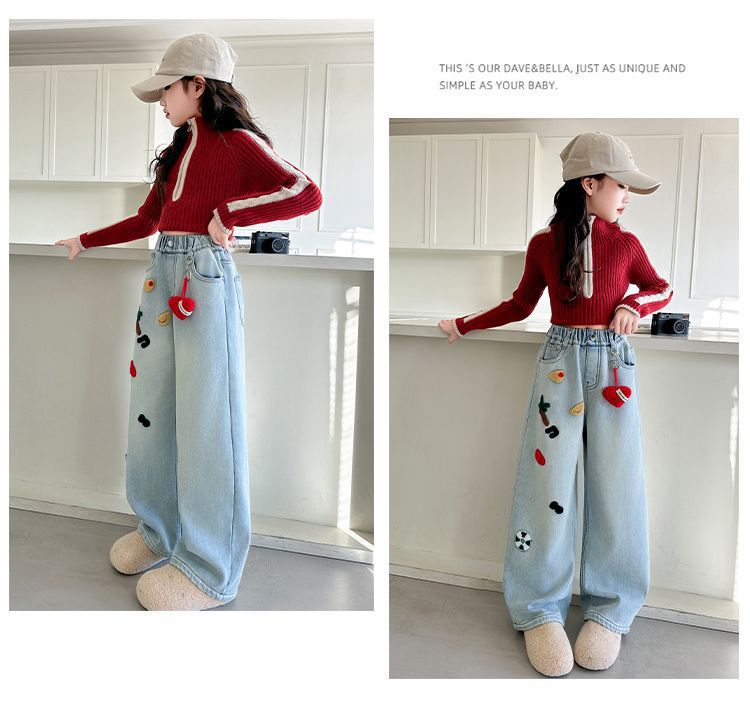 女童阔腿裤牛仔直筒裤中大童春秋新款儿童牛仔裤子宽松毛巾绣时尚