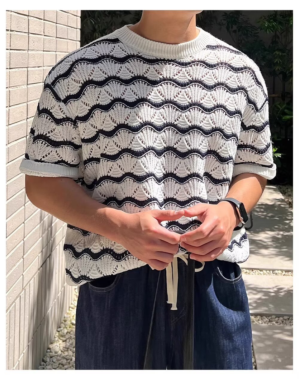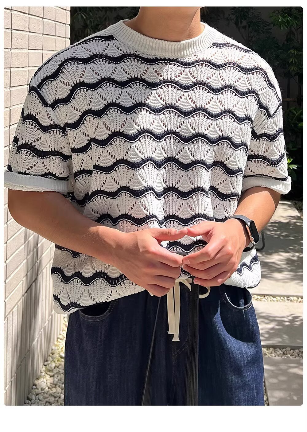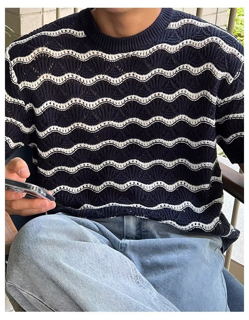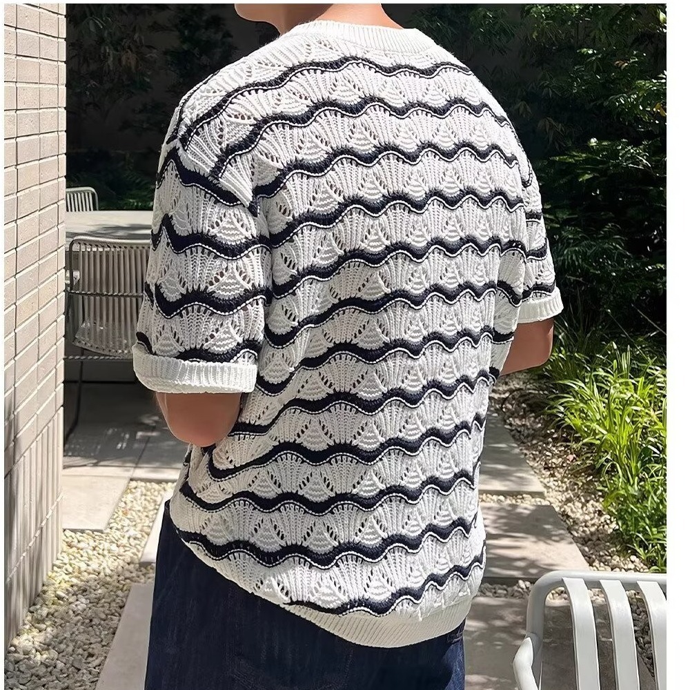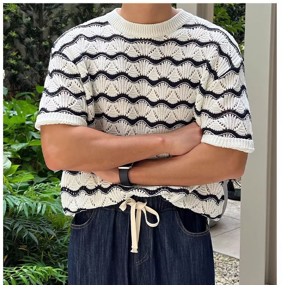 남성 티셔츠 반팔 여름 트렌디 브랜드 하이 엔드 헤비 듀티 중공 스웨터 자카드 웨이브 스트라이프 티셔츠 탑