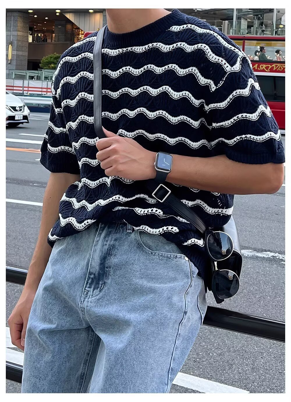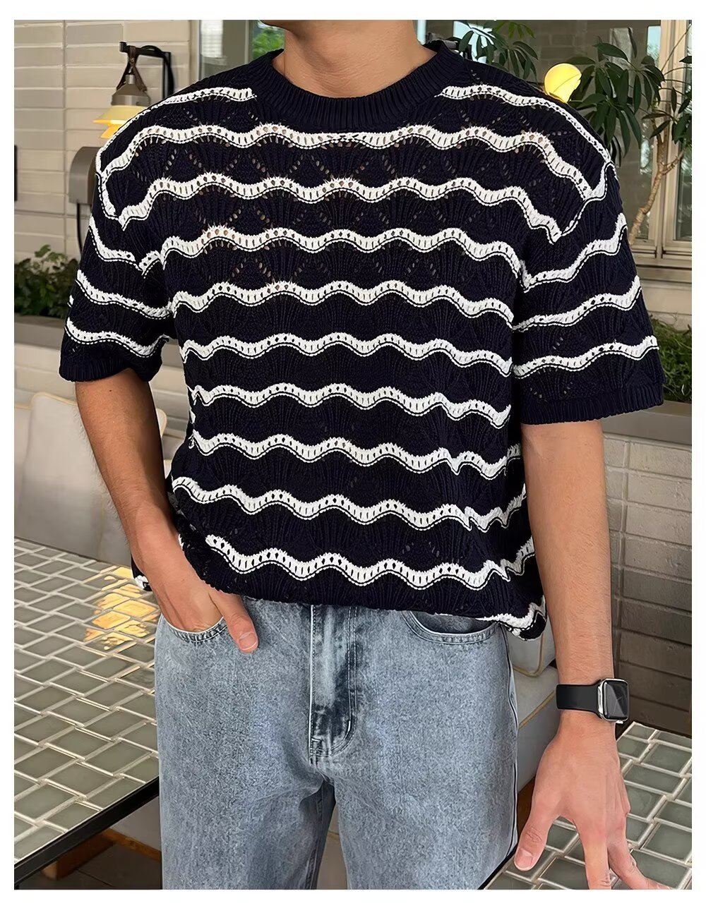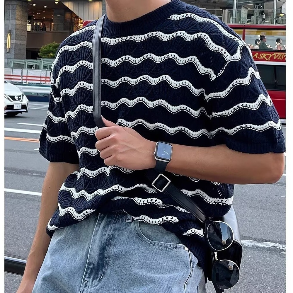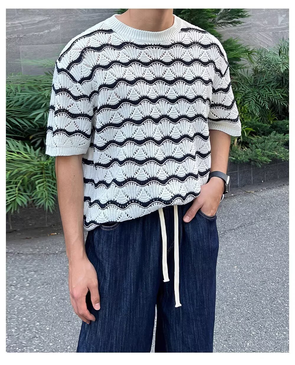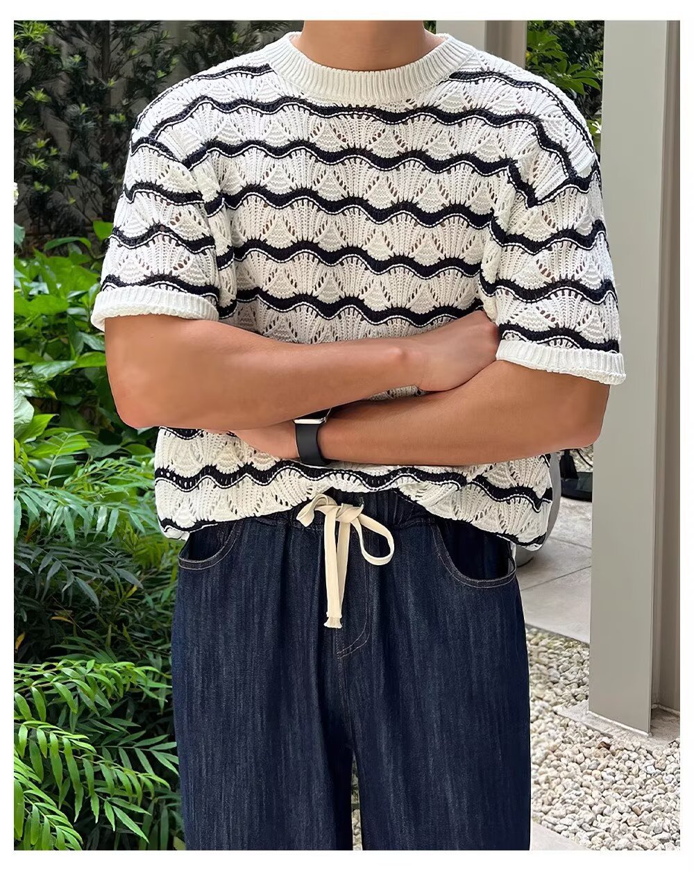 남성 티셔츠 반팔 여름 트렌디 브랜드 하이 엔드 헤비 듀티 중공 스웨터 자카드 웨이브 스트라이프 티셔츠 탑