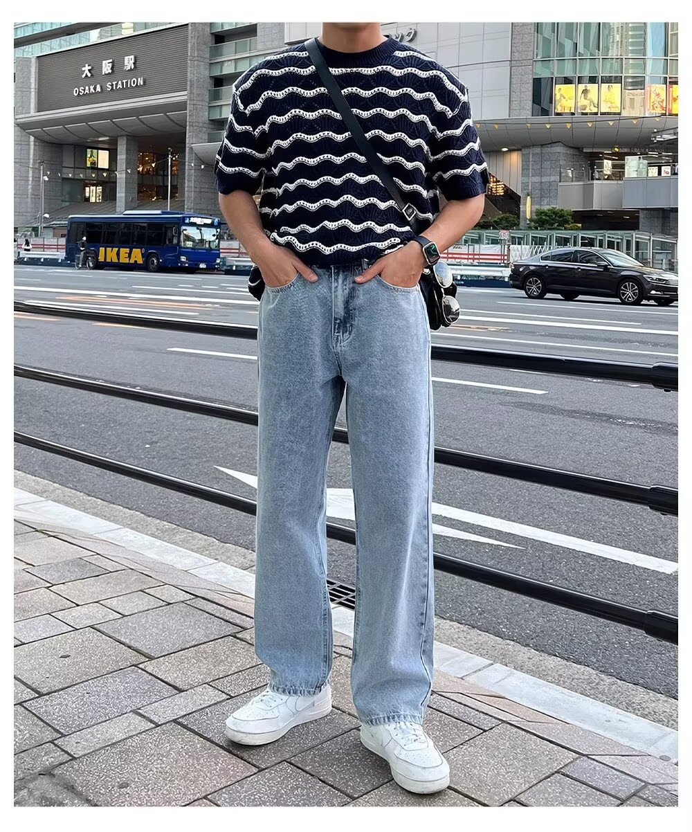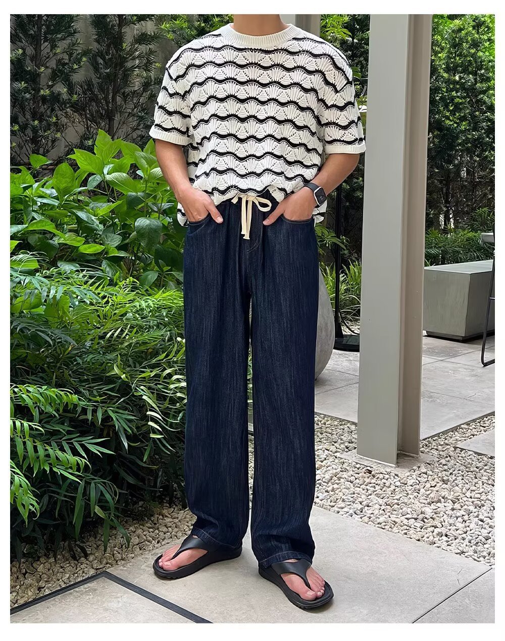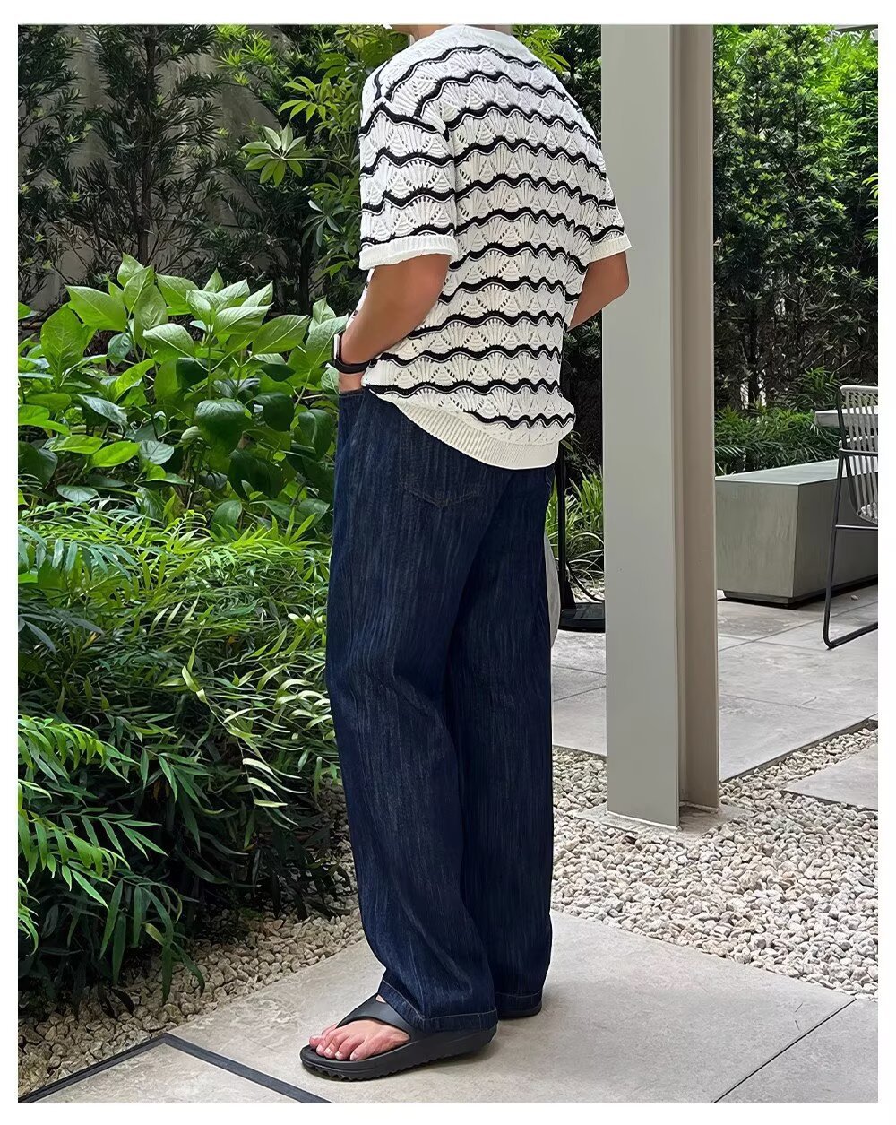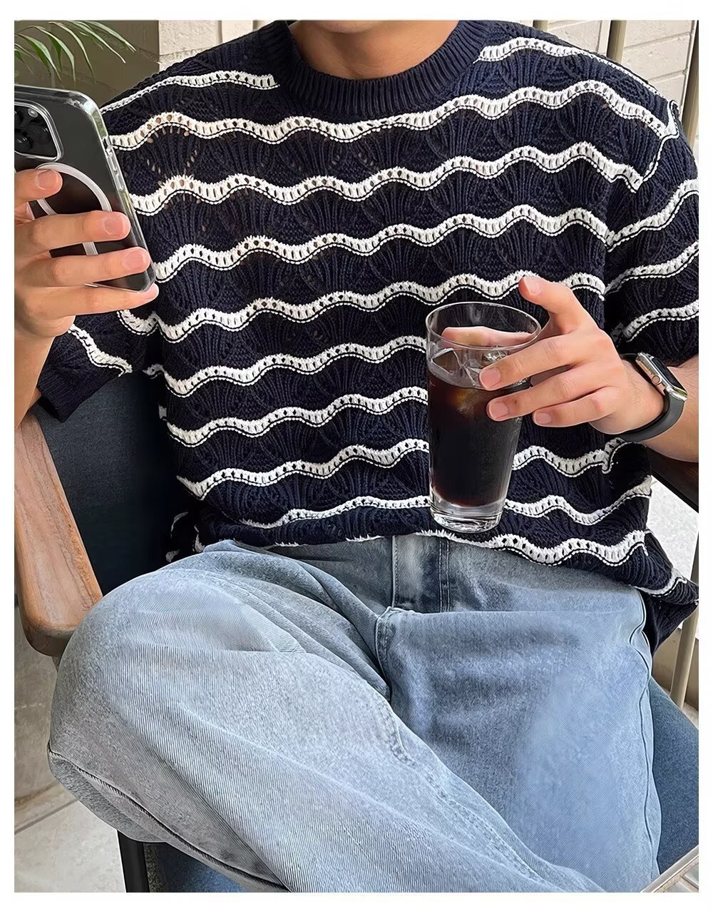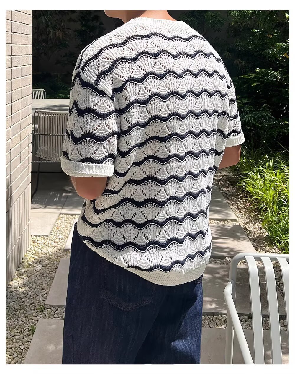남성 티셔츠 반팔 여름 트렌디 브랜드 하이 엔드 헤비 듀티 중공 스웨터 자카드 웨이브 스트라이프 티셔츠 탑