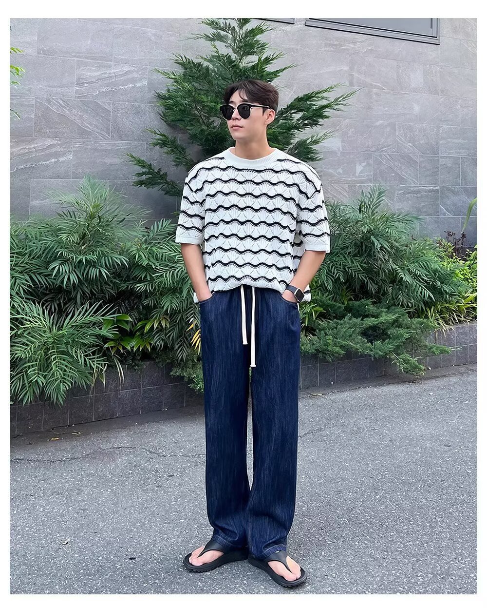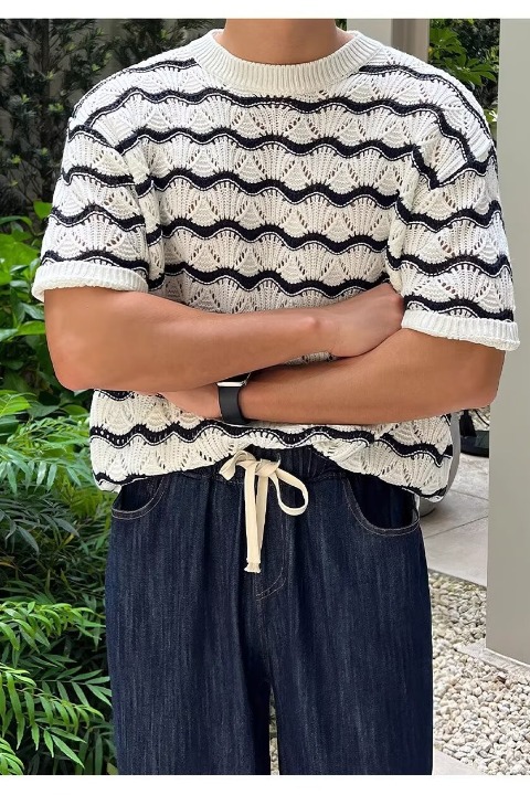 남성 티셔츠 반팔 여름 트렌디 브랜드 하이 엔드 헤비 듀티 중공 스웨터 자카드 웨이브 스트라이프 티셔츠 탑스토어 가기