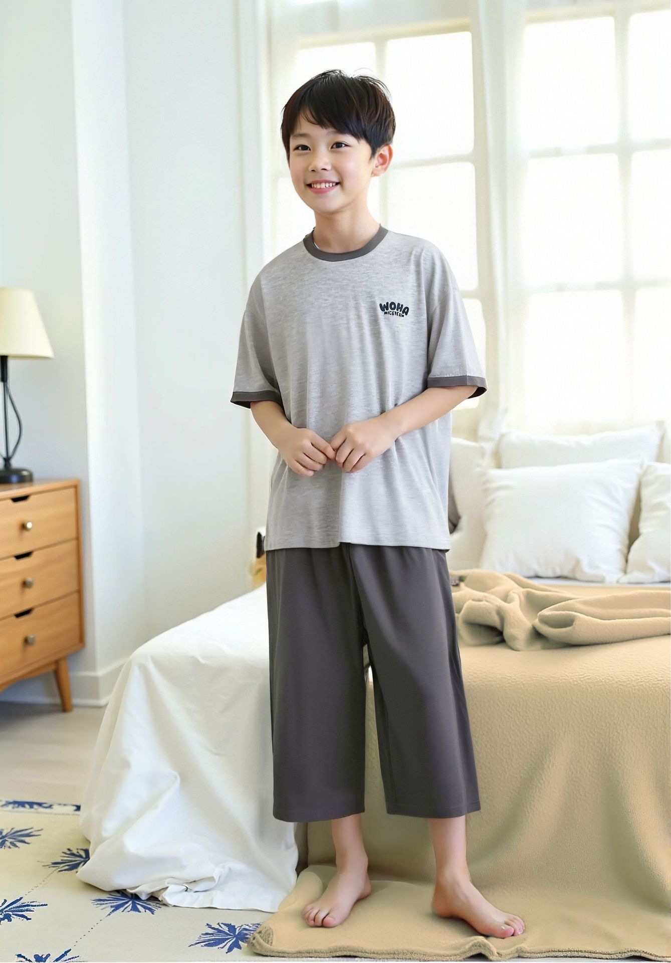 • 밝은 회색 옷과 짙은 회색 바지 세트